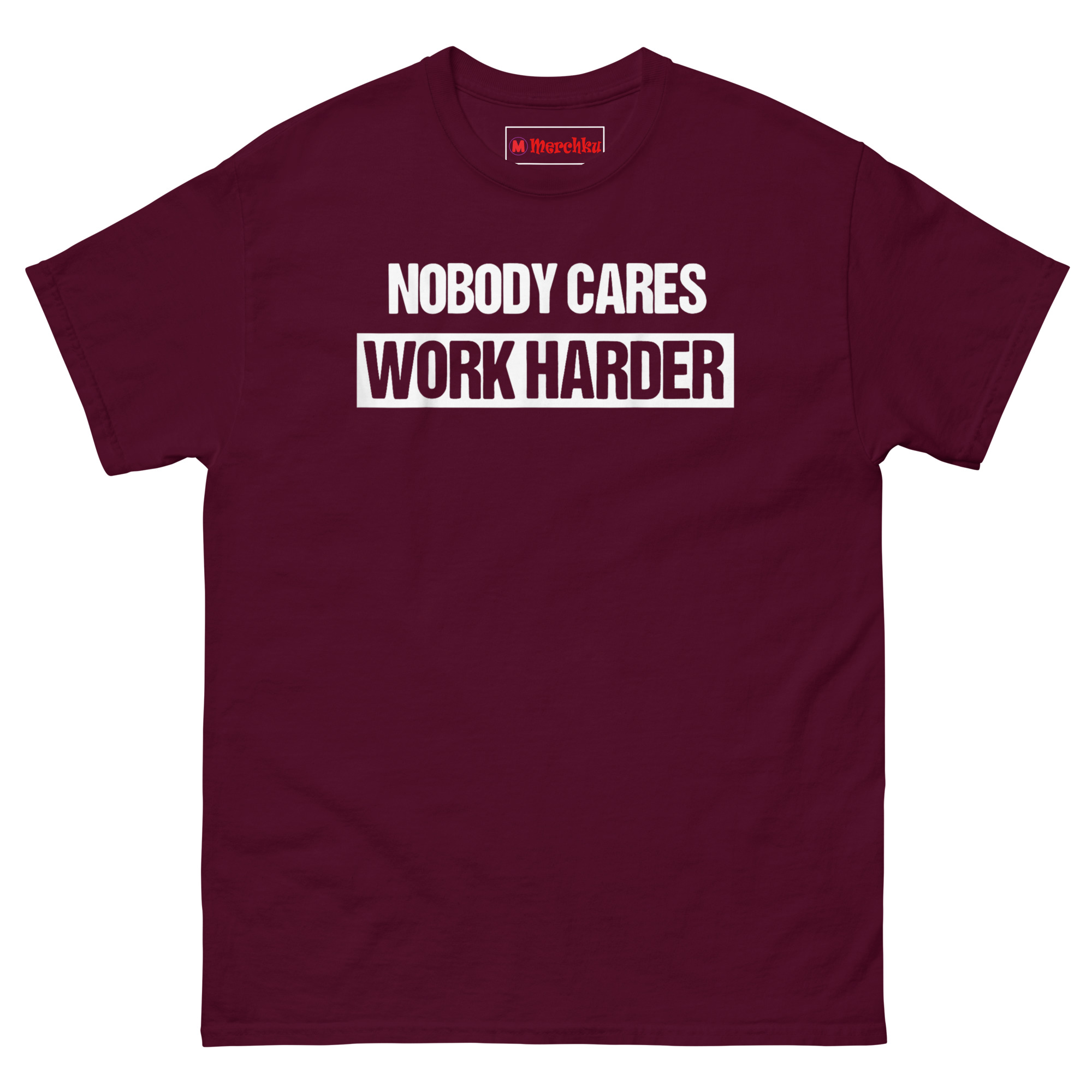 The Nobody Cares Work Harder Shirt strips away excuses and leaves only the truth. Made from 100% cotton, this minimalist streetwear piece delivers a two-line message: “NOBODY CARES” in white, followed by “WORK HARDER” inside a bold white box. It’s designed for the entrepreneur mindset, the endurance athlete, or anyone who values discipline over sympathy. No participation trophies here. Just a comfortable shirt that reminds you to keep going.