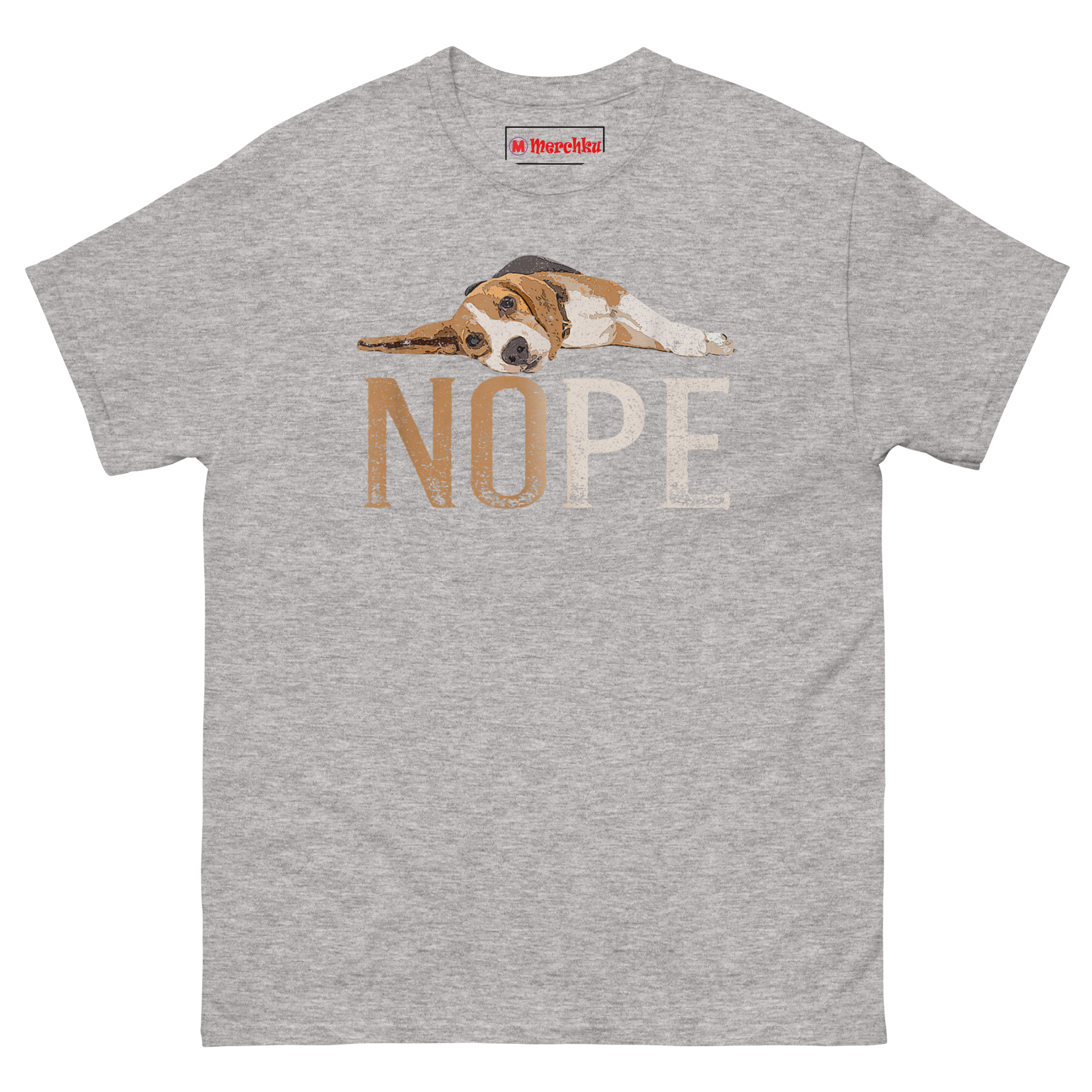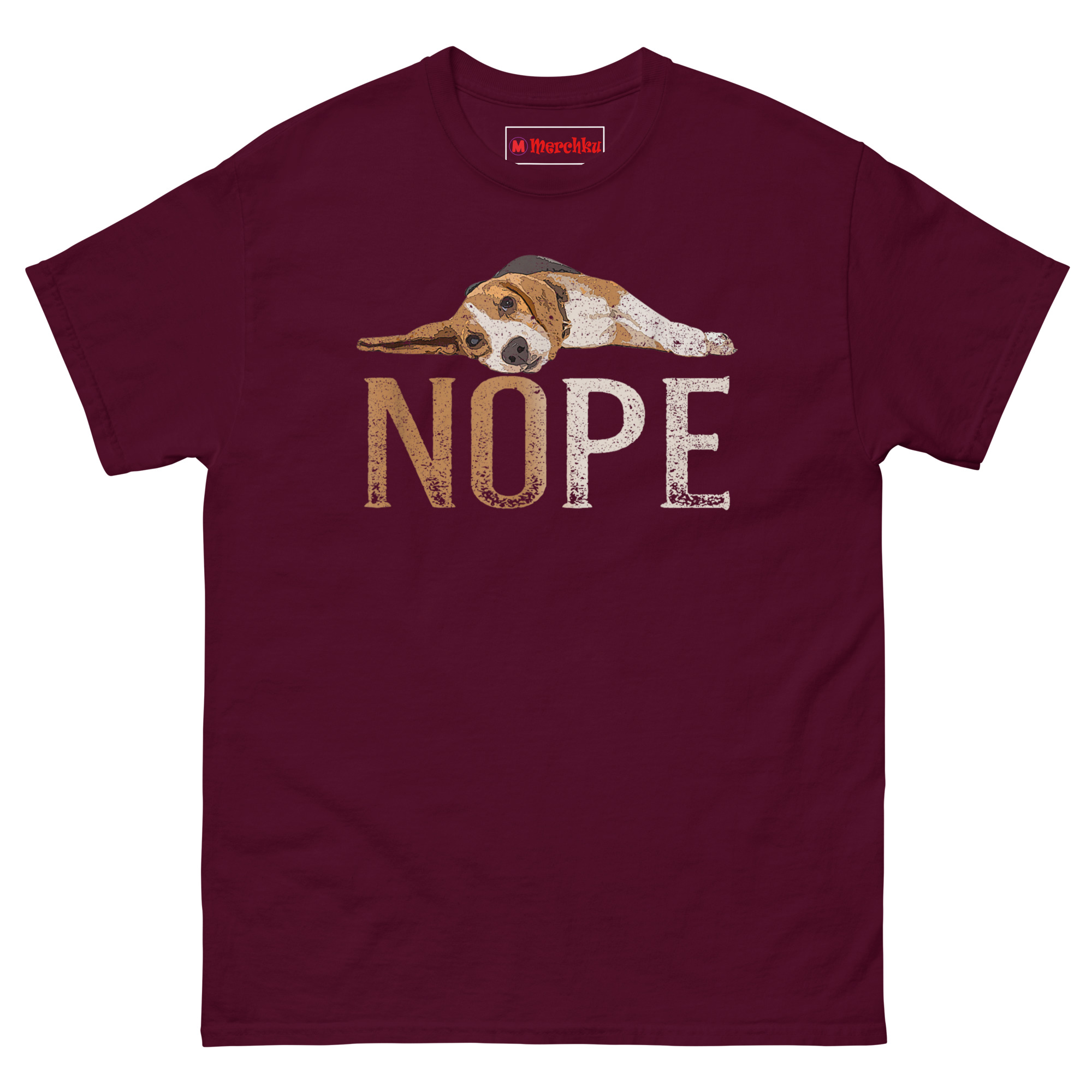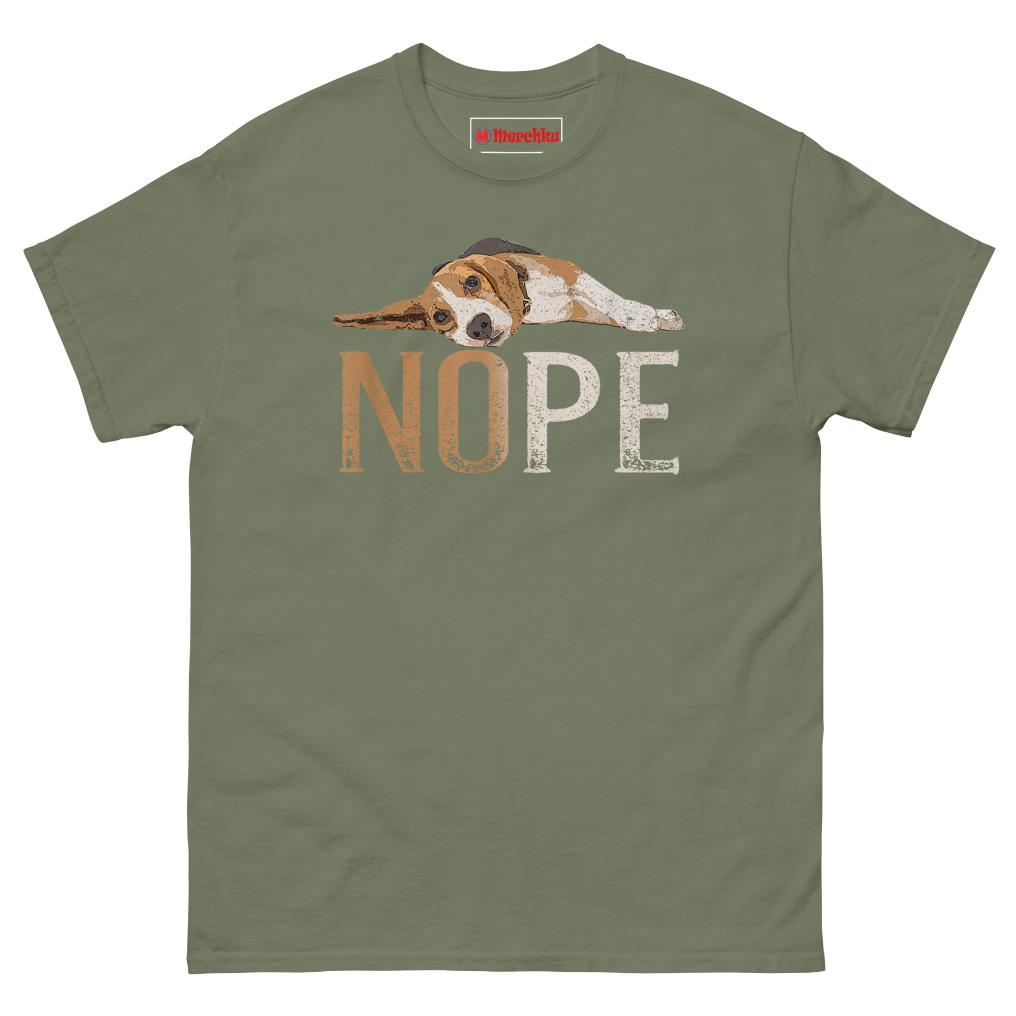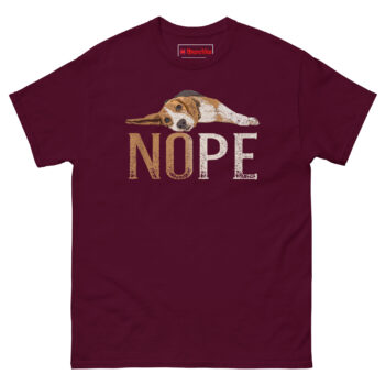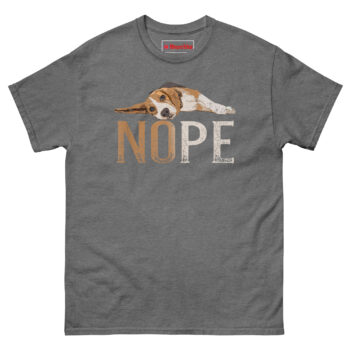 This shirt captures the exact moment a Beagle decides the walk is over. The Nope Lazy Beagle T Shirt features a realistic illustration of a tri-color Beagle lying flat on its belly in the classic “sploot” position, paired with the bold, distressed word “NOPE” in earthy tan and off-white tones. It is designed for Beagle owners, stubborn dog enthusiasts, and anyone who has ever tried to convince a scent hound to do something it does not want to do.