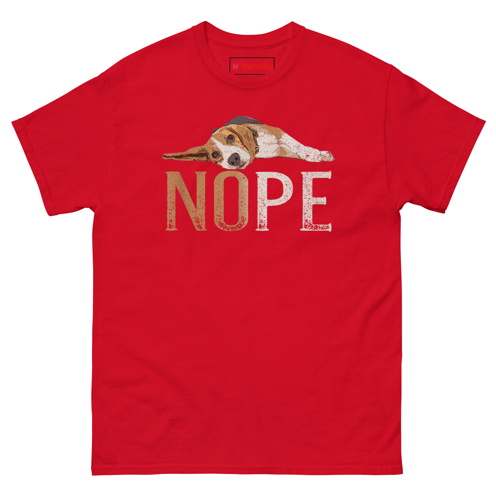- Authentic, Detailed Illustration: The sploot position is rendered with care. The spread ears, the heavy head, the flat belly—it is exactly what a Beagle looks like when it decides it is done. The distressed, two-tone “NOPE” adds to the vintage, laid-back feel of the design.