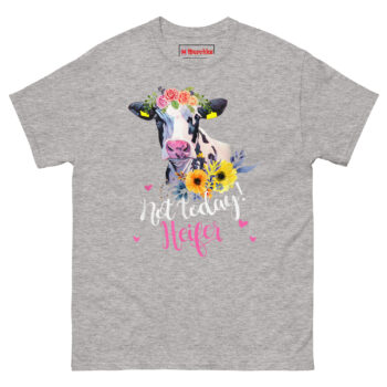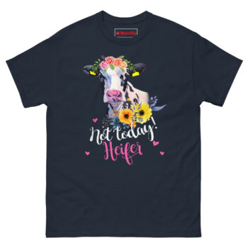 That energy became the foundation for this design. The Holstein cow gazes forward with calm confidence, wearing an ornate floral crown that would be ridiculous on any real cow but looks absolutely perfect here. Pink roses, peach ranunculus, and lush green foliage cascade across her head like she’s royalty at a garden party, because she is. Below, sunflowers and purple wildflowers add rustic color. The text plays with contrast: elegant white script for “Not today!” and bold hot-pink serif for “Heifer,” accented by floating pink hearts. It’s The Floral Boundary made visible, soft and beautiful on the outside, firm and unapologetic on the inside. Not Today Heifer T Shirt cool for any woman who’s ever had to shut something down with a smile.