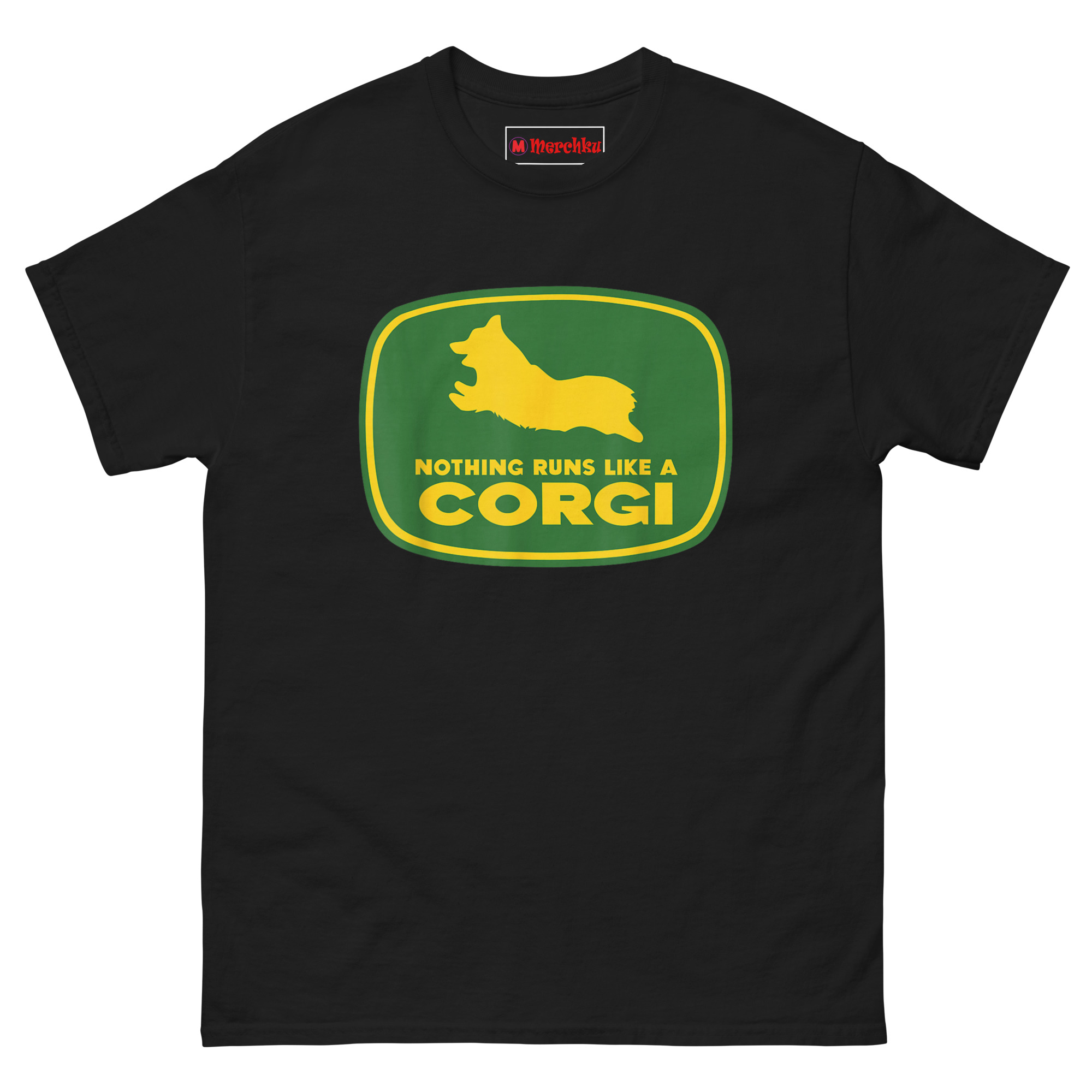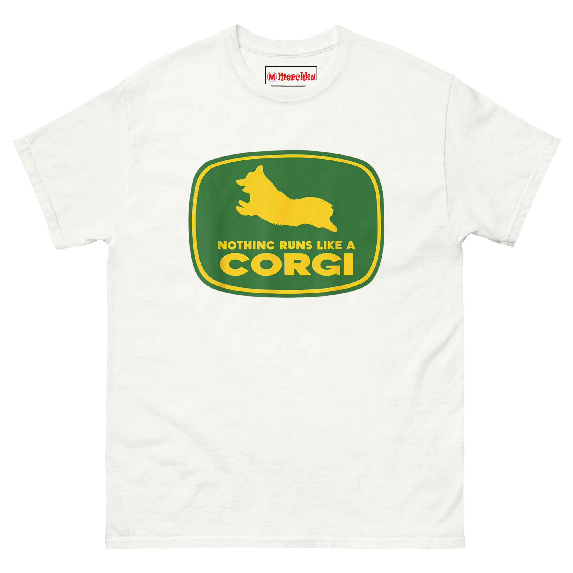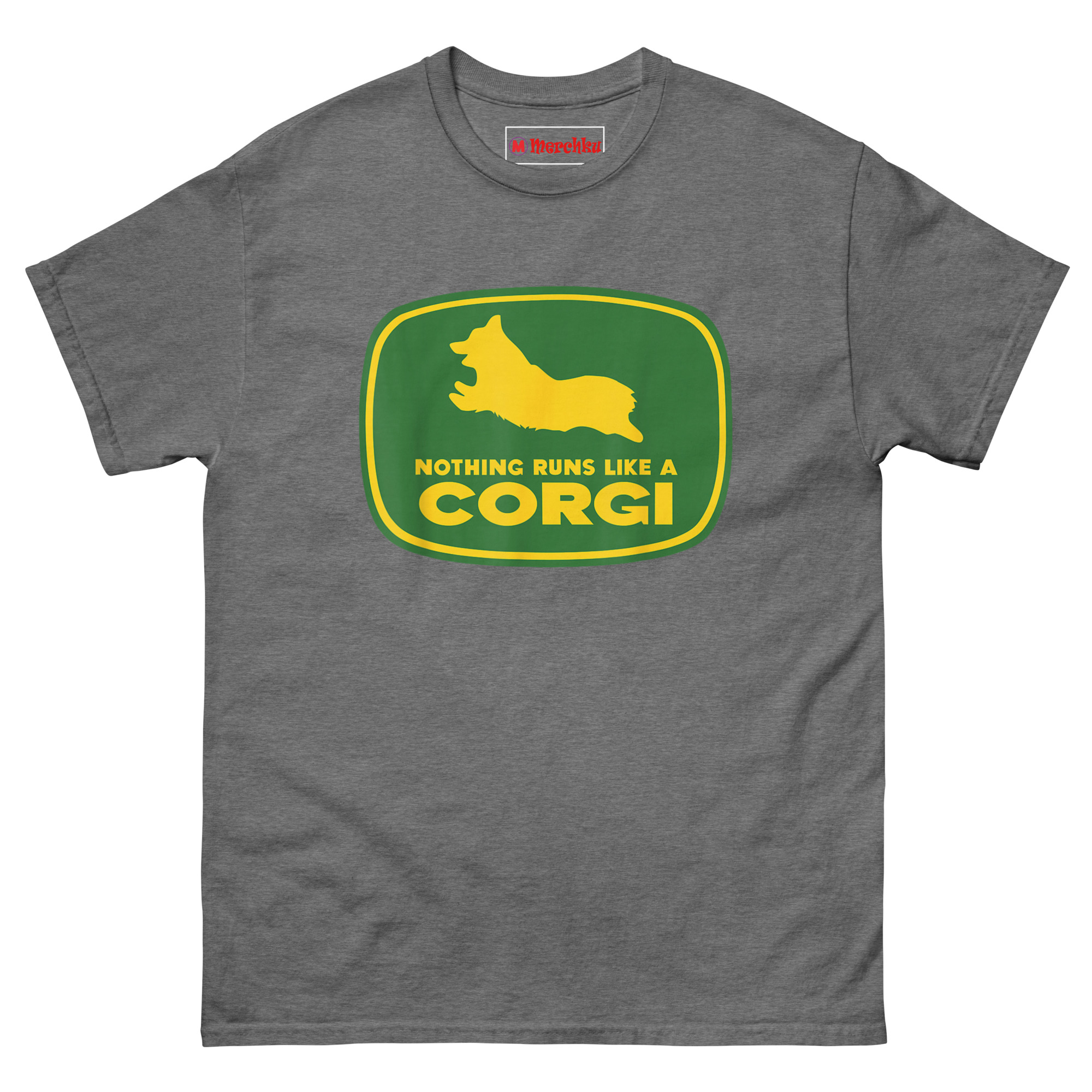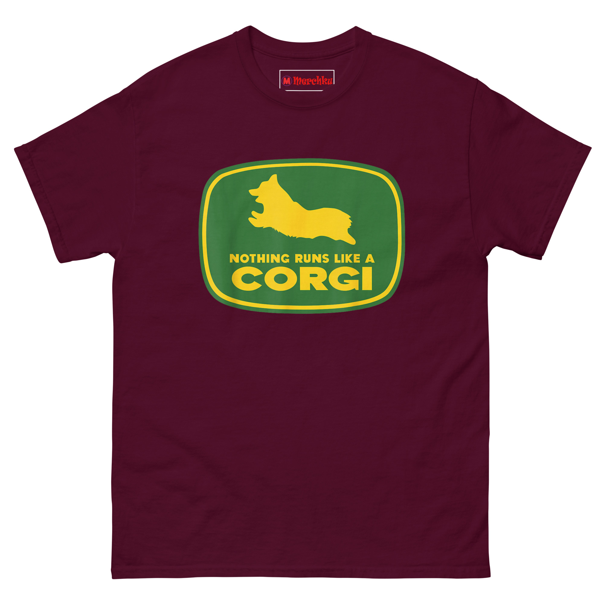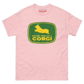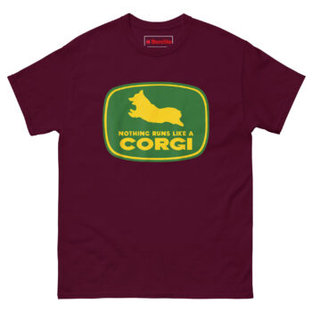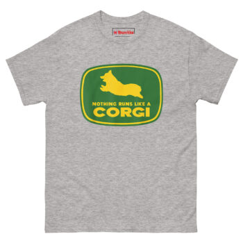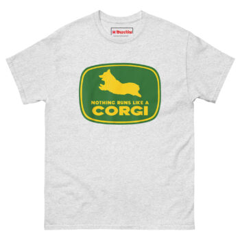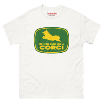 Nothing Runs Like A Corgi T Shirt idea came from watching a Corgi herd livestock at a small farm. Despite those short legs, the dog moved with surprising speed and purpose, nothing ran quite like that Corgi. The connection to agricultural machinery felt inevitable. Corgis were originally bred as herding dogs on farms across Wales. They worked cattle and sheep using their low profiles to avoid kicks. Putting one inside that famous green and yellow badge honors that history while delivering a laugh. The leaping silhouette captures the breed’s distinctive shape, those short legs, the lack of tail, the perky ears frozen mid-stride. Below it, the familiar font arrangement reads “NOTHING RUNS LIKE A” stacked above massive bold “CORGI.” It replaces heavy machinery with compact canine energy. This is farming logo spoof apparel for anyone who appreciates that the best equipment on a farm sometimes has four legs and a wagging tail.