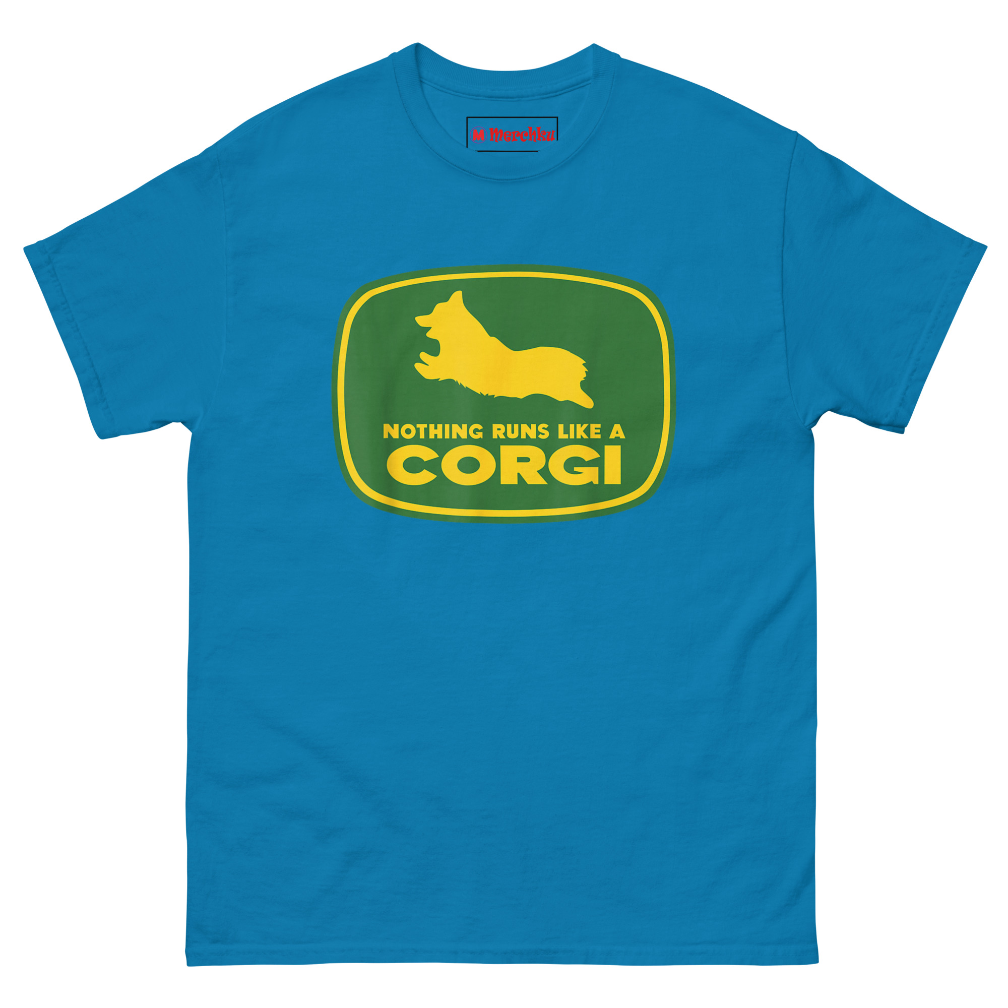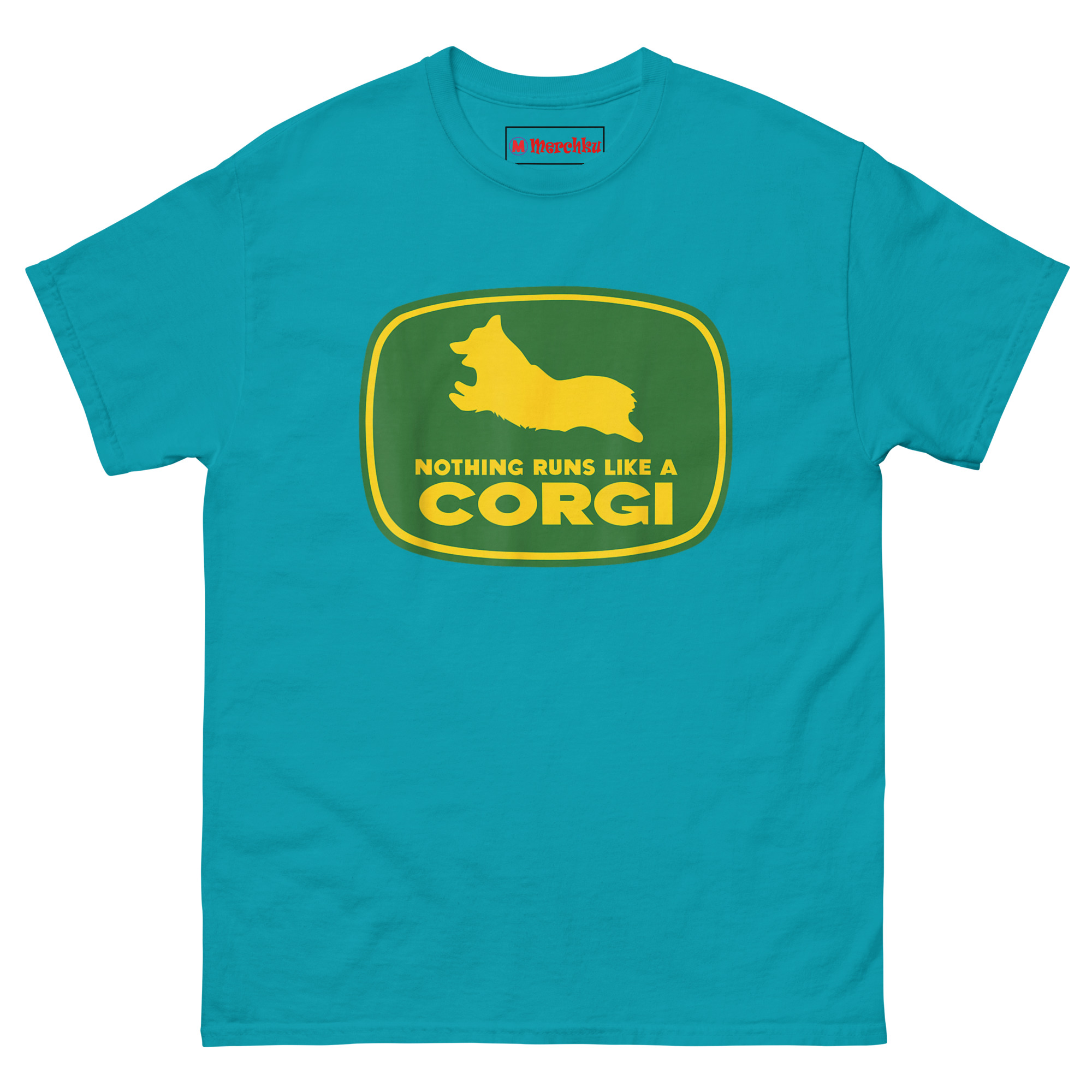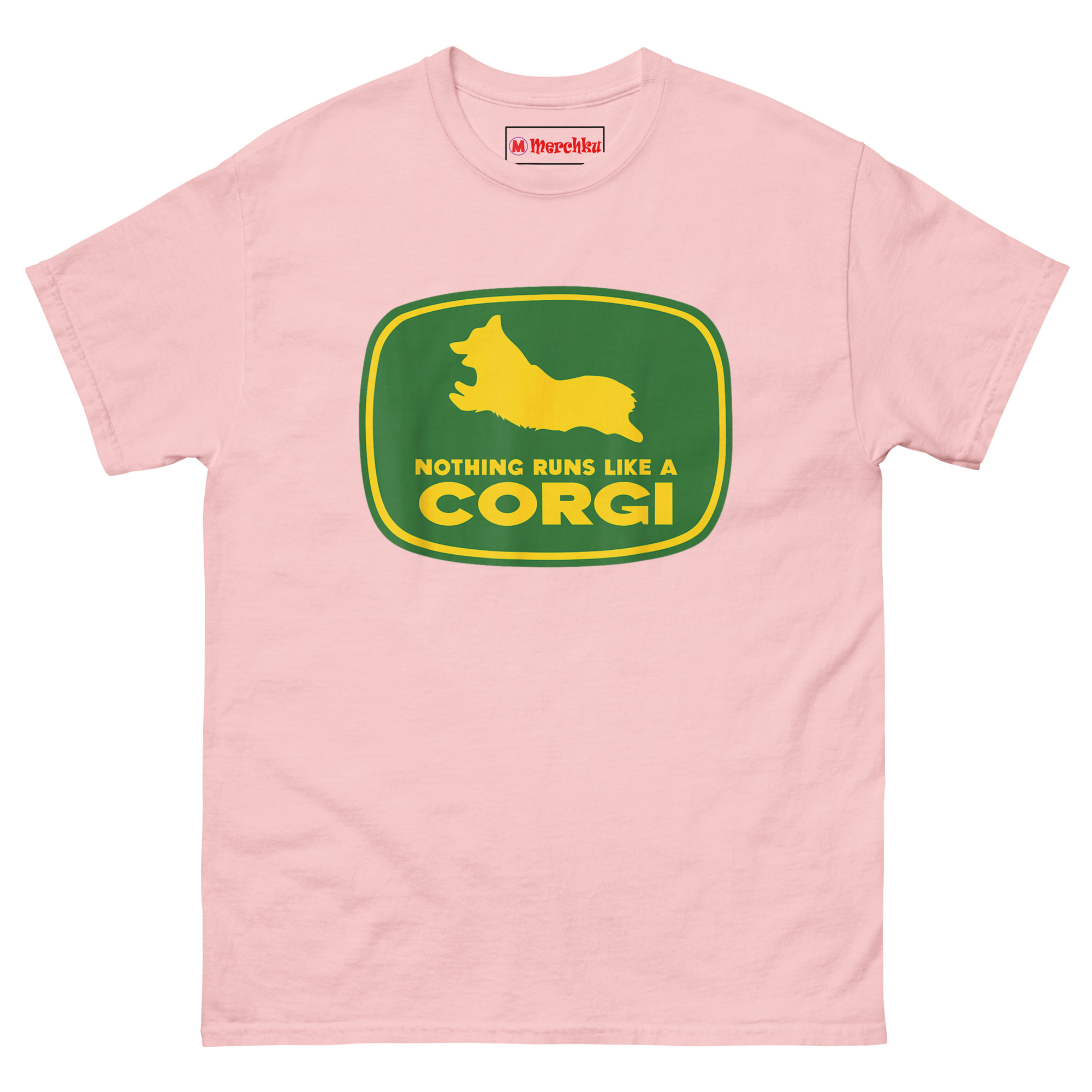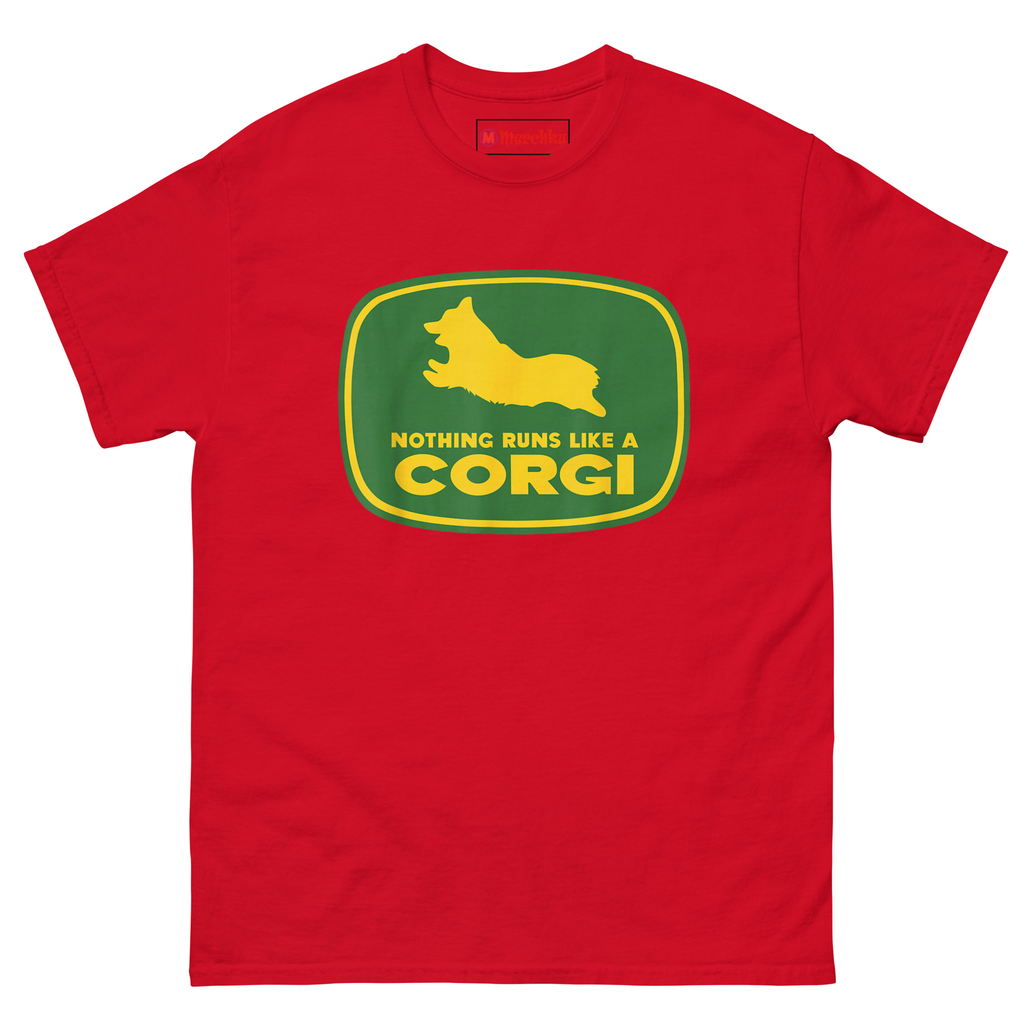 Nothing Runs Like A Corgi T Shirt idea came from watching a Corgi herd livestock at a small farm. Despite those short legs, the dog moved with surprising speed and purpose, nothing ran quite like that Corgi. The connection to agricultural machinery felt inevitable. Corgis were originally bred as herding dogs on farms across Wales. They worked cattle and sheep using their low profiles to avoid kicks. Putting one inside that famous green and yellow badge honors that history while delivering a laugh. The leaping silhouette captures the breed’s distinctive shape, those short legs, the lack of tail, the perky ears frozen mid-stride. Below it, the familiar font arrangement reads “NOTHING RUNS LIKE A” stacked above massive bold “CORGI.” It replaces heavy machinery with compact canine energy. This is farming logo spoof apparel for anyone who appreciates that the best equipment on a farm sometimes has four legs and a wagging tail.