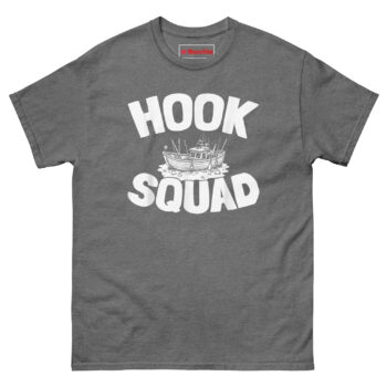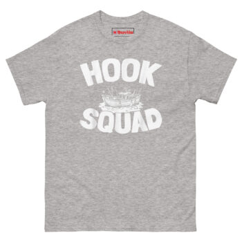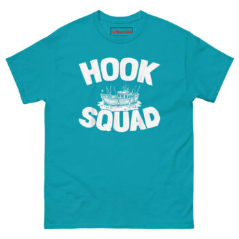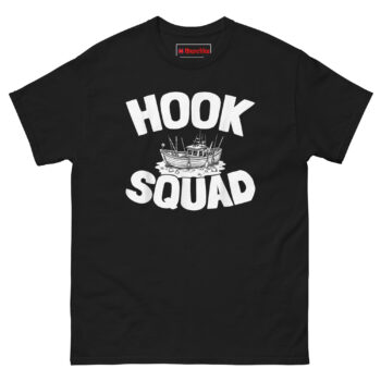 We realized that offshore fishing is built on something bigger than individual skill. It is about timing, communication, and trust. The boat graphic on this shirt represents that shared experience. It is not just a vessel. It is the place where stories get made, where lines get set, and where the crew becomes family. The bold “HOOK SQUAD” lettering frames the boat like a team logo because that is exactly what it is a badge of belonging for anyone who has ever worked a gaff, cleared a line, or held the wheel while the rest of the crew fought a fish.