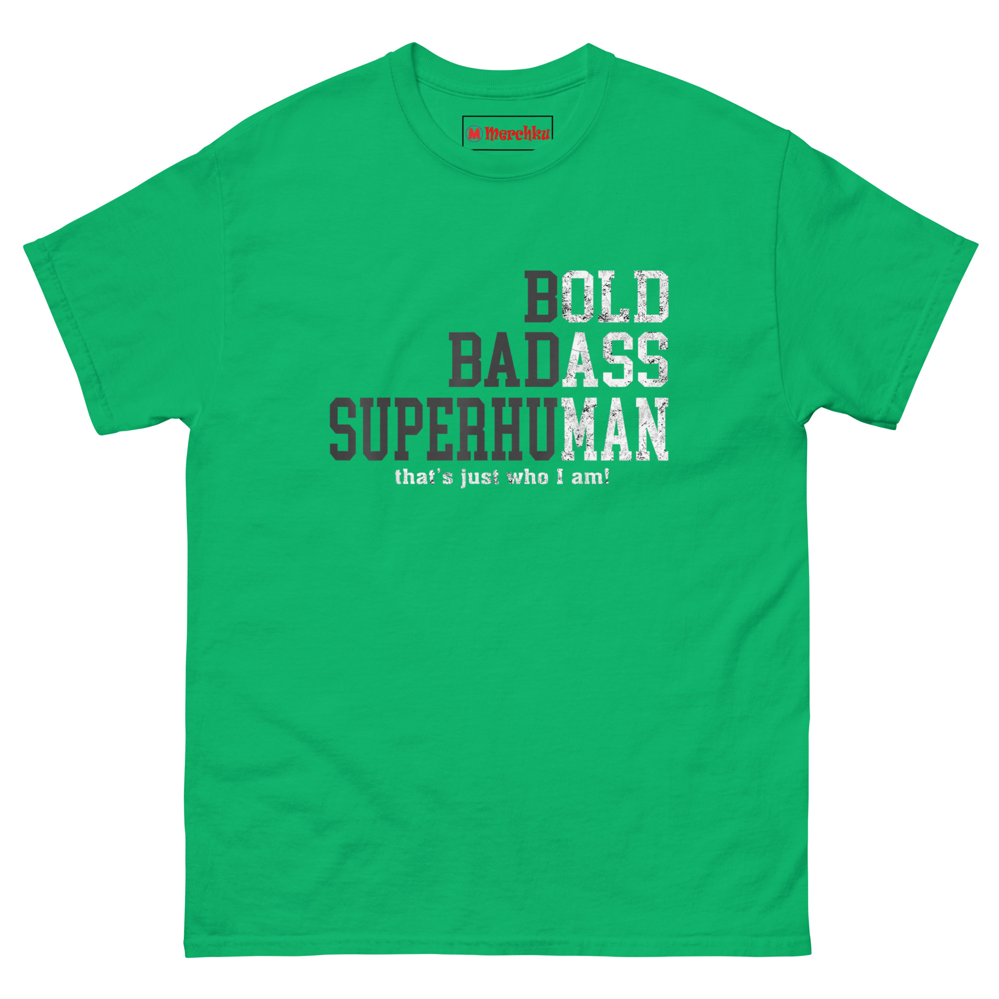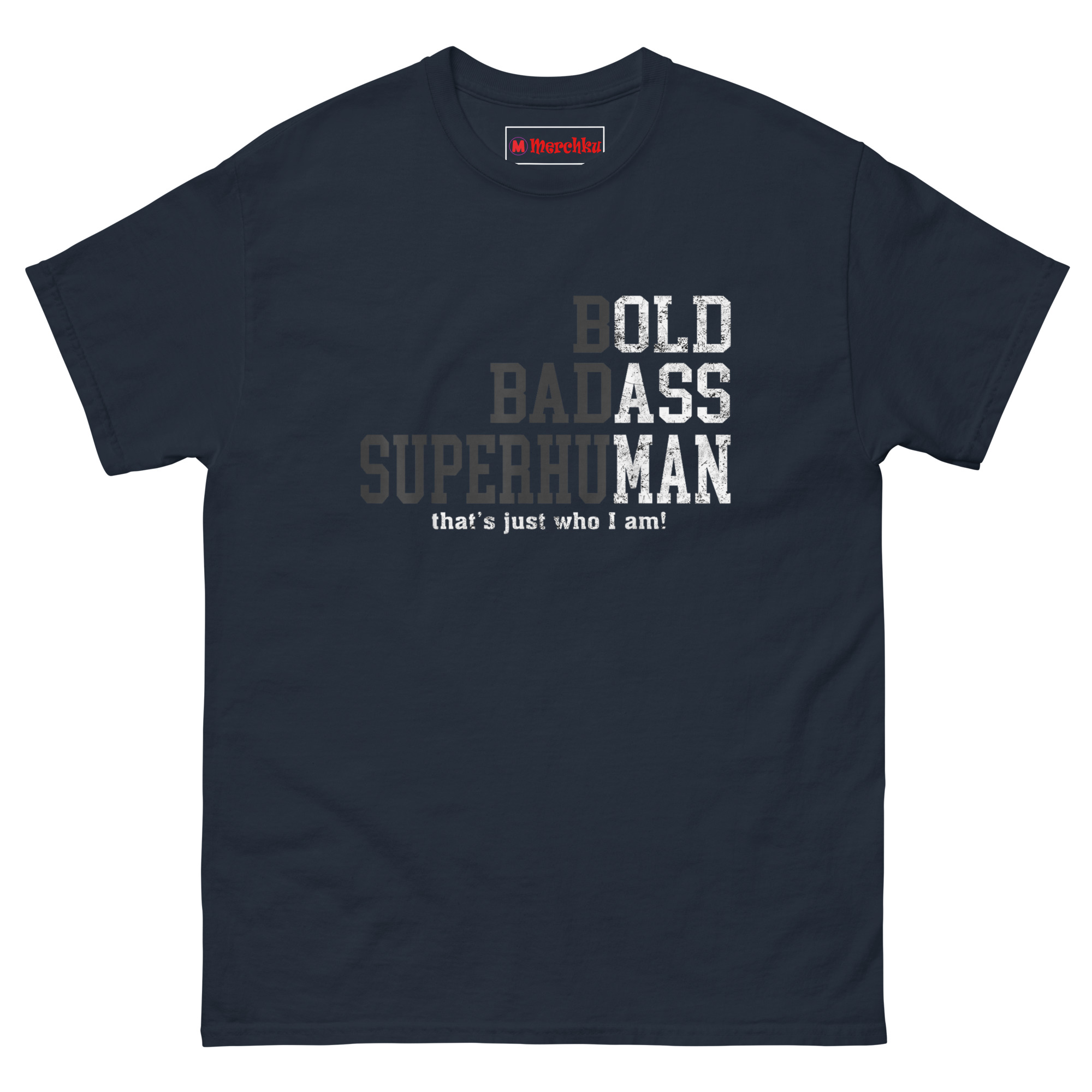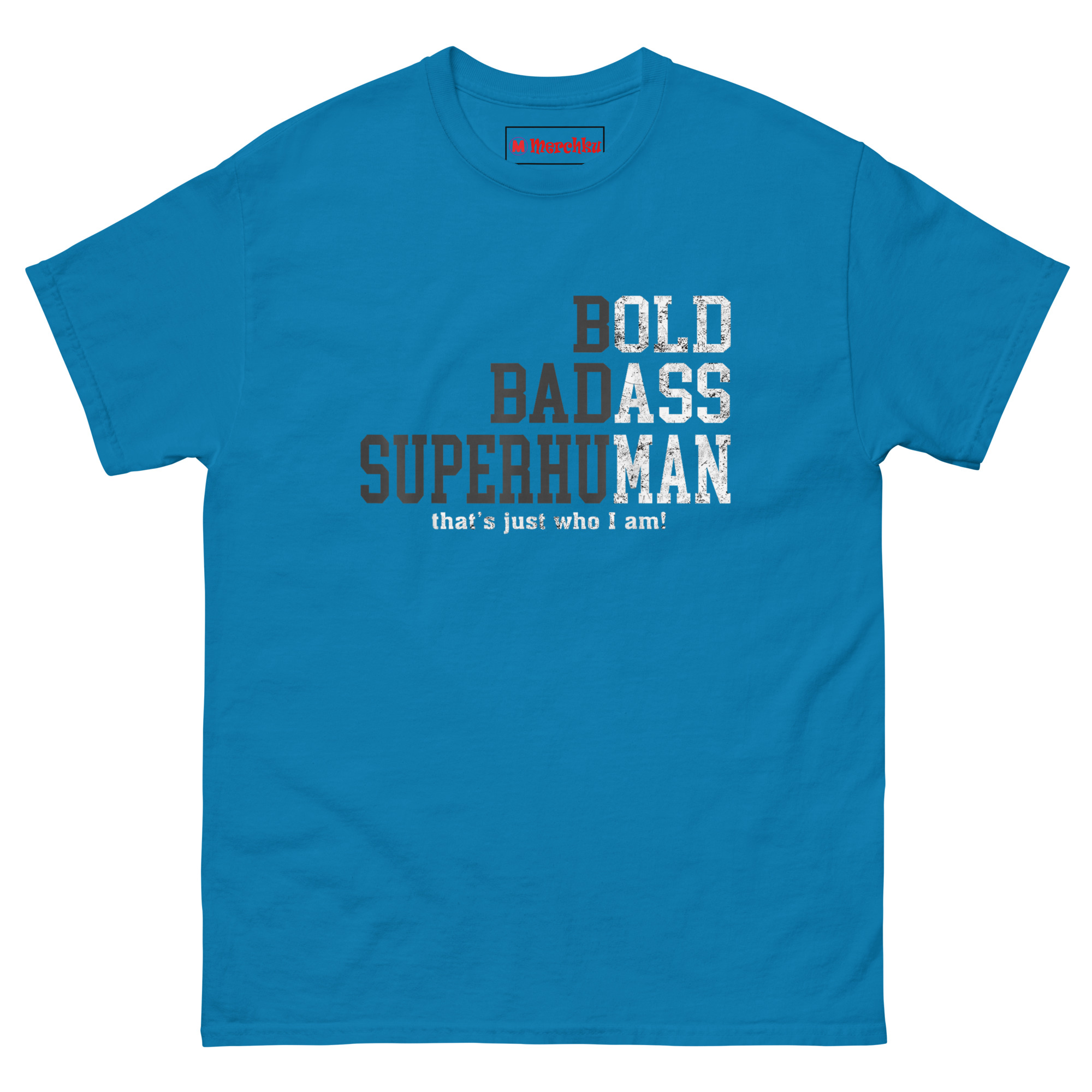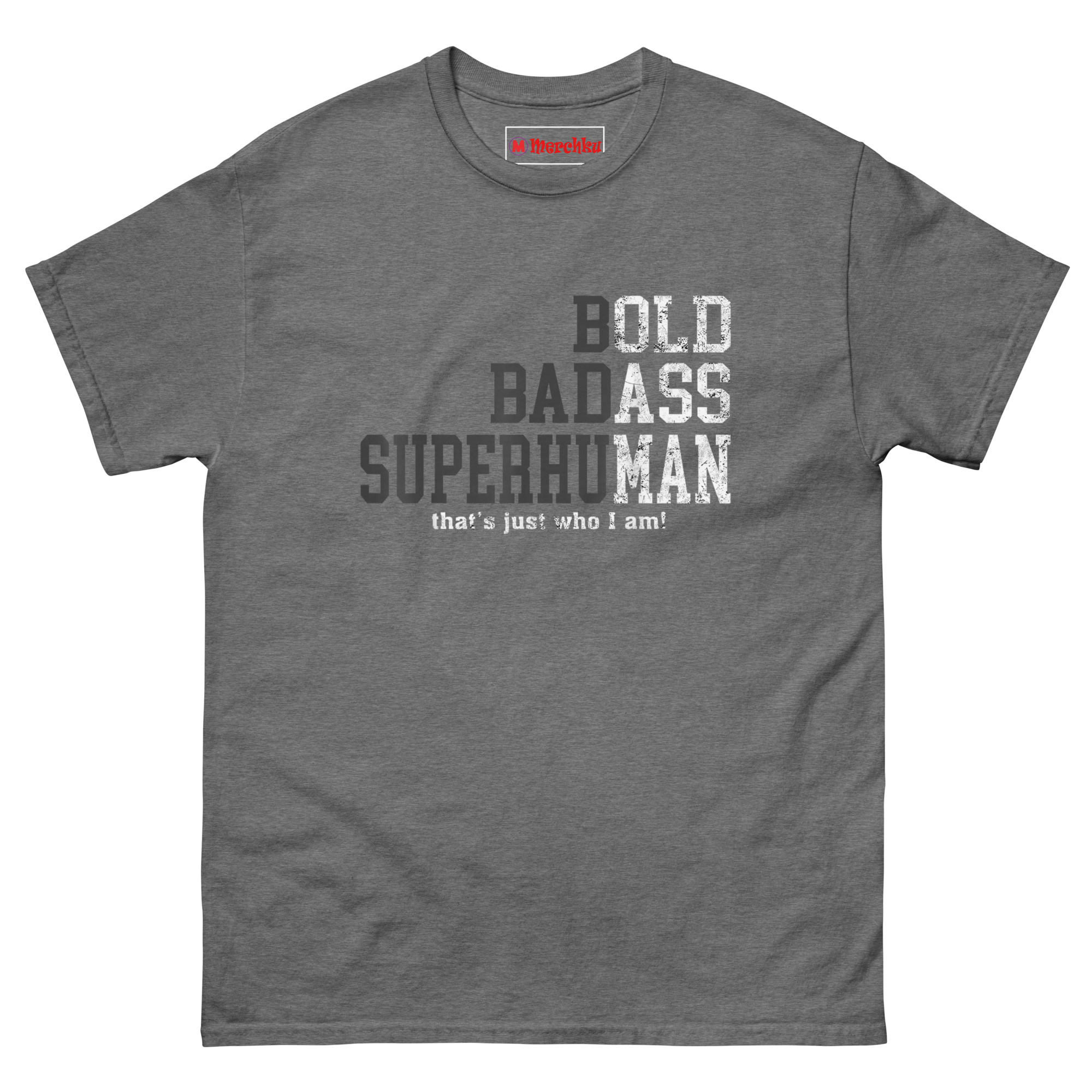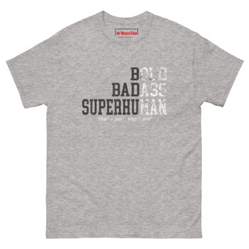 We built the design around that mindset. The staggered typography puts the focus on three words that carry weight: BOLD, BADASS, SUPERHUMAN. The distressed texture gives the letters a weathered, gritty look like something that has been through the wringer and come out stronger. The subtle “BBS” acronym running down the left side creates a badge-like feel, a quiet code for those who understand. The final line, “that’s just who I am,” adds a confident closing statement. It is not a shirt about getting old; it is a shirt about becoming legendary.