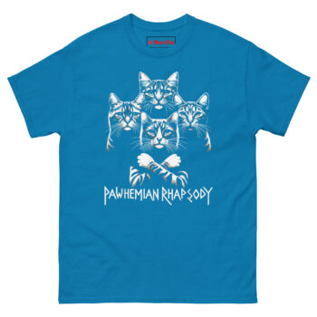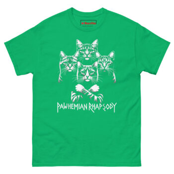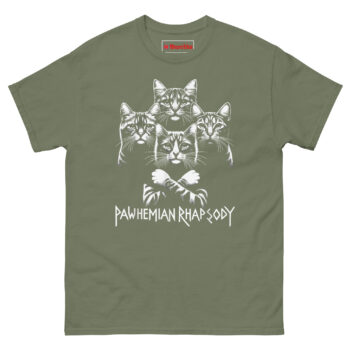 This Pawhemian Rhapsody T Shirt design started as a joke between two friends arguing about who was the bigger diva: a cat waiting for dinner or Freddie Mercury owning the stage. We realized that the iconic Queen II pose stoic, shadowy, and intense, perfectly mirrors a cat staring at an empty food bowl.