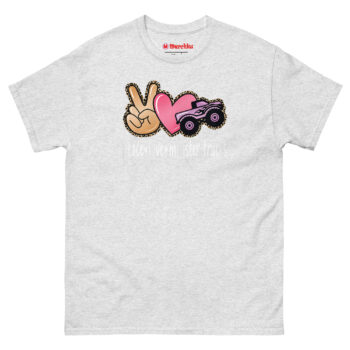 The Peace Love Monster Trucks T Shirt brings together peace signs, hearts, and a massive pink-and-purple monster truck under a shared leopard print border. It’s designed for girls and women who love the roar of engines and the thrill of mud flying but want their style to reflect who they actually are.