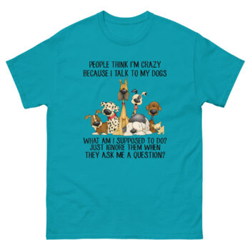 Here is a shirt that finally validates what you do every single day. The People Think I’m Crazy Because I Talk to My Dogs T Shirt is a comfortable, 100% cotton classic tee designed for pet owners who treat their furry friends like actual family members. It stands out because it combines a witty, self-aware statement with a detailed illustration of a multi-breed dog pack, making it clear you are in on the joke. Whether you are a multi-dog parent or just someone who holds full conversations with a single pup, this shirt is built for those who know their dogs are great listeners.