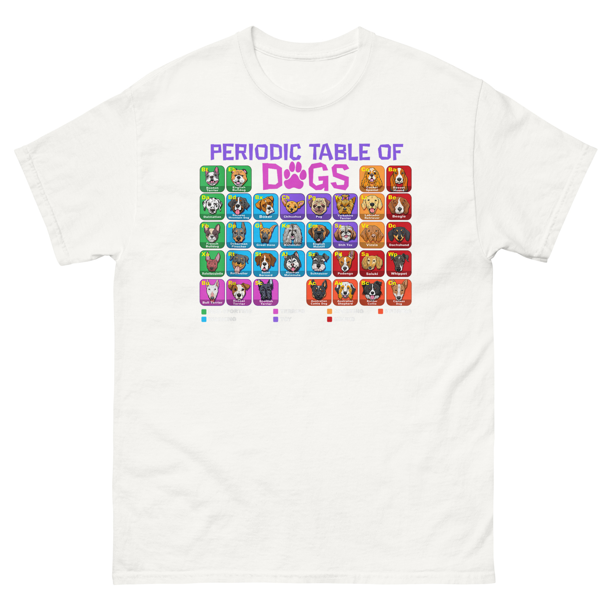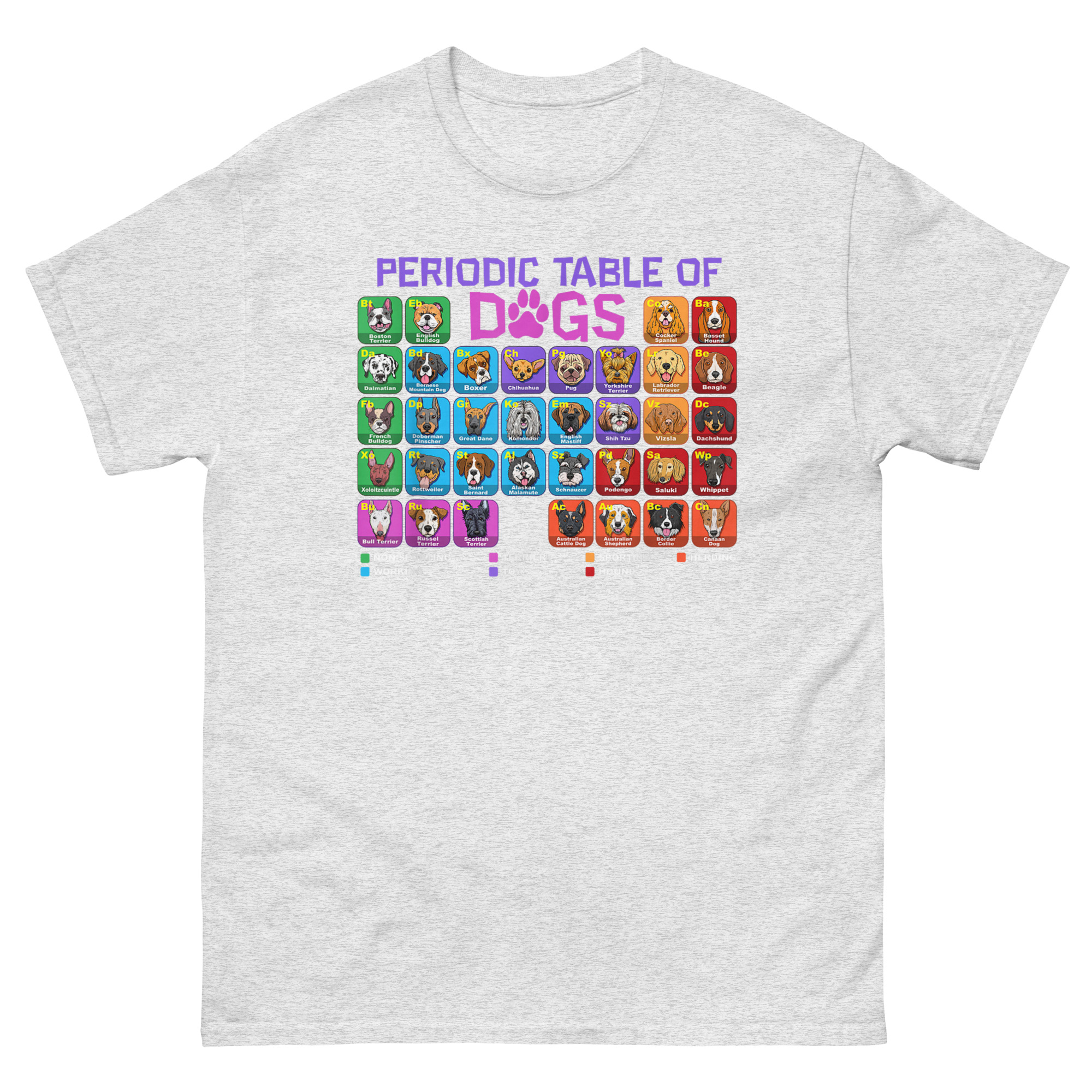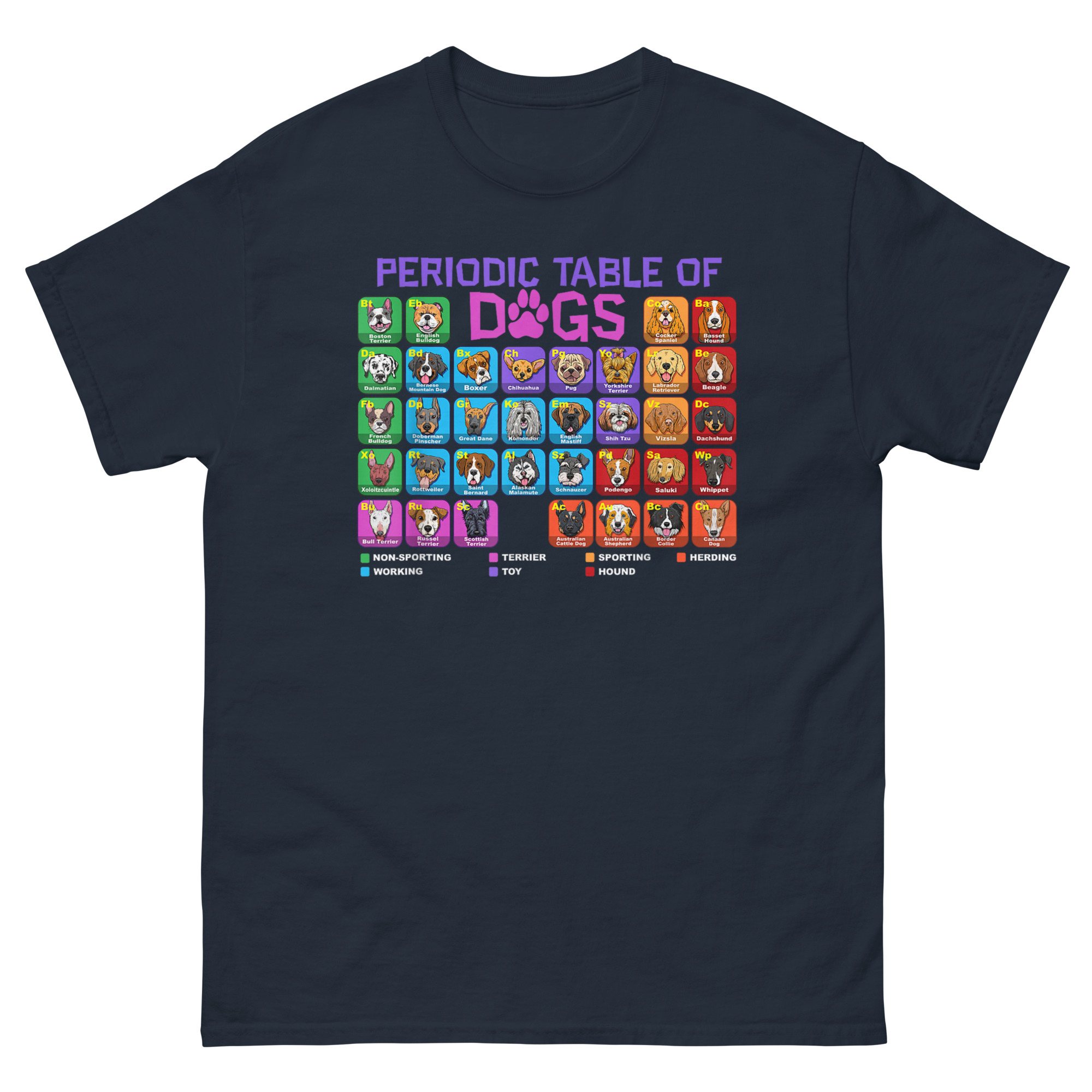 This Periodic Table of Dogs T Shirt started with a simple question: what if we organized dogs like elements? After all, they have their own groups, Herding, Hound, Sporting, Working, Terrier, Toy, Non-Sporting. They have their own unique properties. And just like elements, combining them creates something entirely new. The result is a full periodic table featuring over 60 breed illustrations, each with a two-letter “atomic symbol” (like “Eb” for English Bulldog or “Ch” for Chihuahua). The grid is color-coded by breed group, and a clear legend at the bottom explains the classification system. The word “DOGS” in the title even swaps the “O” for a paw print, blending scientific structure with pure canine joy. It’s the perfect marriage of left-brain logic and right-brain puppy love.