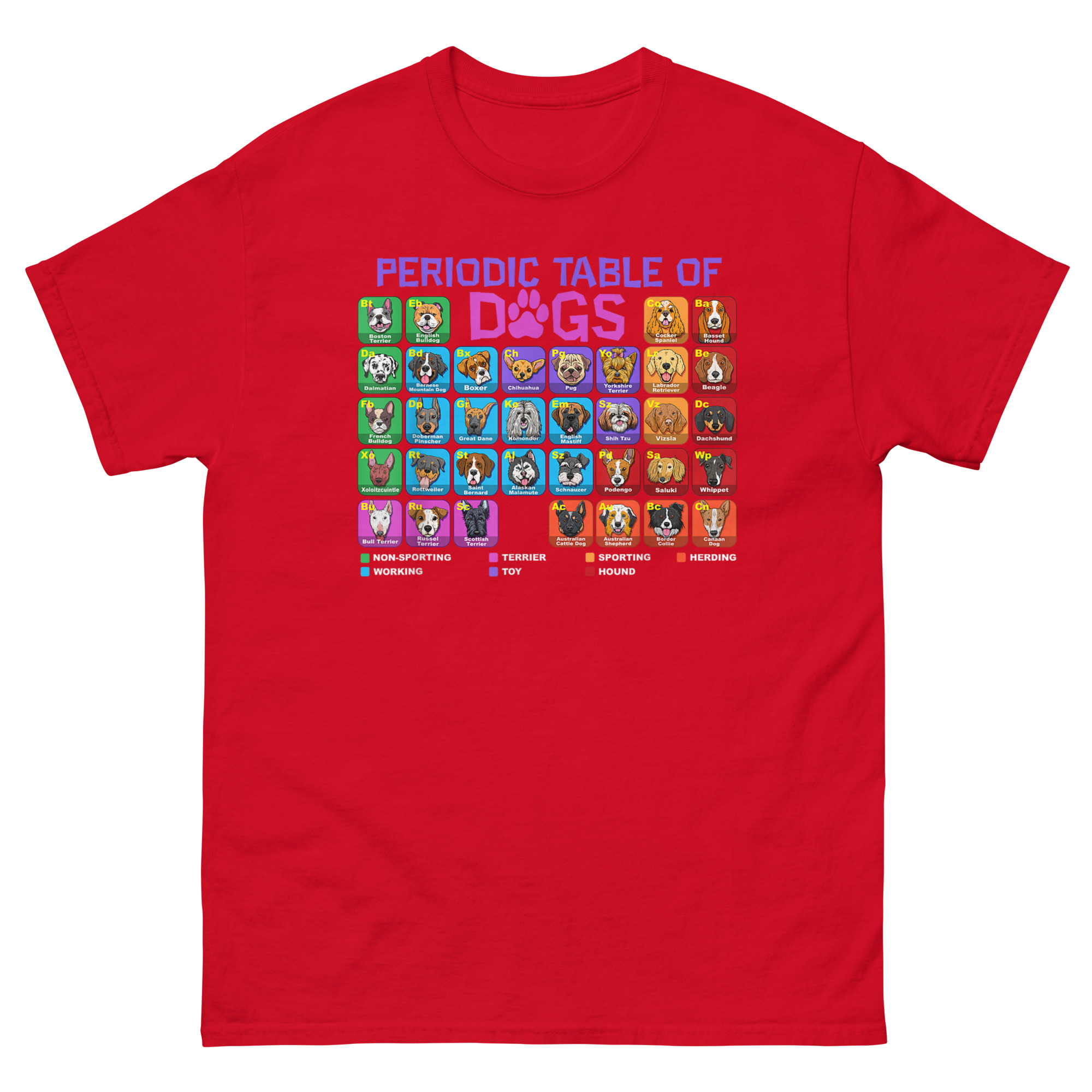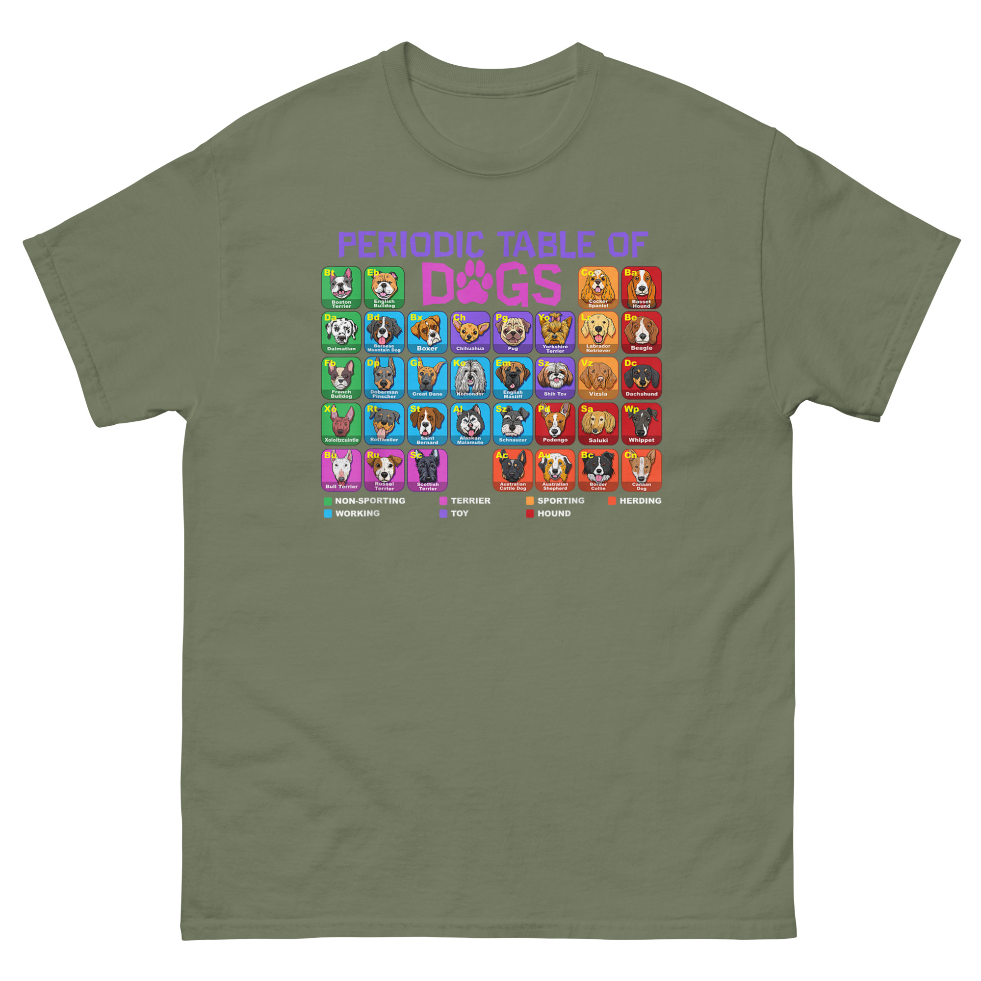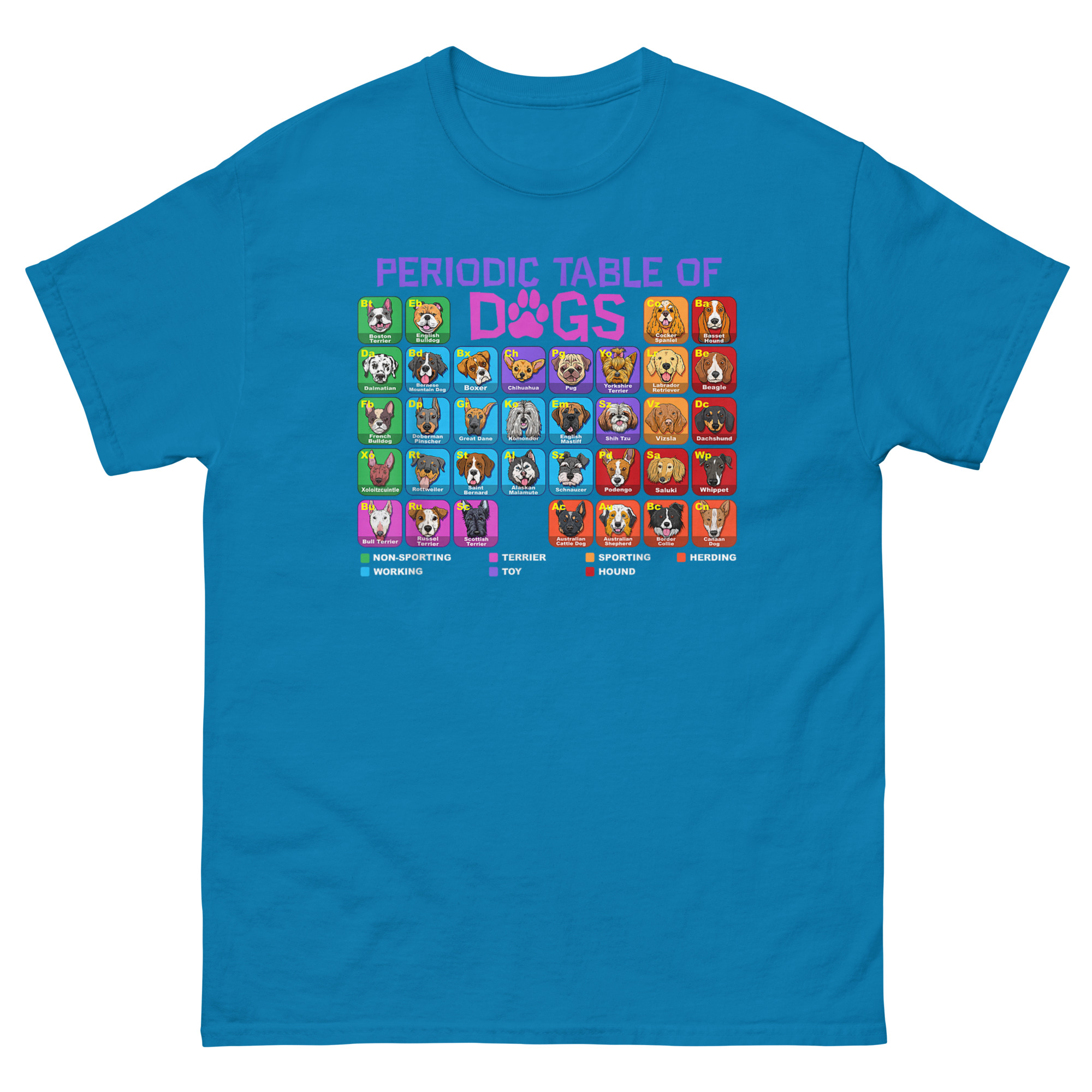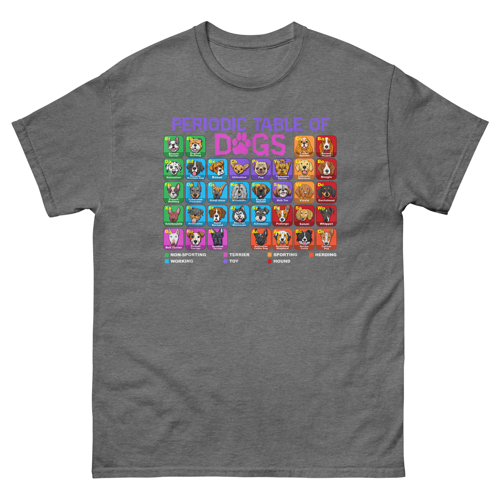 This Periodic Table of Dogs T Shirt started with a simple question: what if we organized dogs like elements? After all, they have their own groups, Herding, Hound, Sporting, Working, Terrier, Toy, Non-Sporting. They have their own unique properties. And just like elements, combining them creates something entirely new. The result is a full periodic table featuring over 60 breed illustrations, each with a two-letter “atomic symbol” (like “Eb” for English Bulldog or “Ch” for Chihuahua). The grid is color-coded by breed group, and a clear legend at the bottom explains the classification system. The word “DOGS” in the title even swaps the “O” for a paw print, blending scientific structure with pure canine joy. It’s the perfect marriage of left-brain logic and right-brain puppy love.