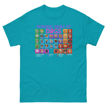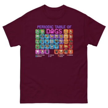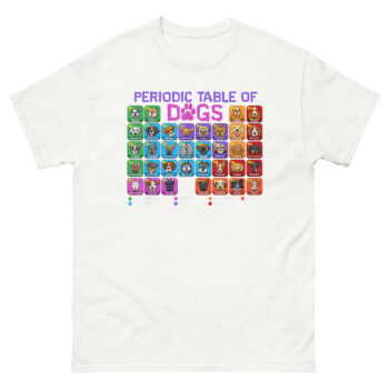 The Periodic Table of Dogs T Shirt is a breathable cotton tee that applies the logic of chemistry to the love of canines. What makes it unique is the full-color, scientifically organized grid featuring over 60 dog breeds, each with its own “atomic symbol” and classification. This shirt is designed for the science teacher, the vet clinic staff member, the dog nerd, and anyone who believes that dogs are the fundamental building blocks of happiness.