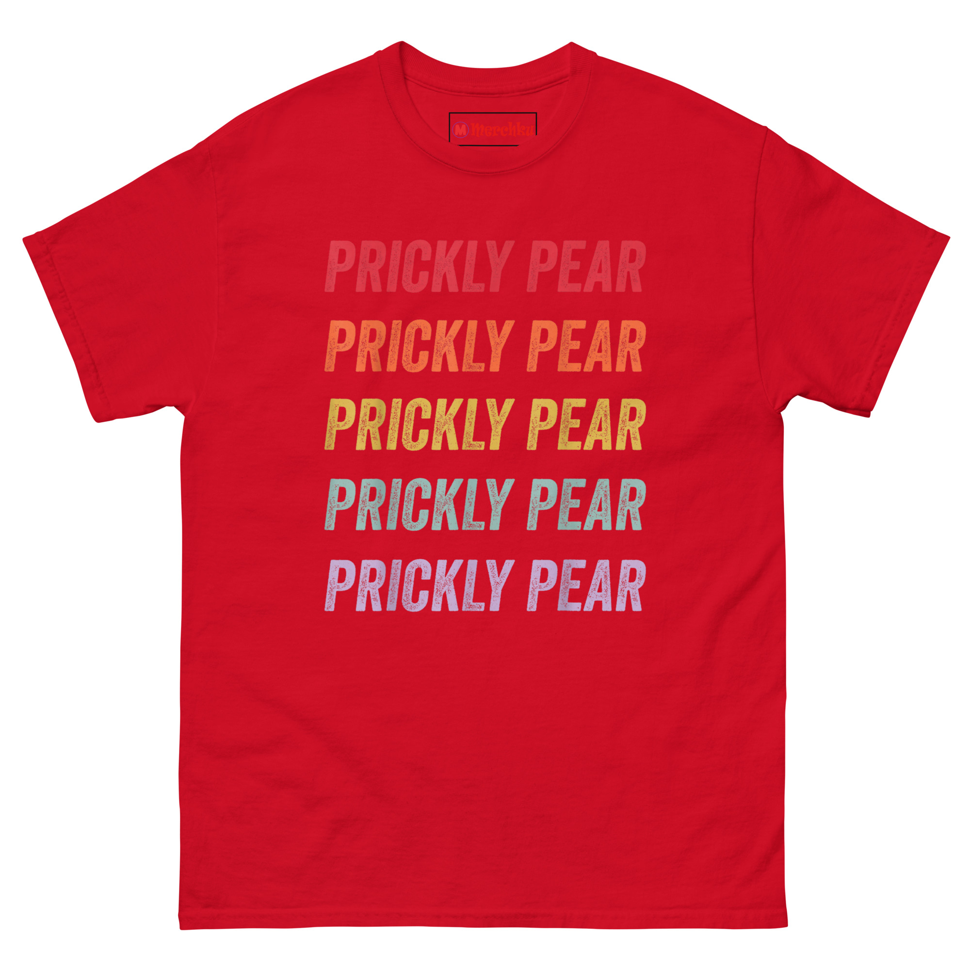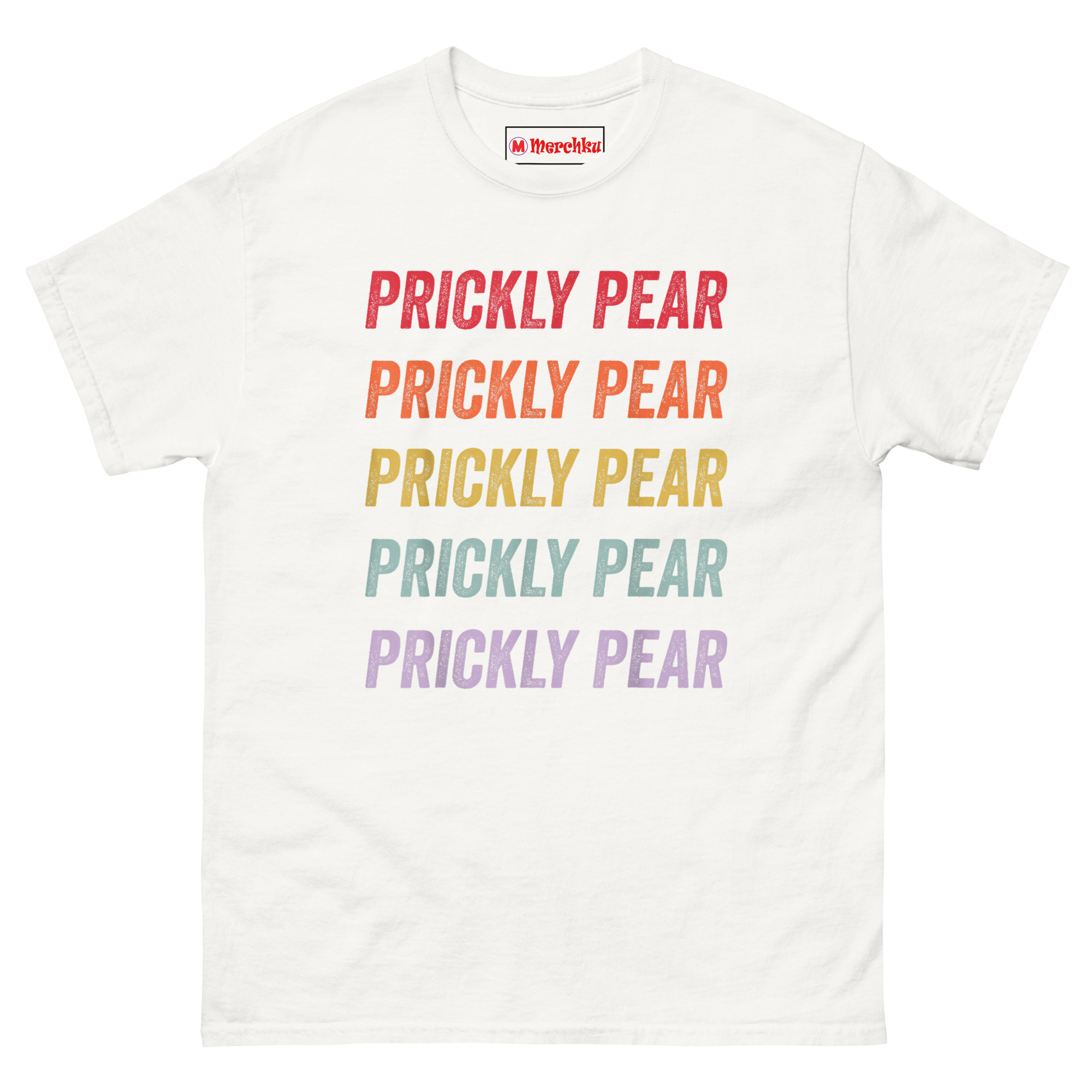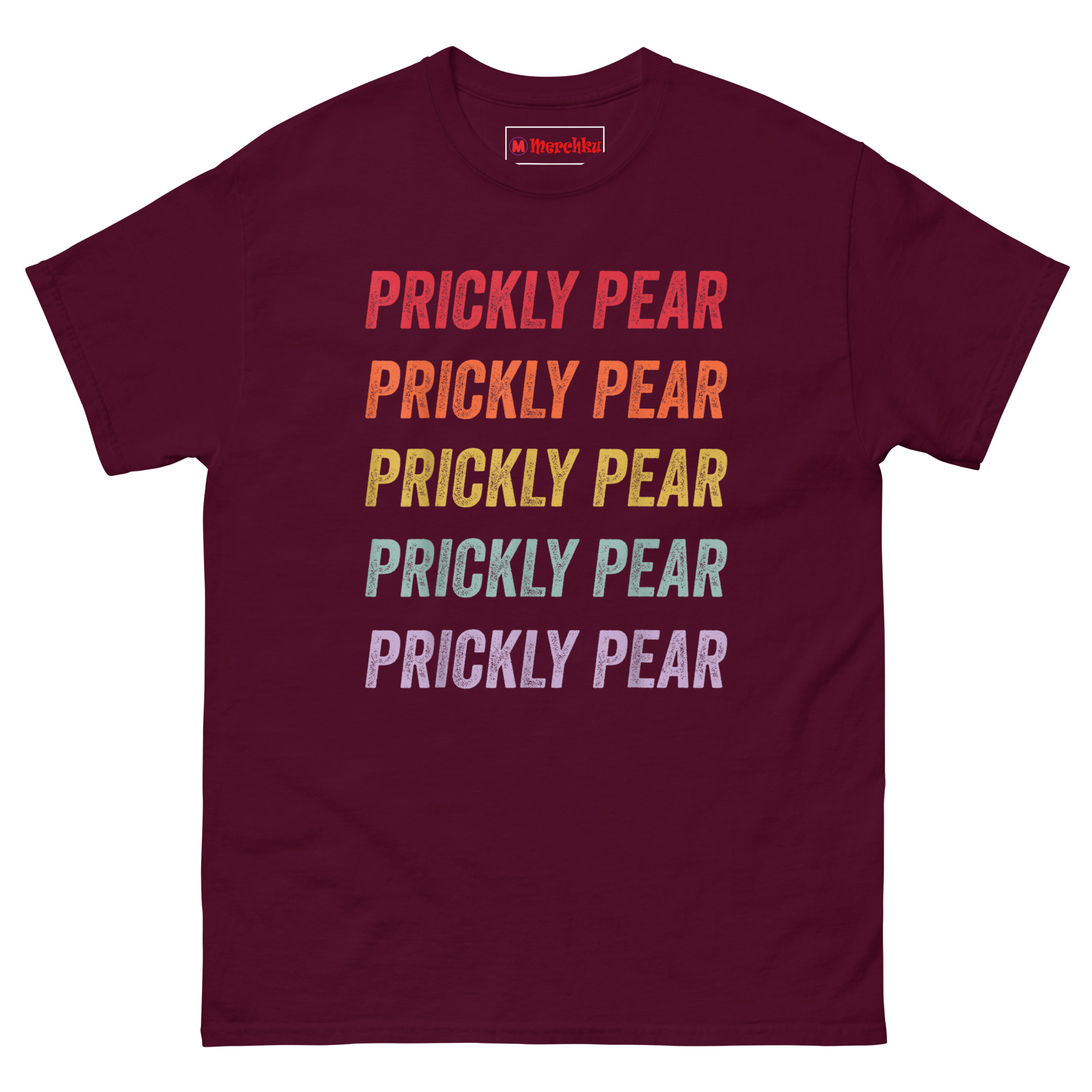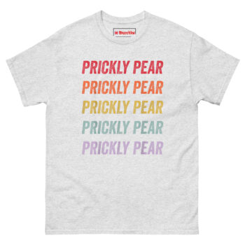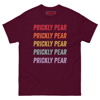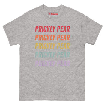 The Prickly Pear T Shirt captures the free-spirited energy of the 1970s American Southwest with a minimalist stacked text design that feels both nostalgic and fresh. It features the words “PRICKLY PEAR” repeated five times in a bold distressed font, each line a different color forming a sunset gradient from rustic red down to dusty purple. Designed for fans of retro southwestern aesthetic clothing, desert lovers, and anyone who appreciates understated botanical style, this shirt is a wearable tribute to the desert without an actual plant in sight.