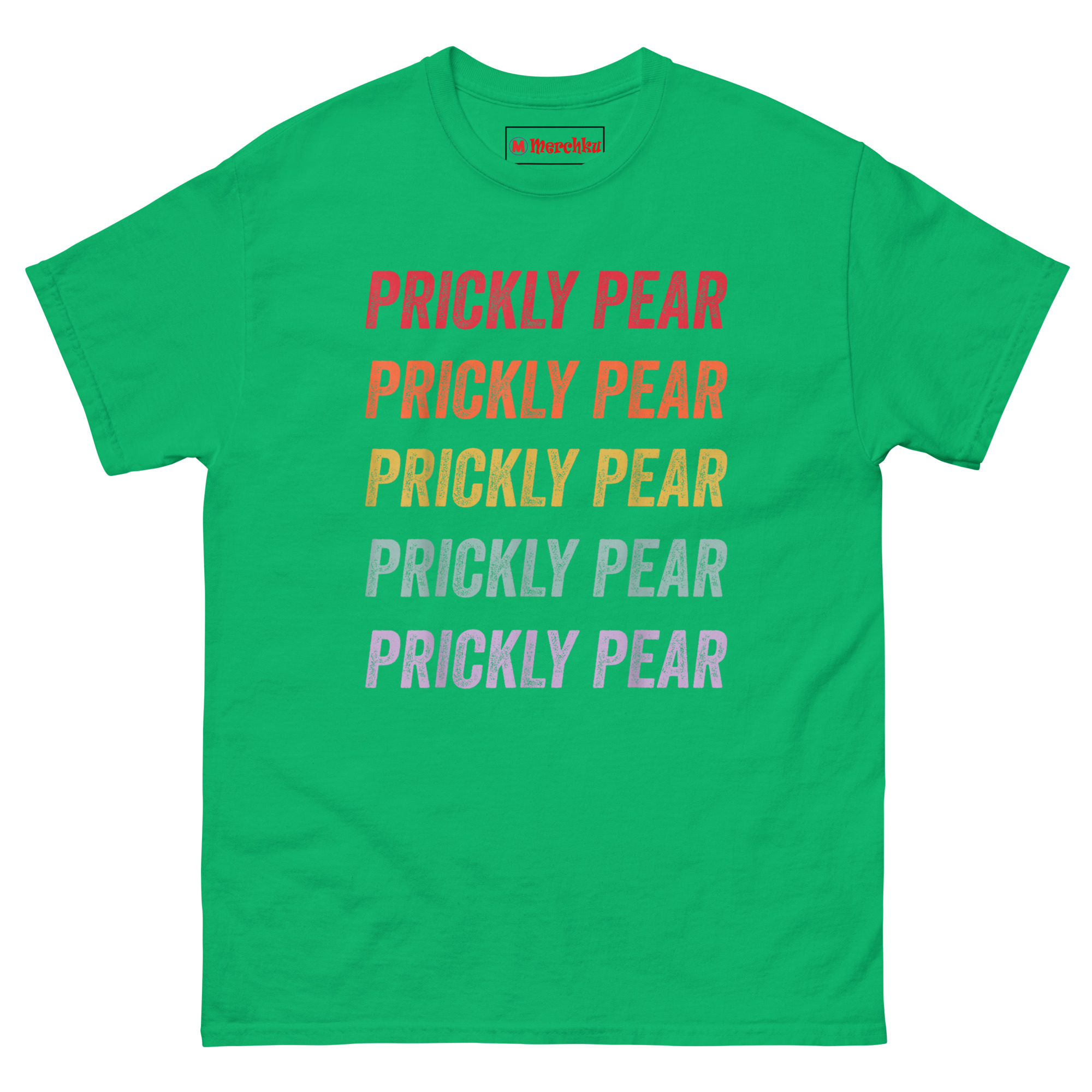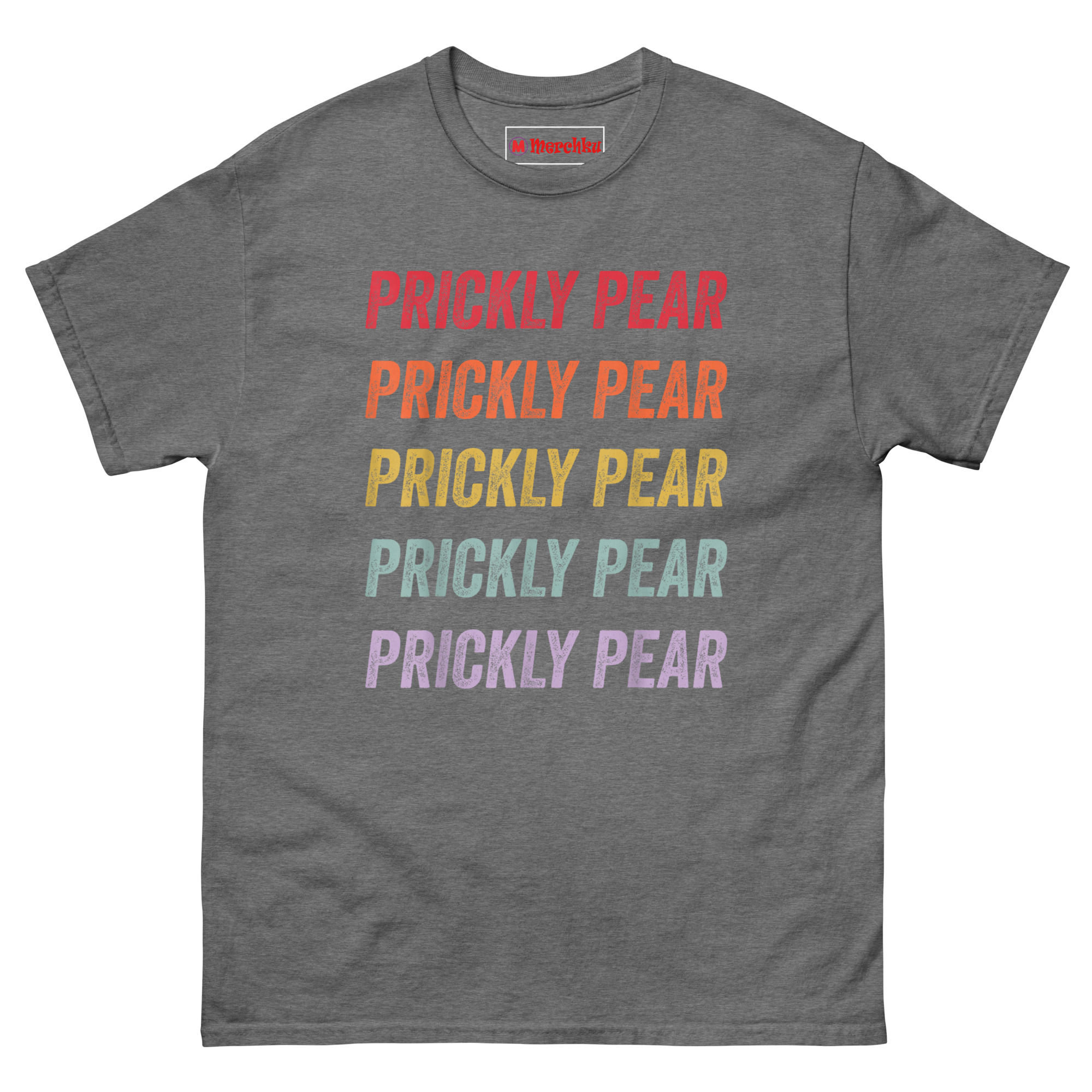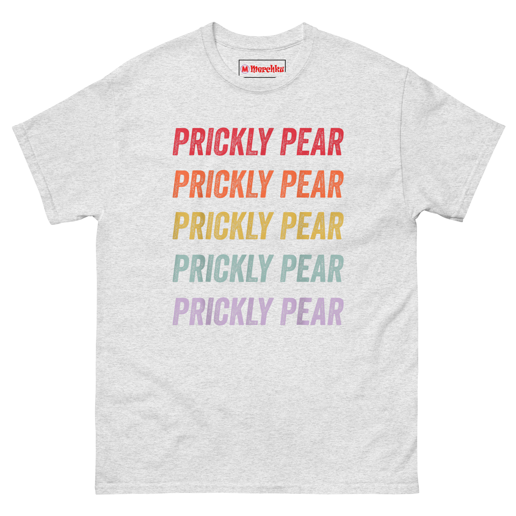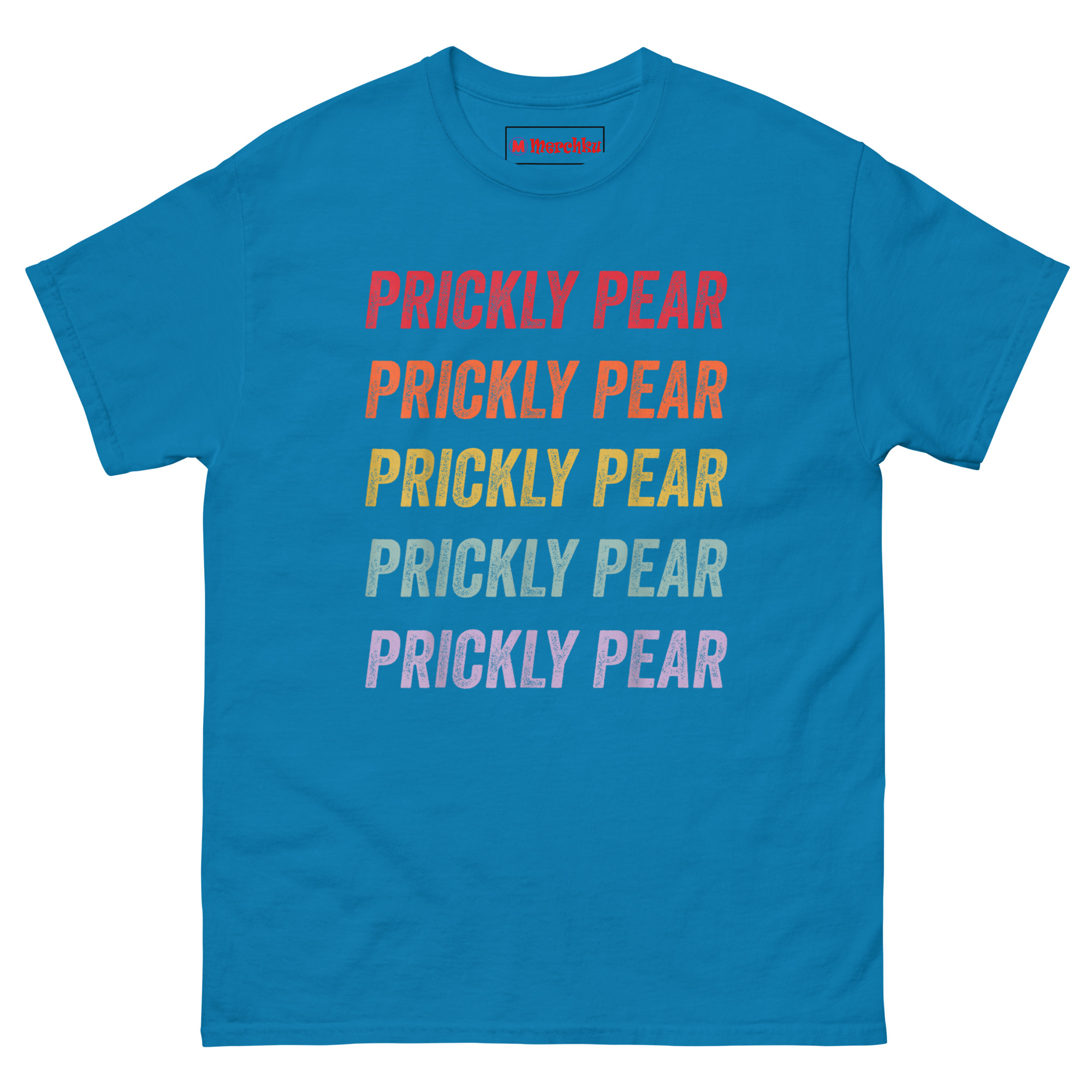 The Prickly Pear T Shirt captures the free-spirited energy of the 1970s American Southwest with a minimalist stacked text design that feels both nostalgic and fresh. It features the words “PRICKLY PEAR” repeated five times in a bold distressed font, each line a different color forming a sunset gradient from rustic red down to dusty purple. Designed for fans of retro southwestern aesthetic clothing, desert lovers, and anyone who appreciates understated botanical style, this shirt is a wearable tribute to the desert without an actual plant in sight.