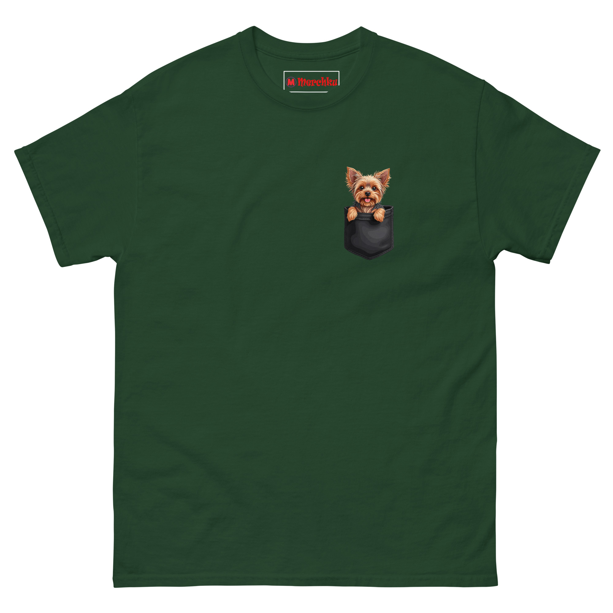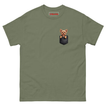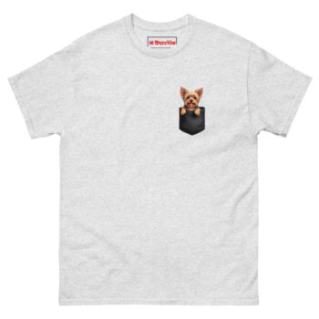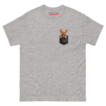 Puppy Yorkie Terrier in Your Pocket T Shirt idea came from a very common scene among Yorkie owners. A friend of mine has a tiny teacup Yorkie named Bean who goes everywhere with her, in purses, in totes, and yes, occasionally in jacket pockets. She always jokes that Bean thinks she’s a kangaroo joey, perfectly content to ride along and peek out at the world.