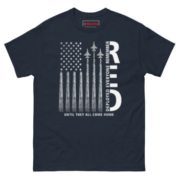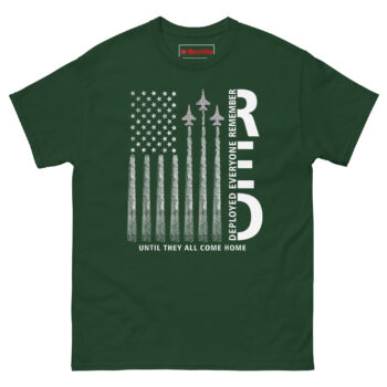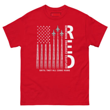 These Remembering Everyone Deployed Shirts combine a classic cotton build with a graphic that transforms the American flag into fighter jets and vapor trails. The design captures the airpower side of service, making it a perfect choice for Air Force families, aviation enthusiasts, and anyone committed to the weekly tradition of wearing red until every service member returns.