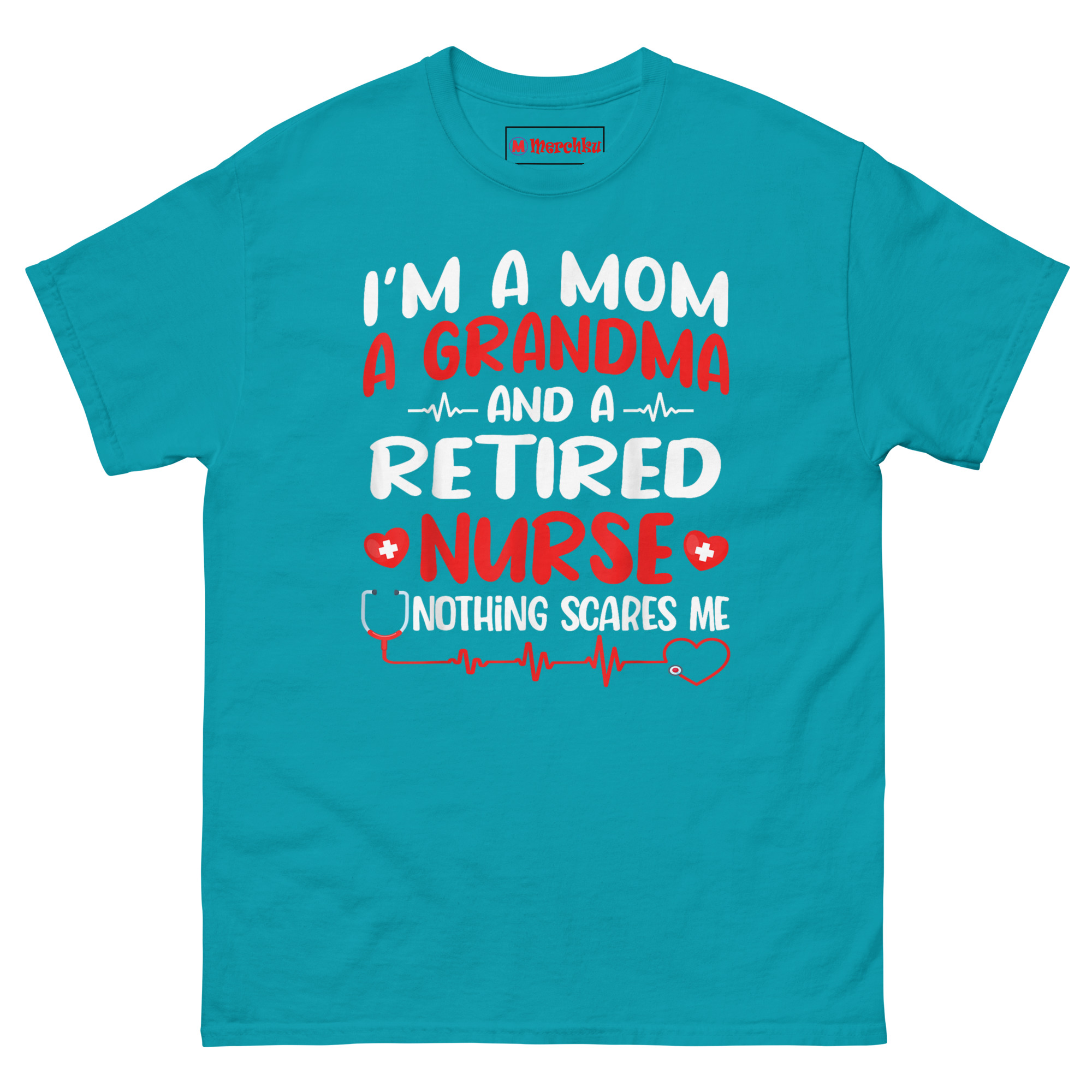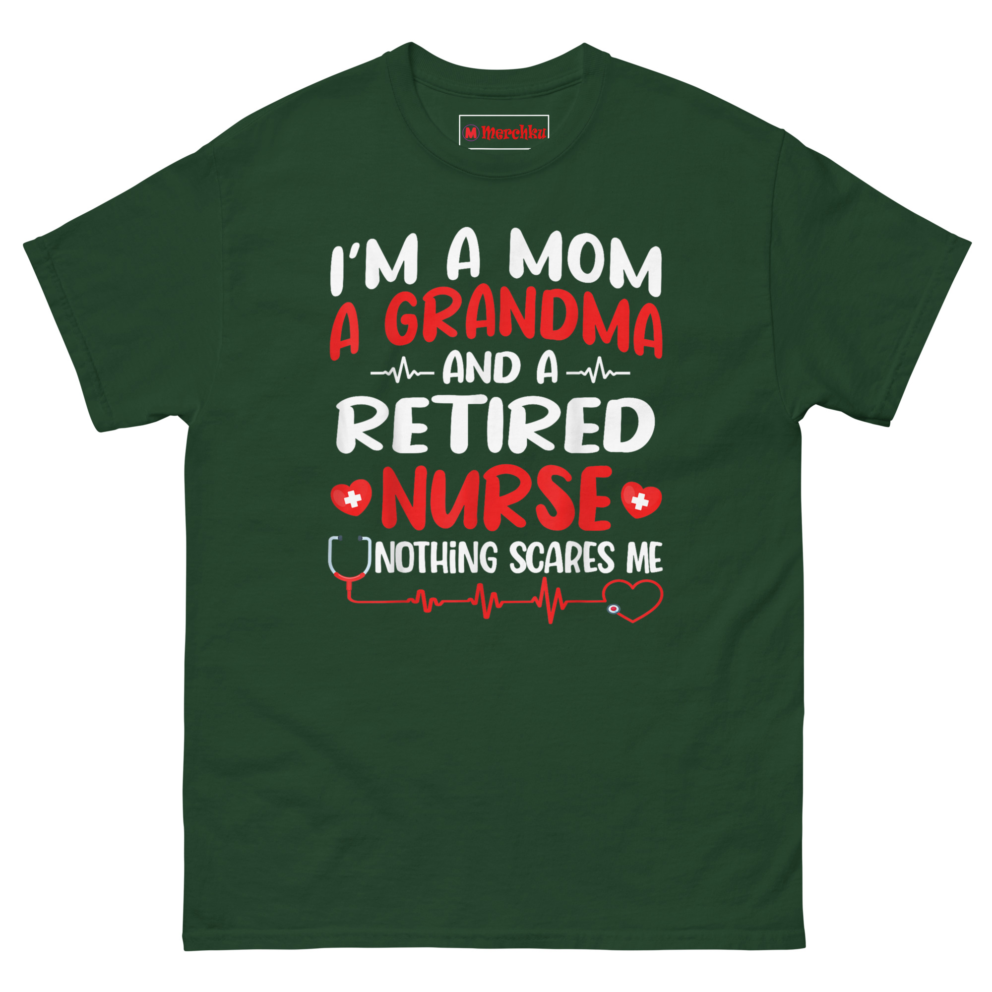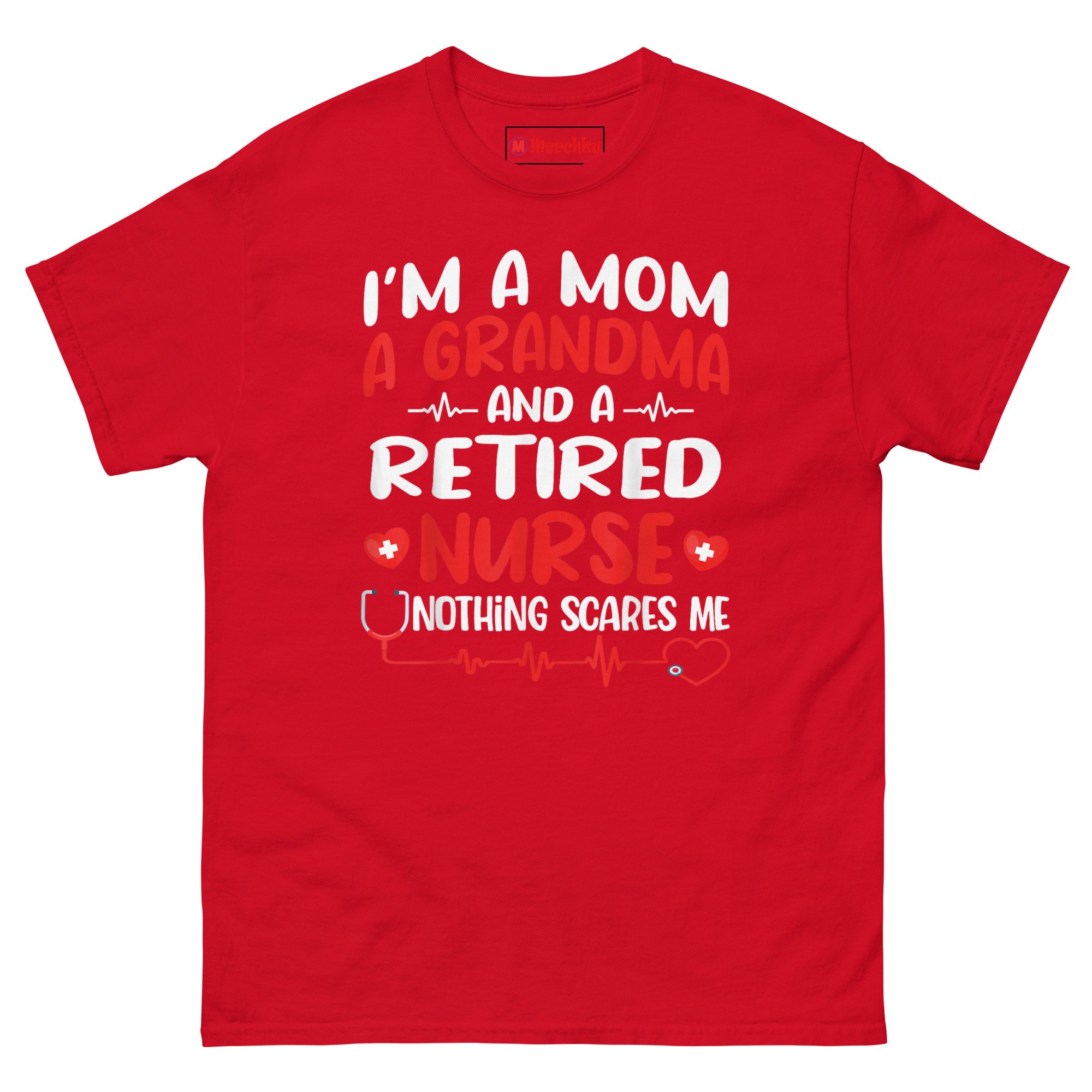 The Retired Nurse T Shirt is a bold, celebratory tee designed for the women who have spent decades caring for others, both on the clock and at home. What makes it unique is the powerful combination of roles, Mom, Grandma, and Retired Nurse, capped with the confident punchline “Nothing Scares Me,” all framed by medical hearts and an EKG line that transforms into a stethoscope. It is one of the most meaningful gifts for someone retiring from nursing, honoring a lifetime of strength, compassion, and unshakable courage.
