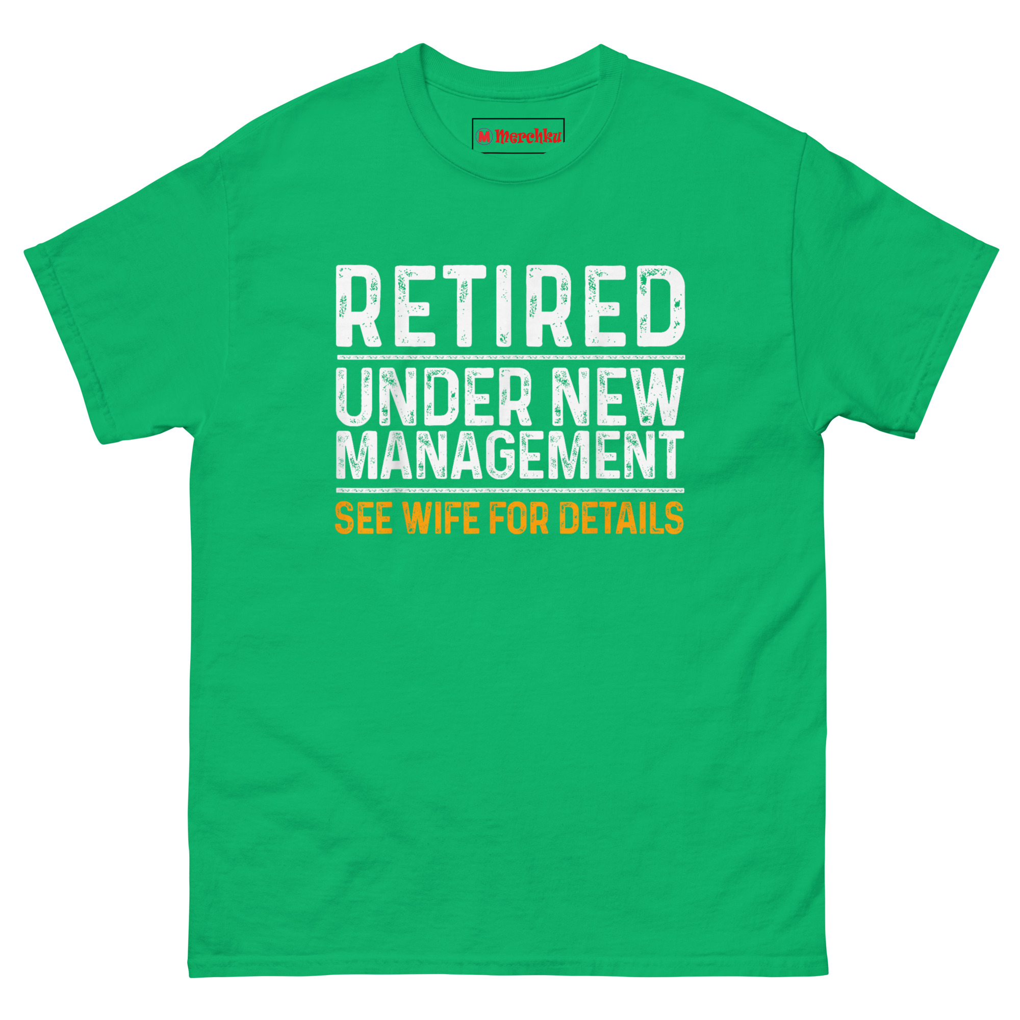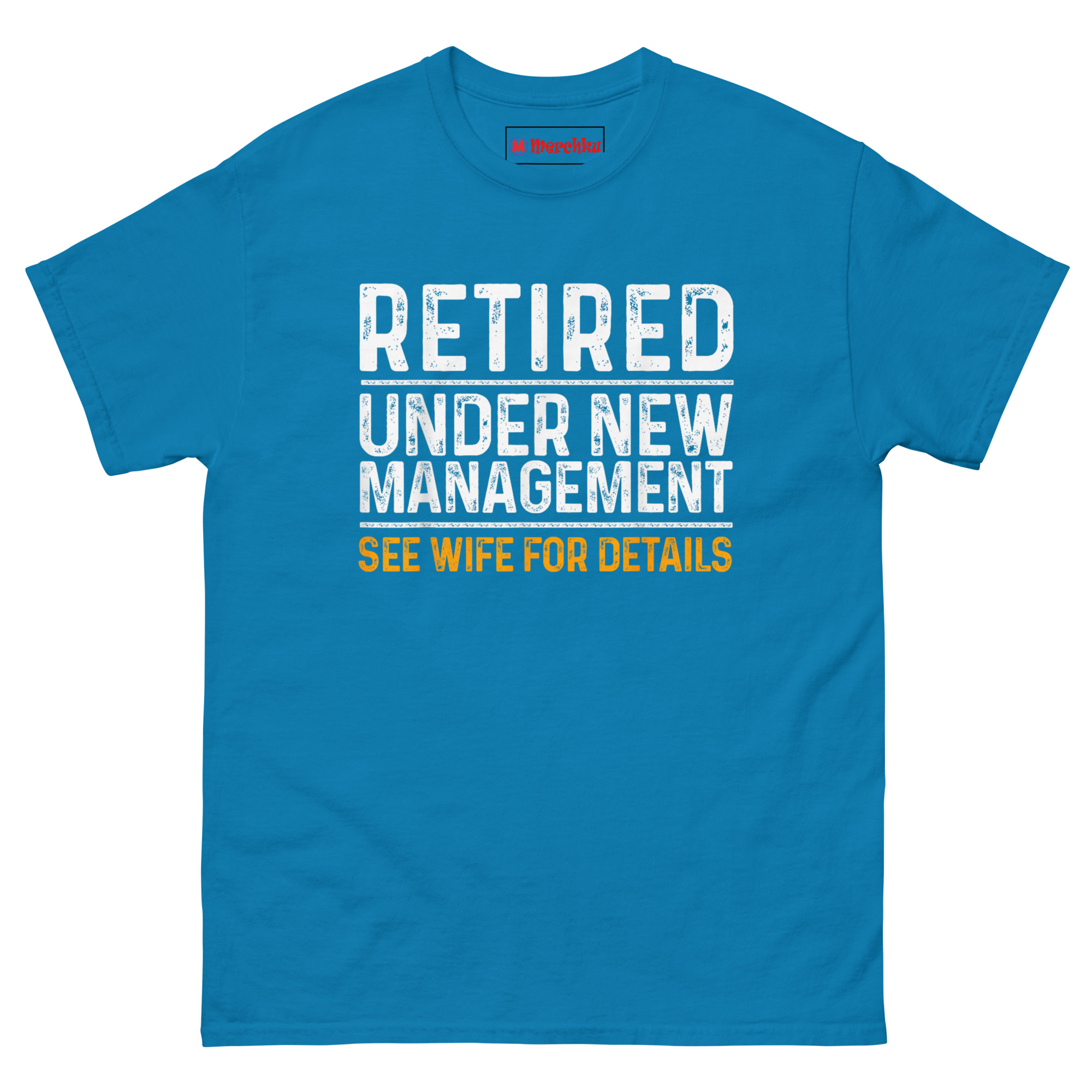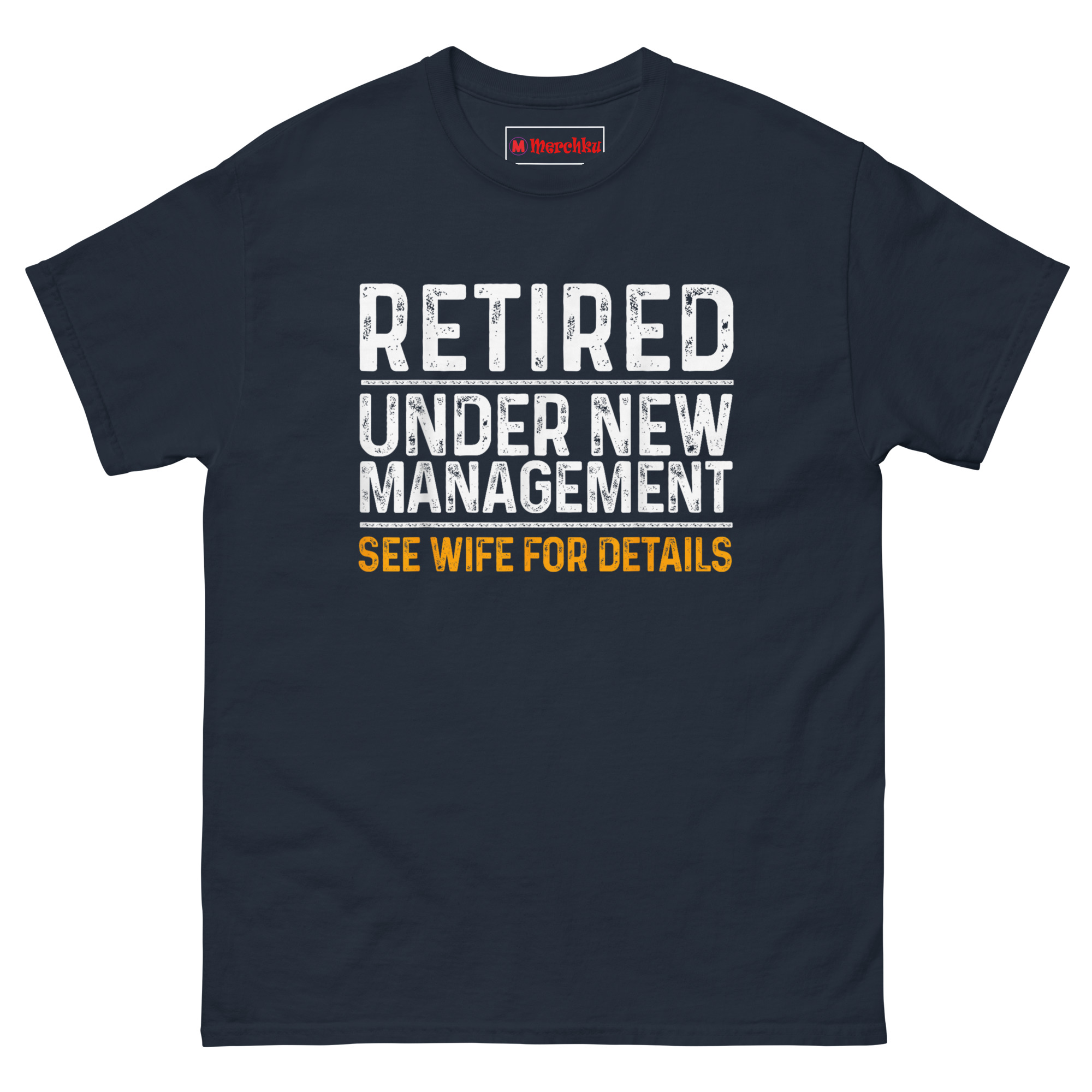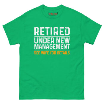The idea for this shirt came from watching a neighbor retire after thirty-five years in construction. At his celebration, his wife handed him a to-do list for the garage before he even finished his first slice of cake. Someone yelled out, “Looks like you just changed management,” and the whole room cracked up.