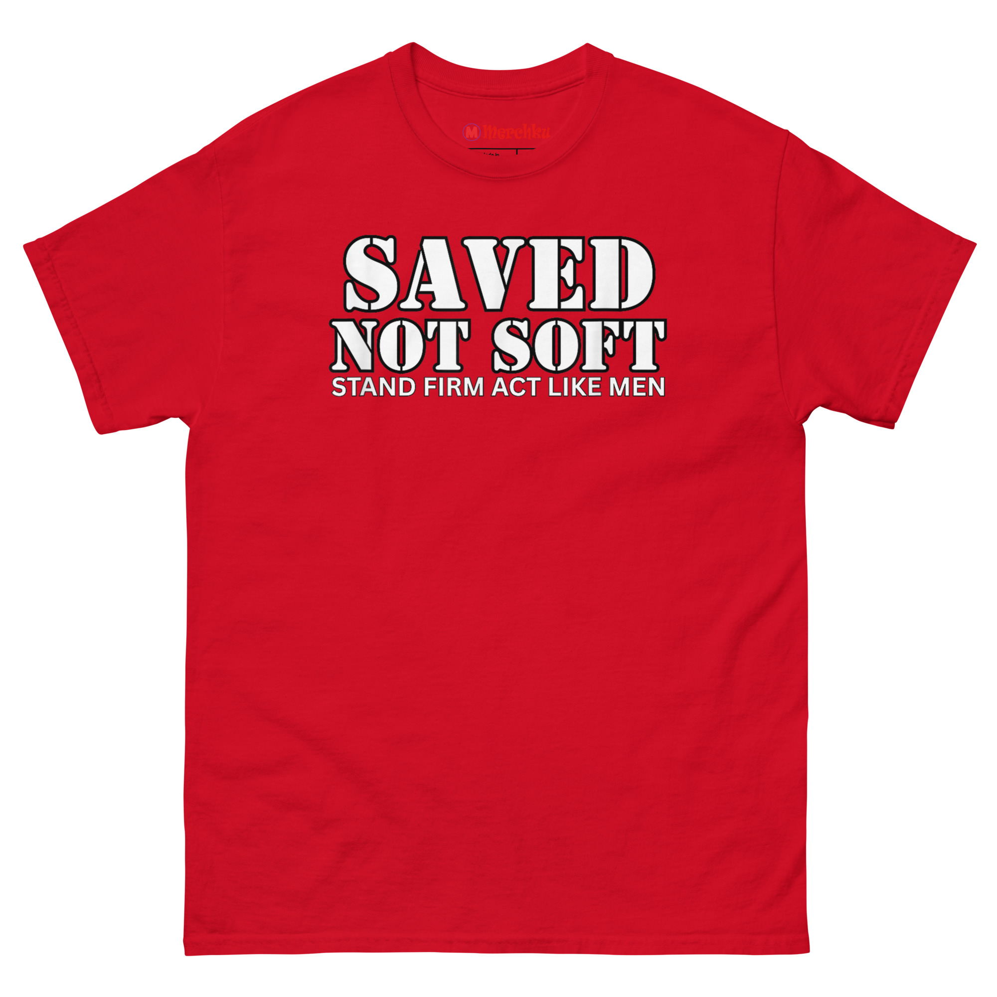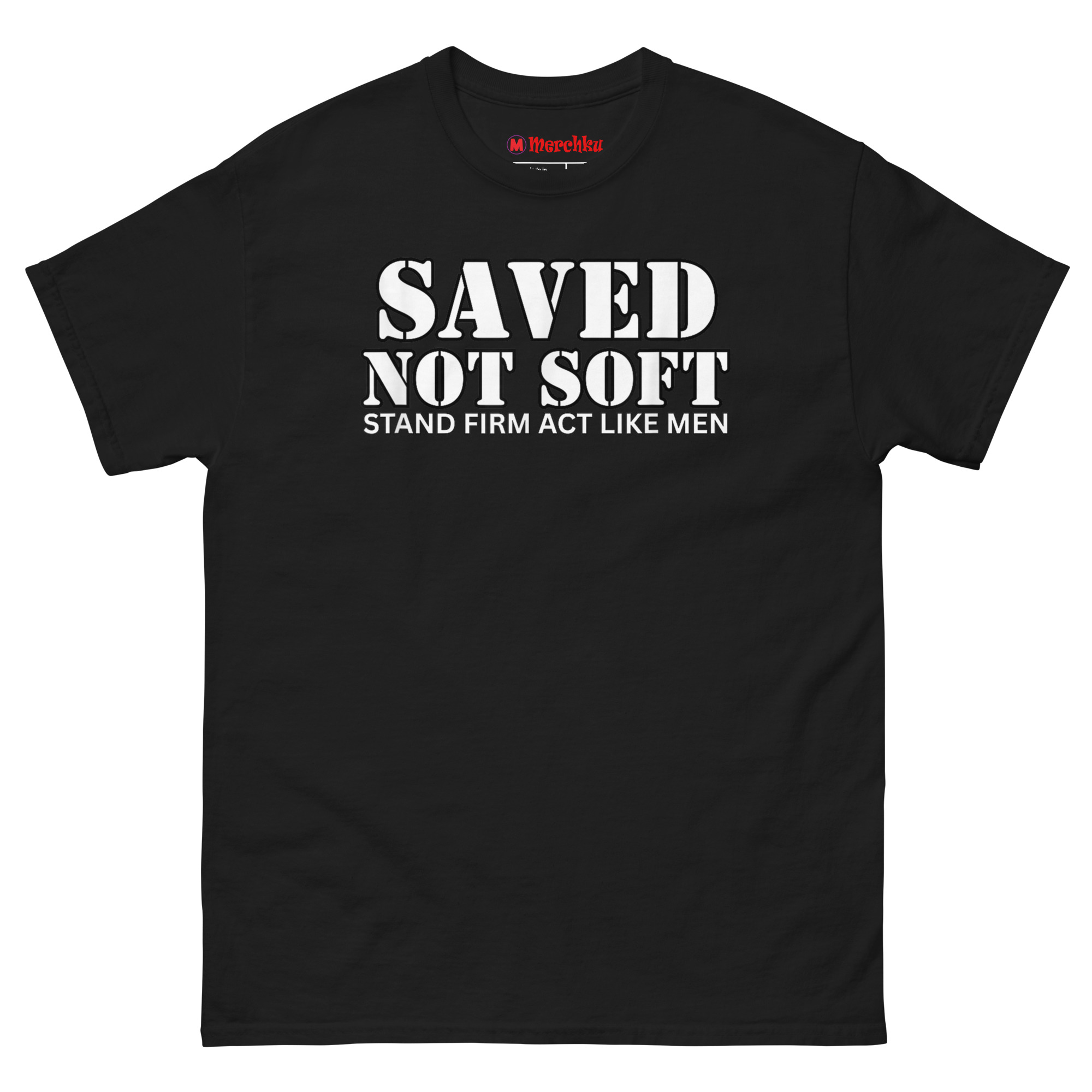 This is the Saved Not Soft Stand Firm Act Like Men T Shirt, a bold statement of faith and conviction. It features a powerful, three-line typographic design inspired by military stencil fonts, declaring a commitment to spiritual strength. Designed for Christian men who embrace their role as leaders, protectors, and disciples, this shirt is a wearable reminder that faith requires courage and resilience.