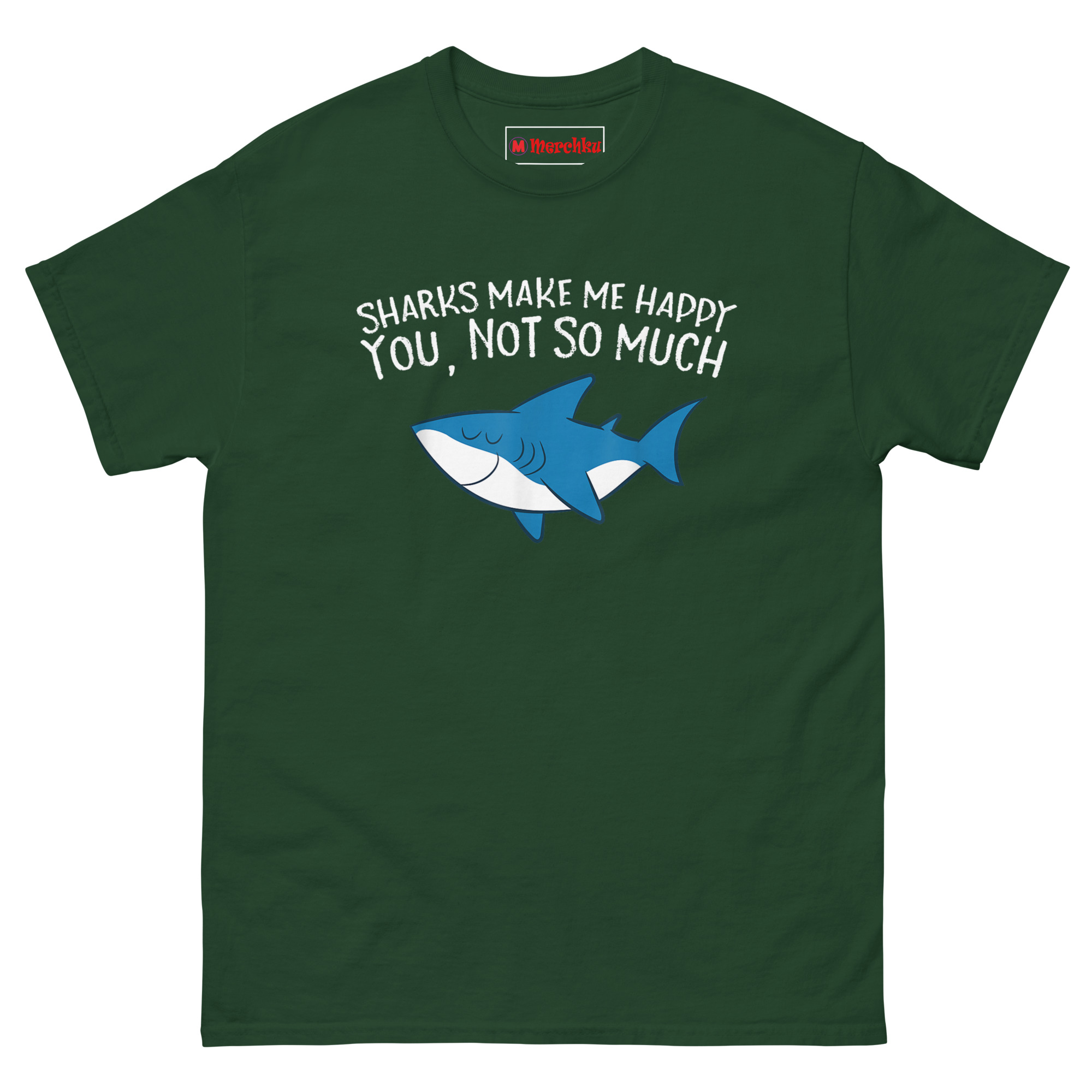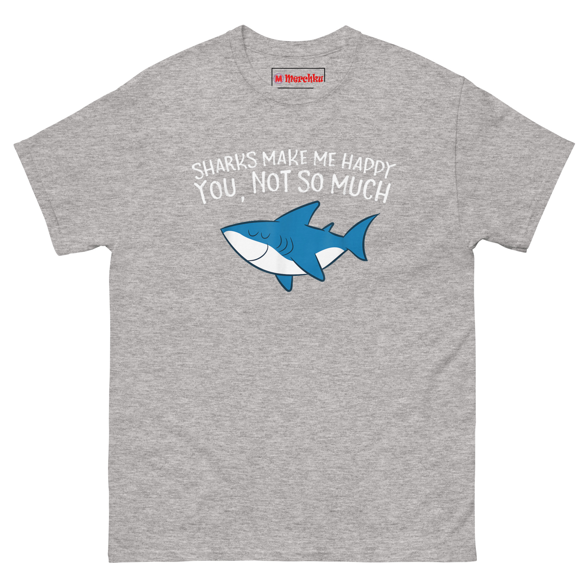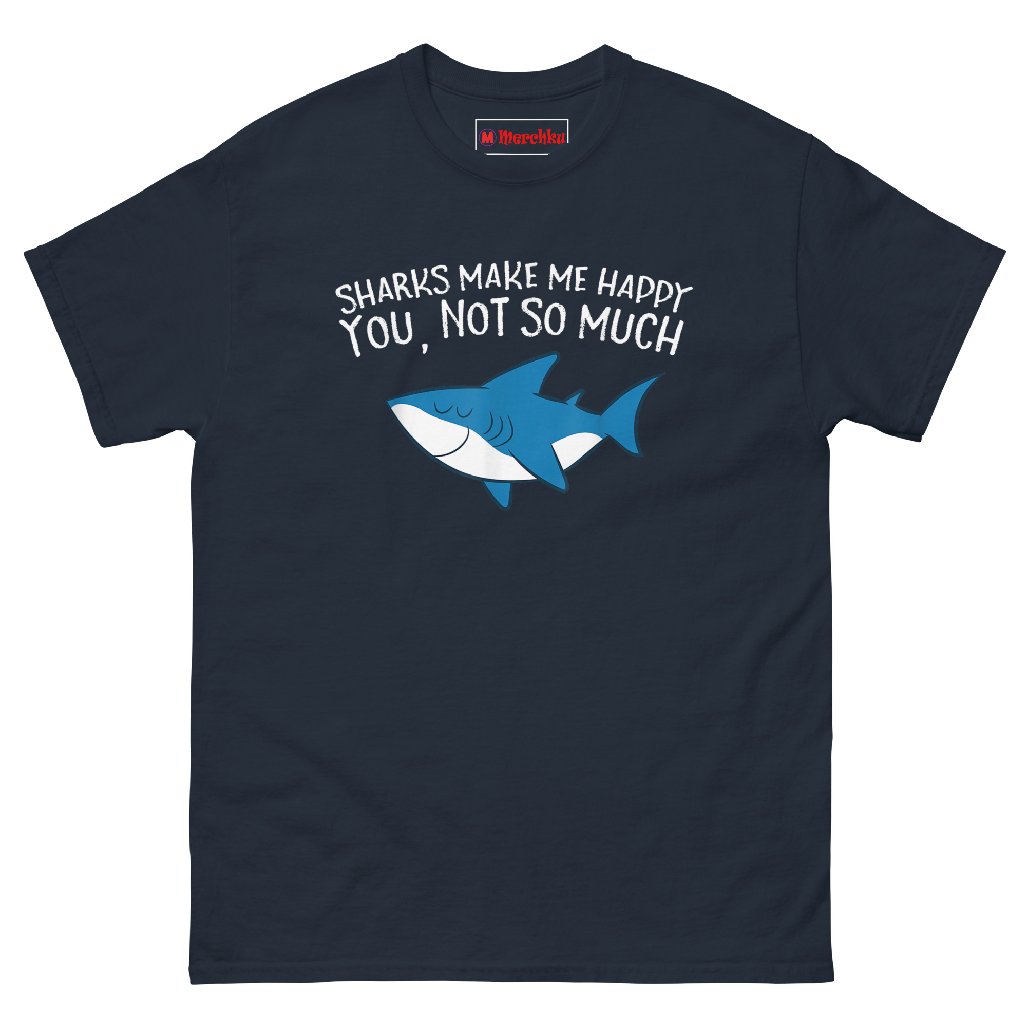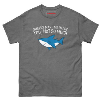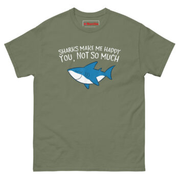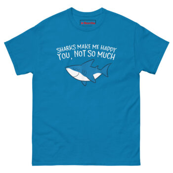 The Sharks Make Me Happy You Not So Much T Shirt features a relaxed cartoon shark with closed eyes and a content smile, paired with text that draws a clear line between what matters and what doesn’t. The friendly ocean blue predator looks genuinely peaceful while the message handles the rest. Designed for marine life enthusiasts, shark week devotees, and anyone who finds more joy in the ocean than in crowded rooms, this shirt combines whimsy with honest boundaries.