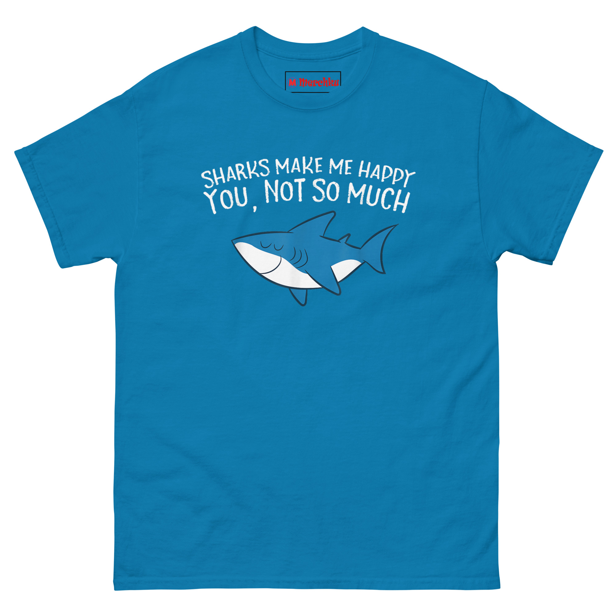 That perspective shaped this entire design. Most people expect sharks to look threatening. This one breaks that expectation entirely. The vibrant ocean blue body with clean white underbelly reads as friendly rather than fierce. Closed eyes and a relaxed expression suggest genuine contentment, the visual equivalent of a deep breath. Above it, “SHARKS MAKE ME HAPPY” arches in a playful hand-sketched font. Below, the punchline lands in bolder block letters: “YOU, NOT SO MUCH.” The contrast between the peaceful shark and the direct message creates that perfect balance. It’s Peace in the Predatory, finding sanctuary in something the world fears. Whether you’re a marine biology student, a shark week enthusiast, or just someone who prefers the company of ancient ocean creatures, Sharks Make Me Happy You Not So Much T Shirt speaks your language.
