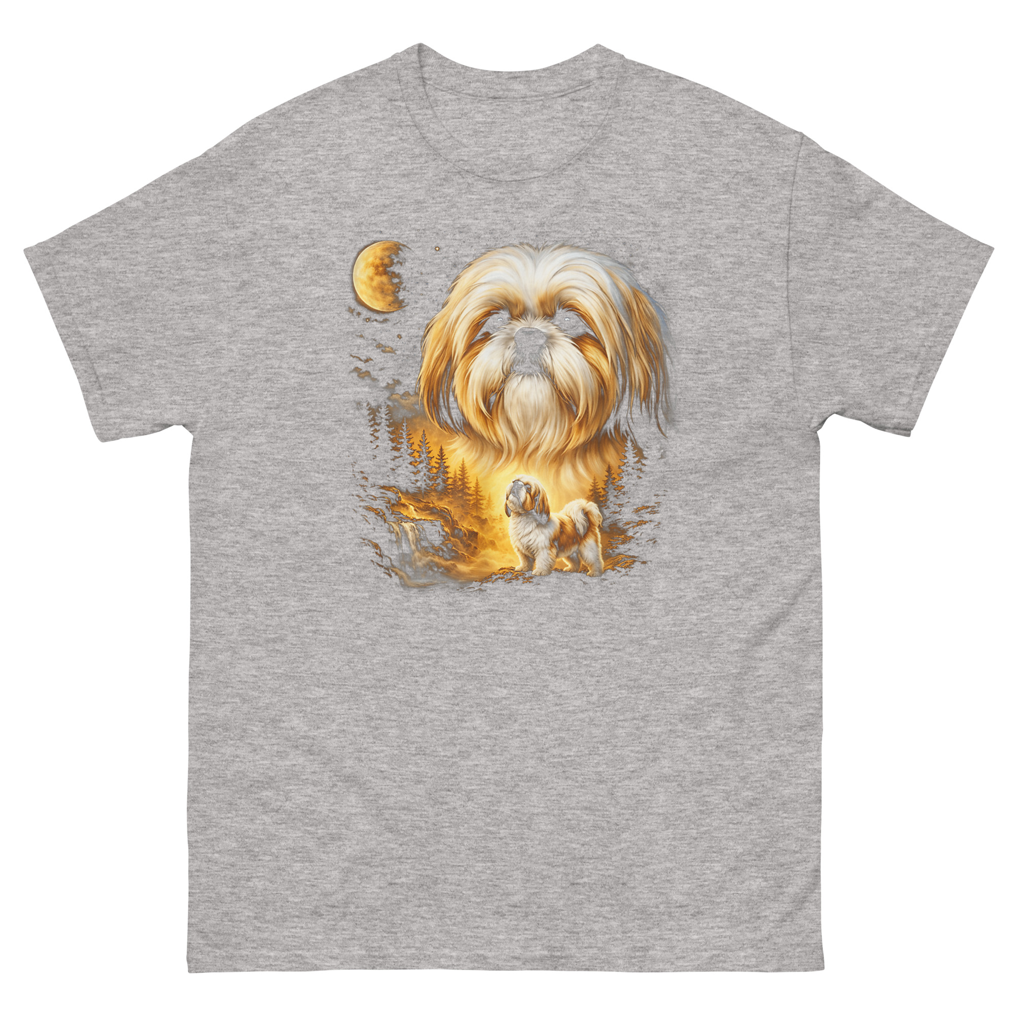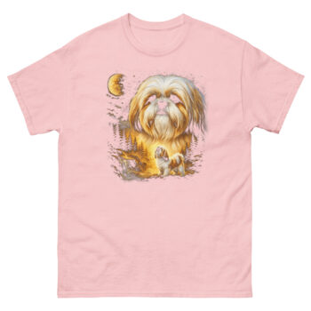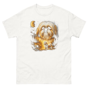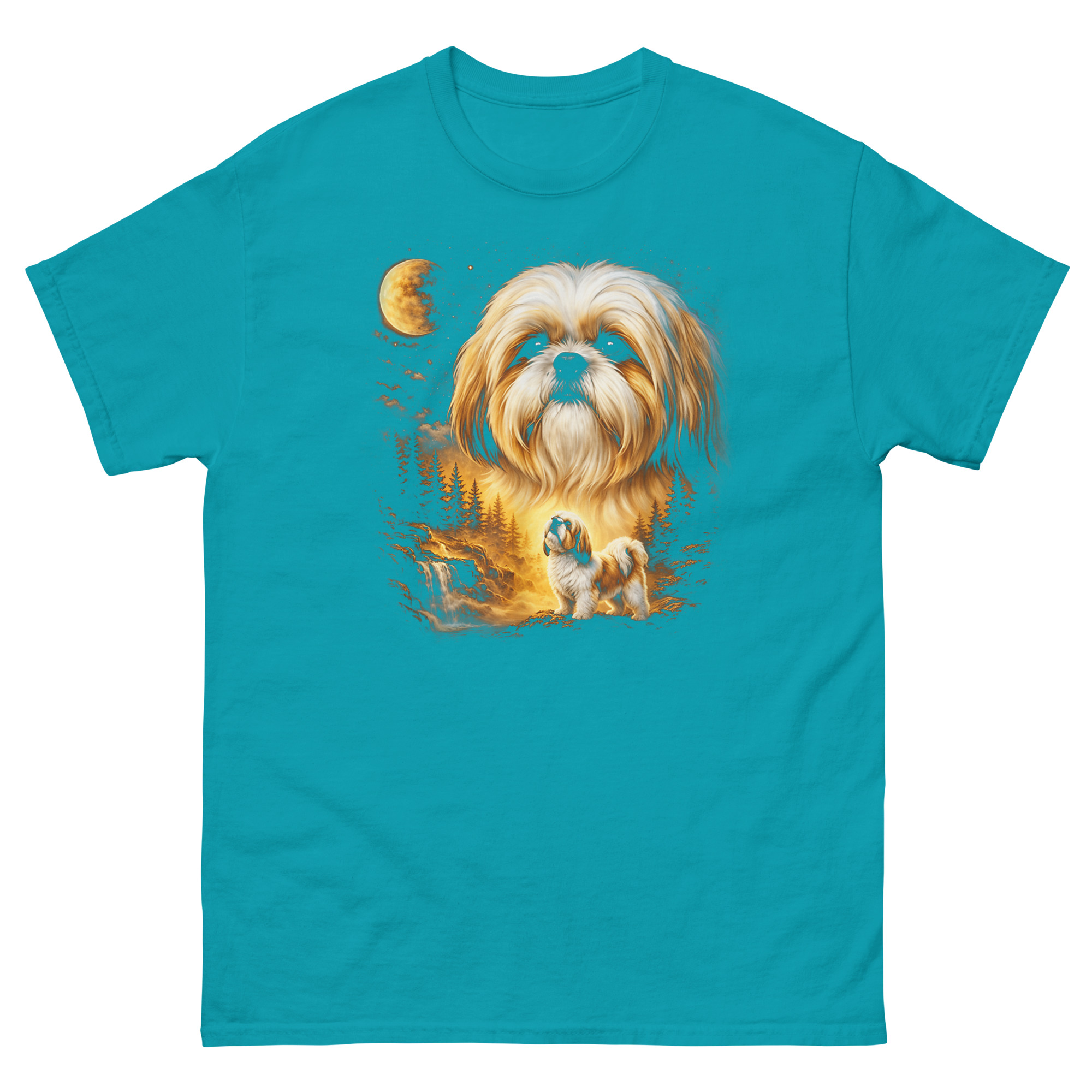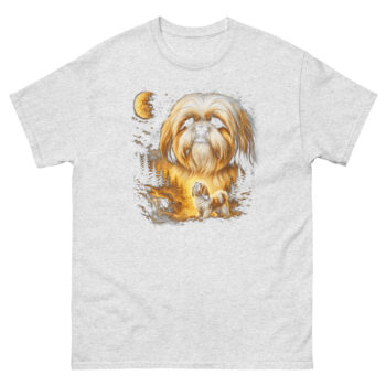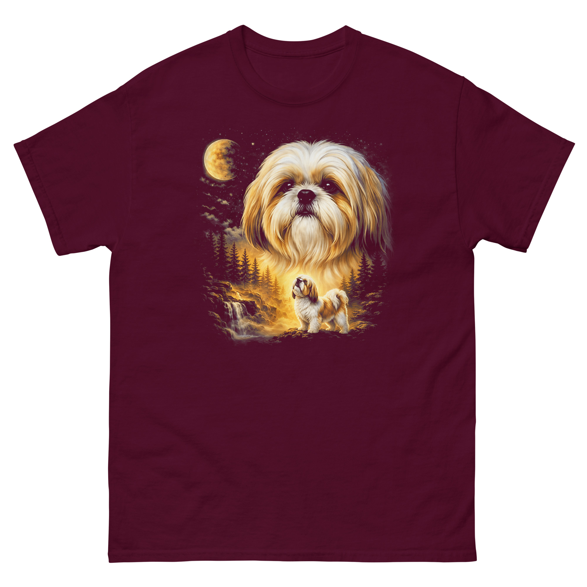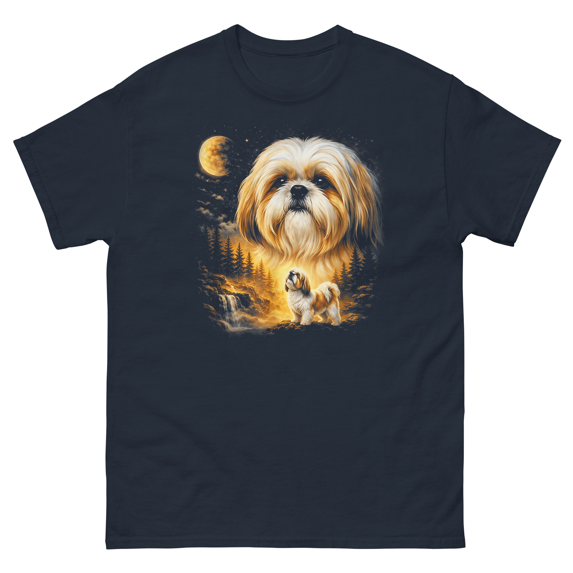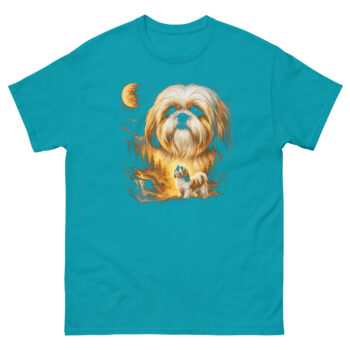 We wanted to capture that hilarious contrast between the fancy haircut and the ancient soul. So we built an entire fantasy landscape around it. At the bottom of the design, a small, realistic Shih Tzu stands proudly on a jagged cliff, head tilted up toward a glowing full moon with visible craters. Behind her, a misty pine forest stretches out and a waterfall crashes into a dark mountain lake. Floating above the whole scene, a giant ethereal portrait of the same Shih Tzu glows with warm amber light, watching over her domain. It is a Shih Tzu wolf parody shirt that treats a lap dog like the alpha of the wilderness.