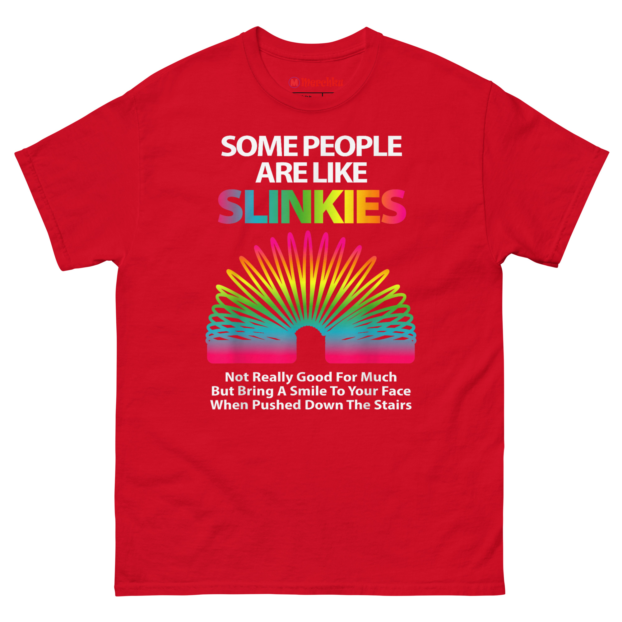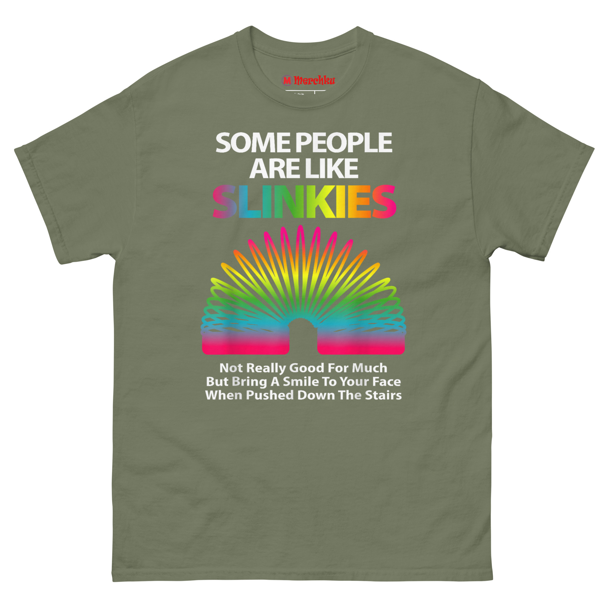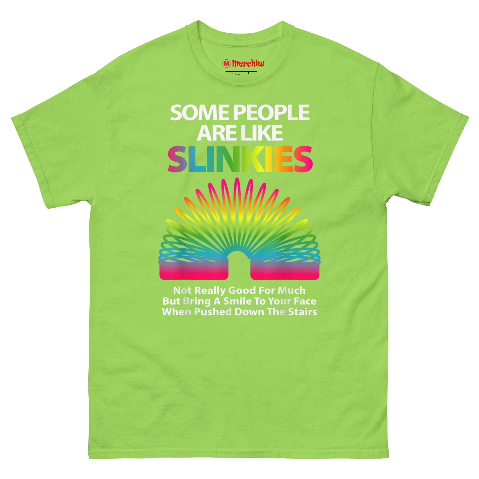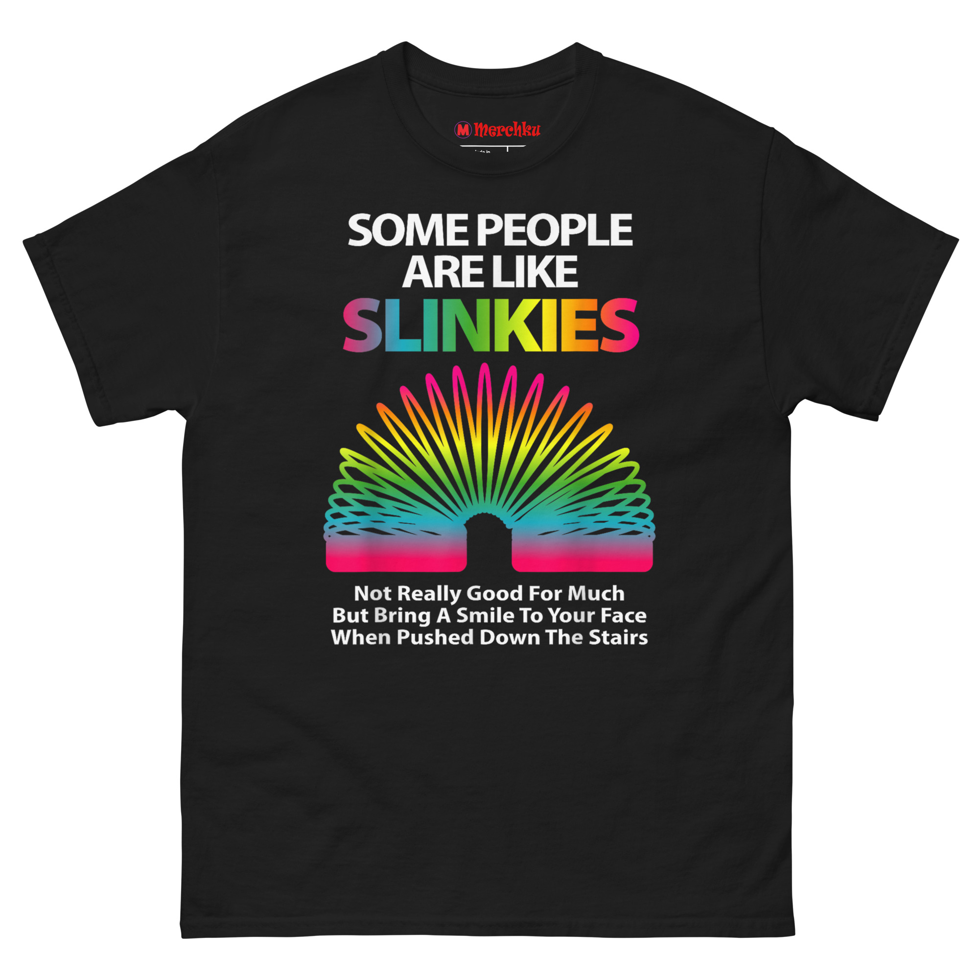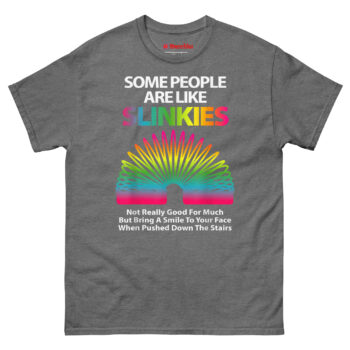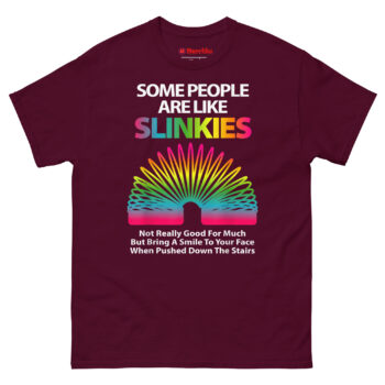 We paired that classic, dark joke with a universally loved visual: the slinky. The design itself is clean and impactful. A vibrant, multi-colored slinky arcs across the chest, just like you remember from childhood. Above it, you see “SOME PEOPLE ARE LIKE,” and the word “SLINKIES” is rendered in a matching rainbow gradient. Then comes the kicker. Below the graphic, in crisp white text, is the full, unapologetic punchline. It’s a perfect blend of vintage childhood nostalgia and edgy, adult cynicism. This isn’t just another funny offensive novelty shirt for adults; it’s a statement.