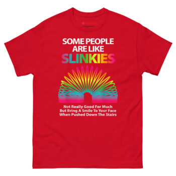 If you’re looking for the perfect Some People Are Like Slinkies T Shirt to capture your feelings about the world, you’ve found it. This shirt combines the comfort of 100% cotton with a hilarious, edgy design that’s sure to get laughs and nods of agreement. It’s more than just clothing; it’s a coping mechanism. Whether you need sarcastic gag gifts for annoying coworkers or a funny antisocial clothing option for your own wardrobe, this is the one. Don’t just think it, wear it. Get your Some People Are Like Slinkies T Shirt today and let your t-shirt do the talking.
