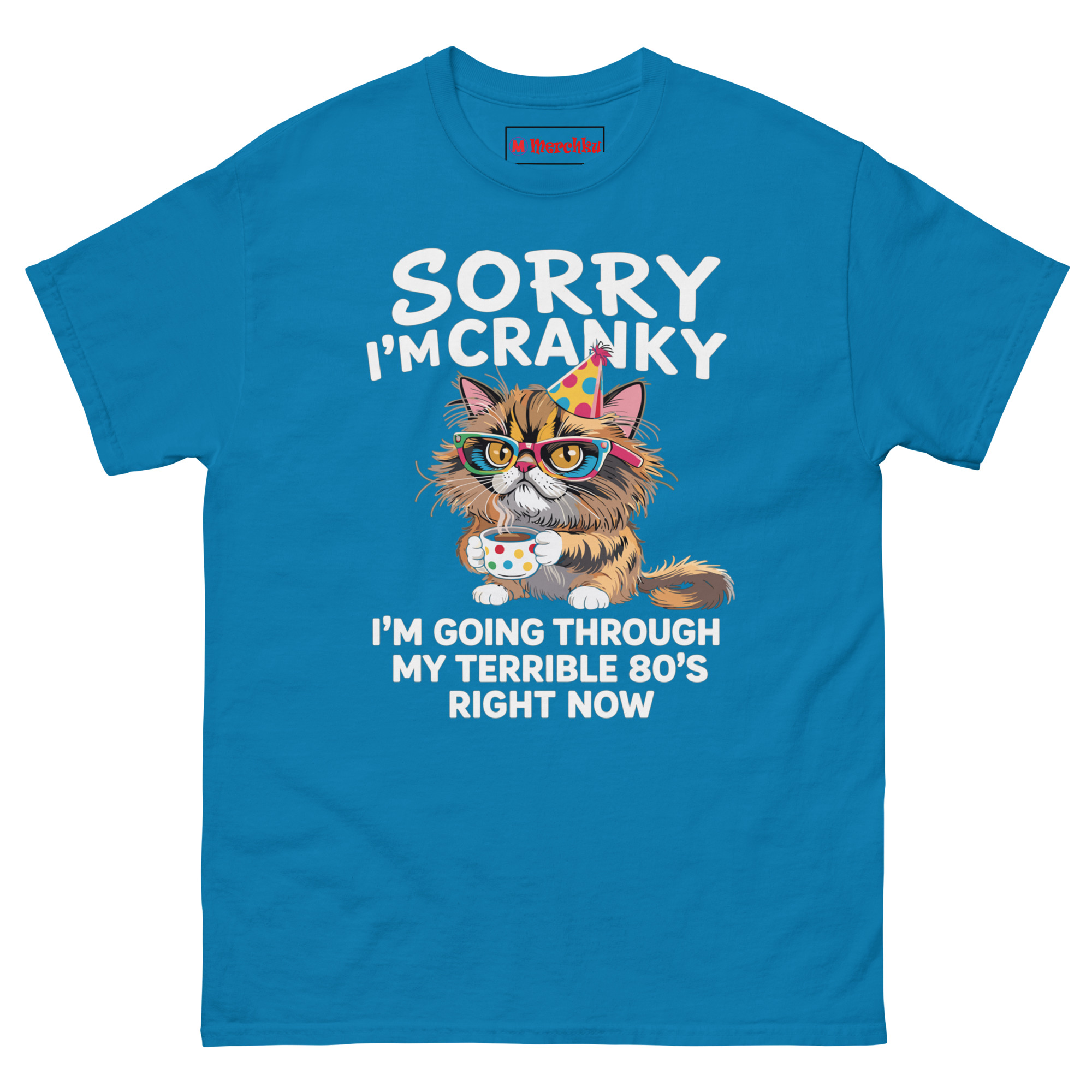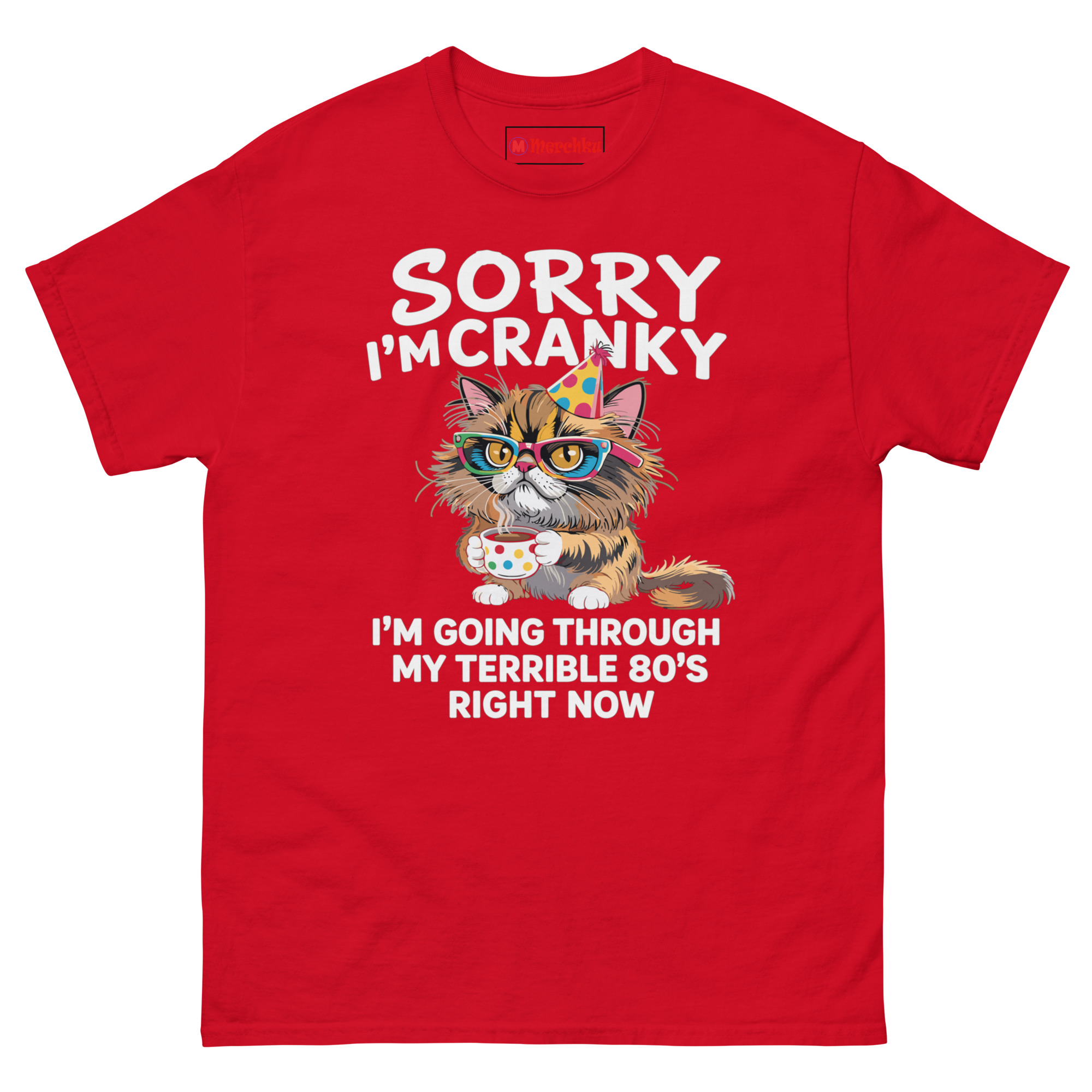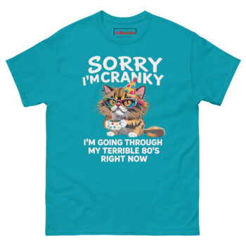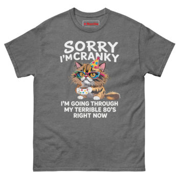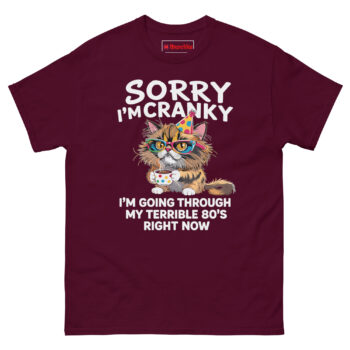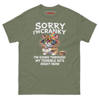 The Sorry I’m Cranky I’m Going Through My Terrible 80’s Right Now T Shirt is a 100% cotton classic tee built for comfort and honesty. It’s the funny gift for an 80 year old cat lover who loves coffee and isn’t afraid to admit their patience has run thin. Made without dangerous substances, this shirt turns a milestone birthday into a wearable joke.