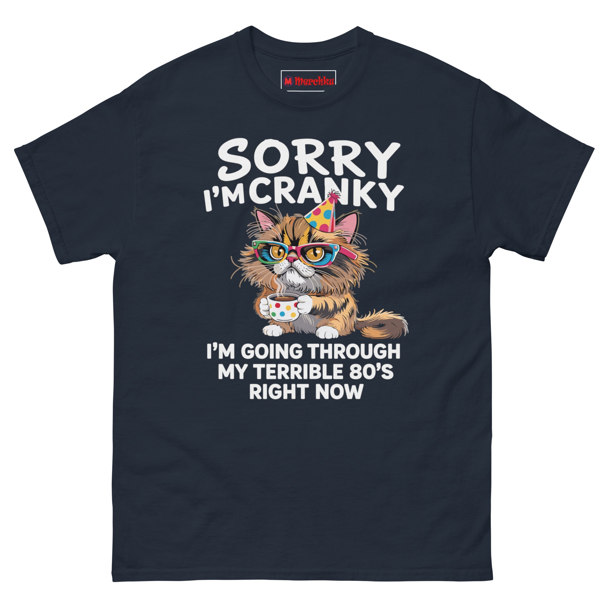The illustration features a fluffy, long-haired cat looking completely fed up. Notice the oversized retro glasses and polka-dot party hat, because even when you’re grumpy, you still show up. The cat clutches a steaming coffee mug like a lifeline. The philosophy is simple: reaching 80 gives you a privilege. You don’t have to pretend to be cheerful. You can love your cat, drink your coffee, and wear your mood on your sleeve.