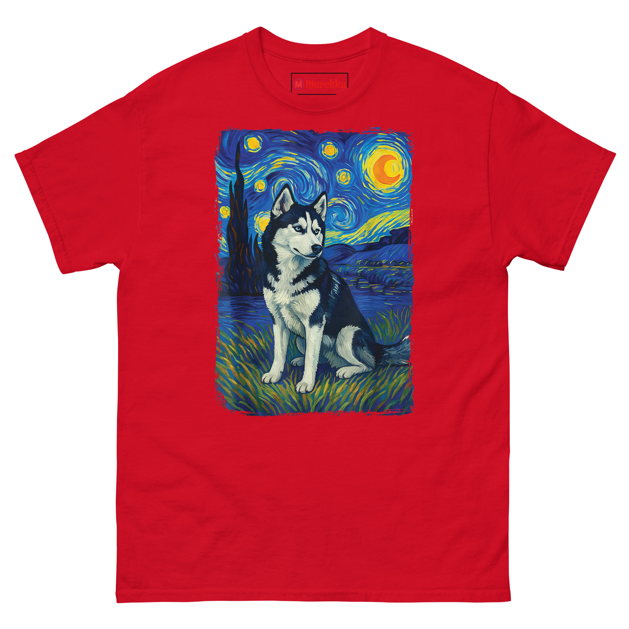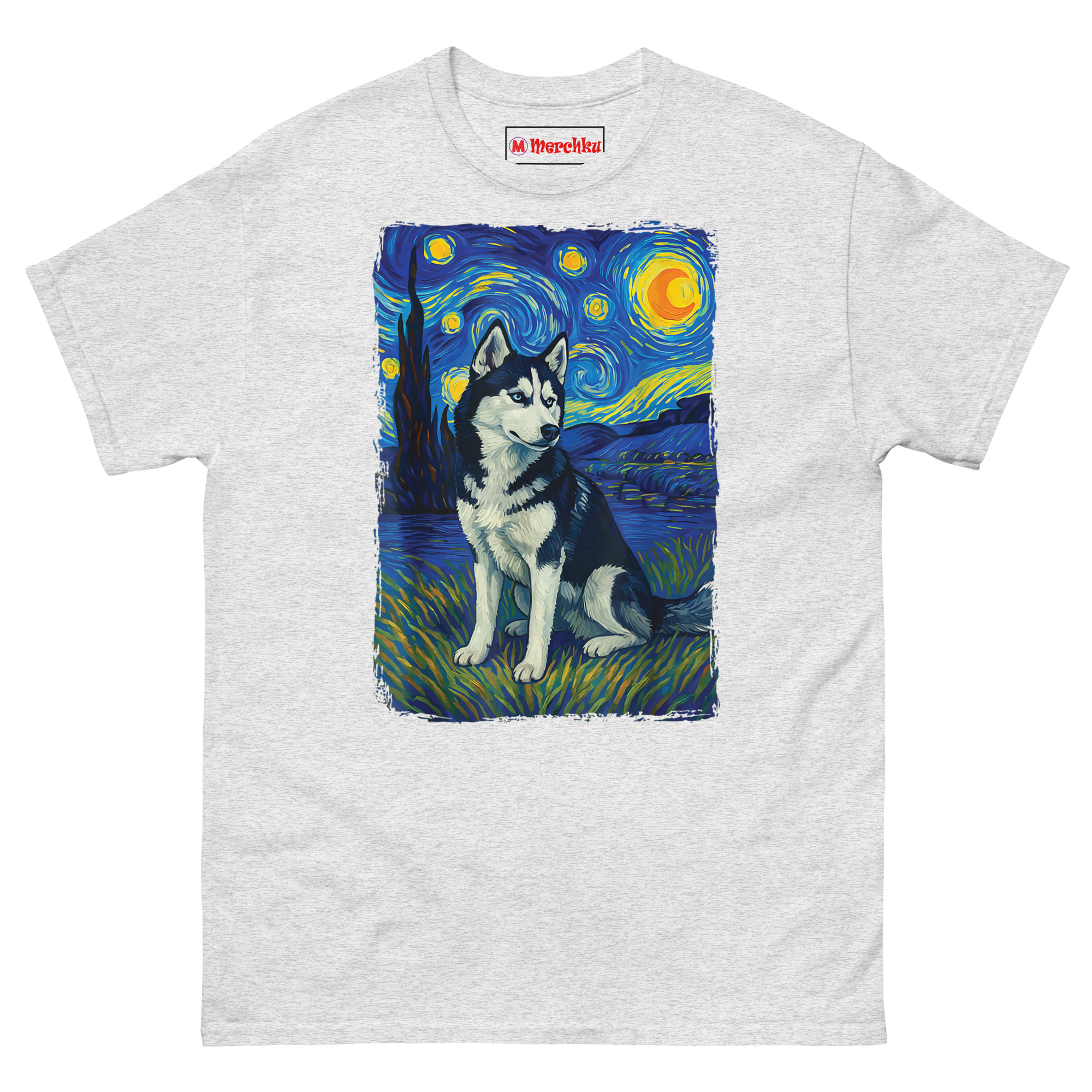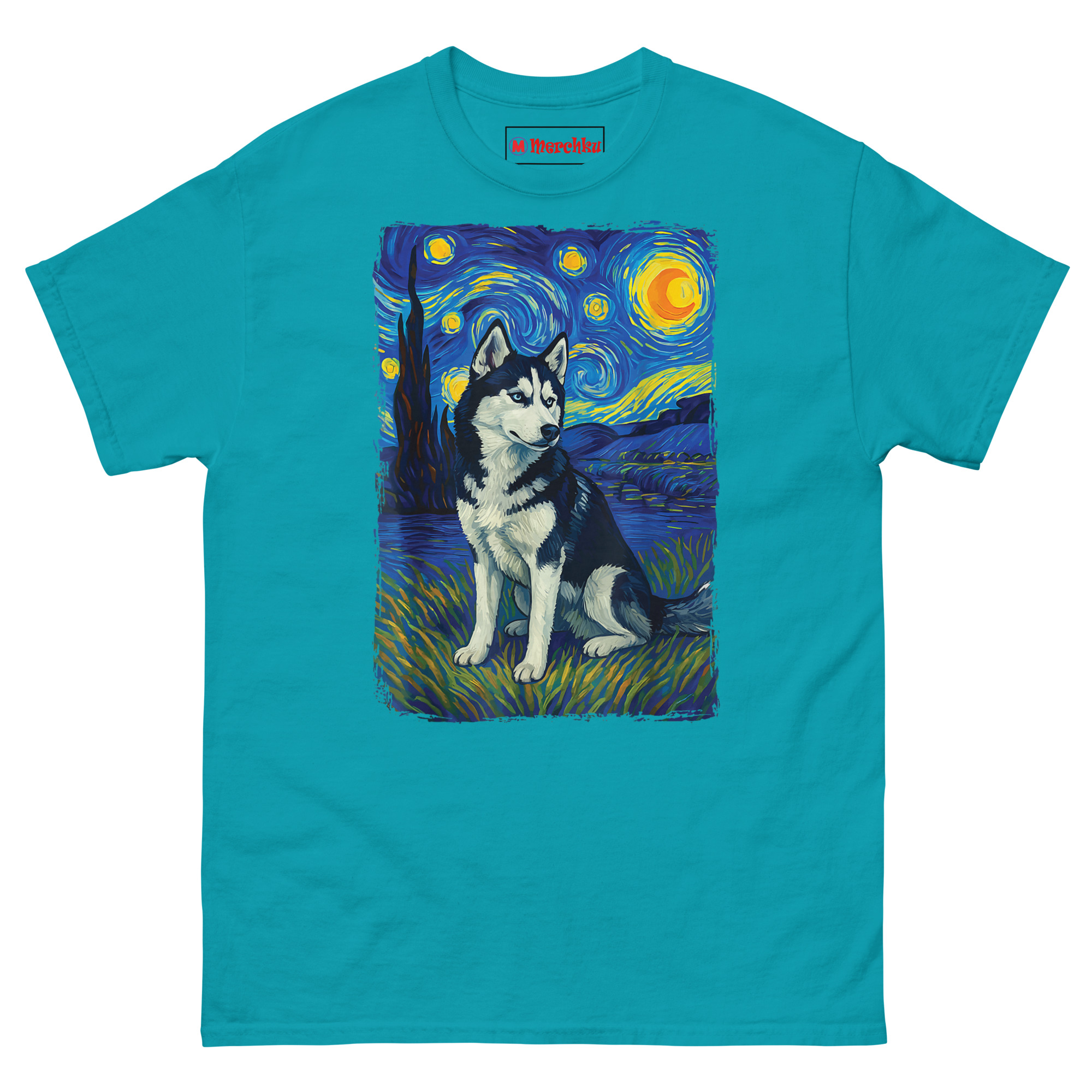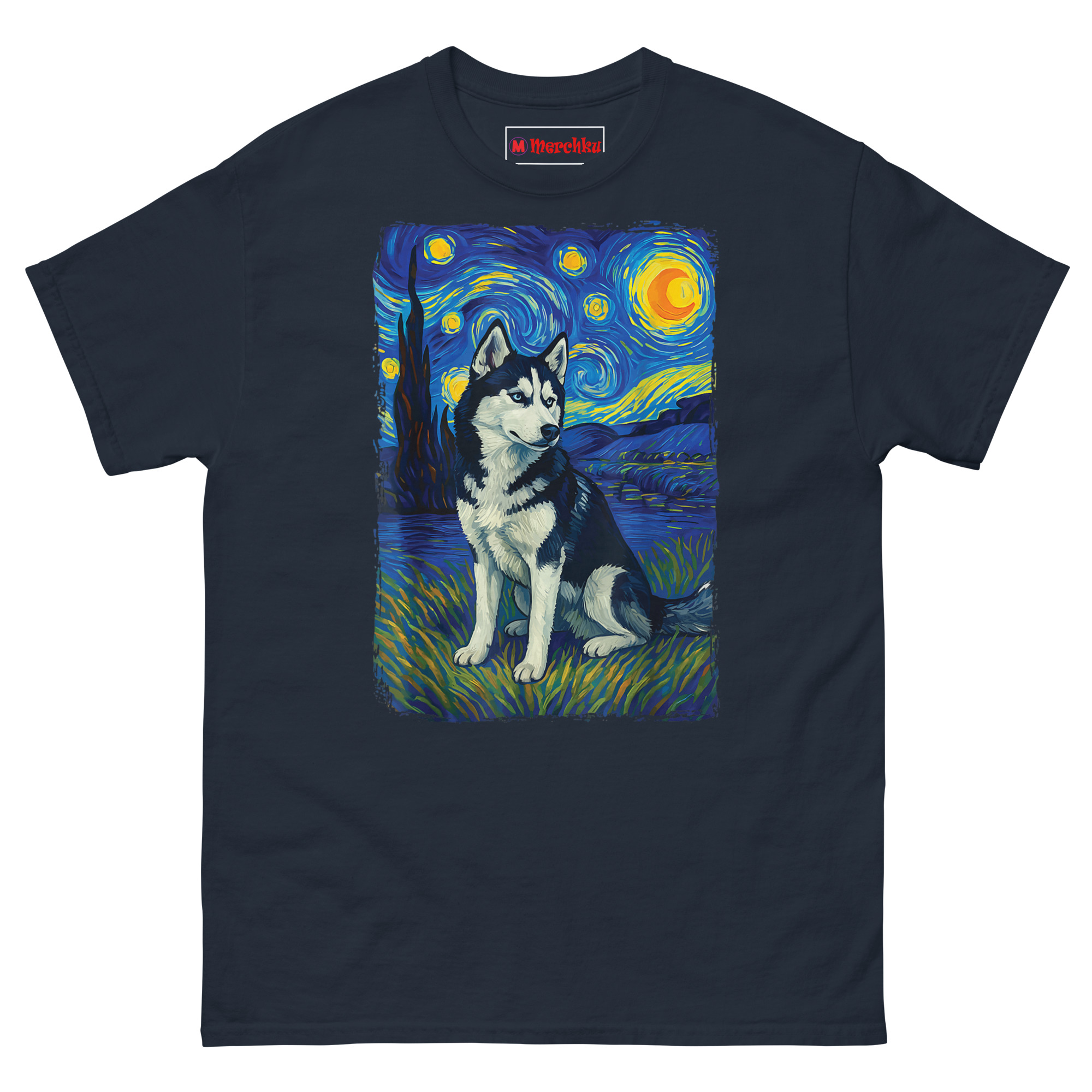 Instead of just printing a dog on a shirt, we reimagined the husky as the centerpiece of “The Starry Night.” The result turns your pet into the star of their own universe. You’ll notice the husky sits proudly in the foreground, rendered with lifelike detail. Behind him, the sky swirls with those iconic blue nebulae and glowing yellow stars that Van Gogh made famous.