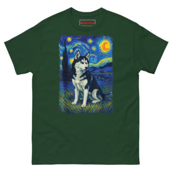 This Starry Night Husky T Shirt combines a beloved pet with one of history’s most famous paintings. It puts a realistic Siberian Husky right into Van Gogh’s classic 1889 masterpiece, making it a smart choice for dog lovers who appreciate fine art. We designed this tee specifically for husky owners who want something more distinctive than the usual pet apparel.