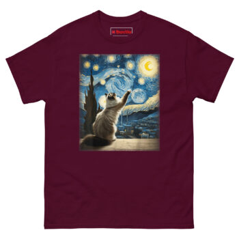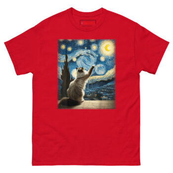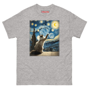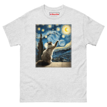 The Starry Night Ragdoll Cat T Shirt places a fluffy feline directly into one of history’s most famous paintings. This graphic tee combines Van Gogh’s iconic swirling sky with a seal-point Ragdoll playfully batting at the stars. Designed for art history enthusiasts, cat owners, and anyone who appreciates a clever classic art spoof.