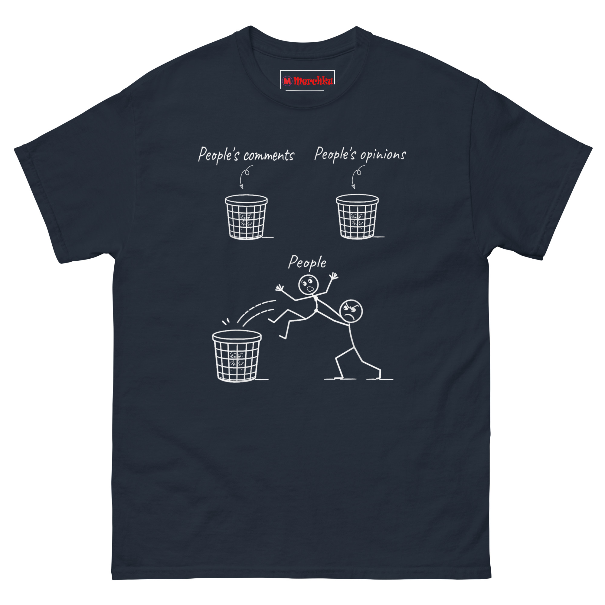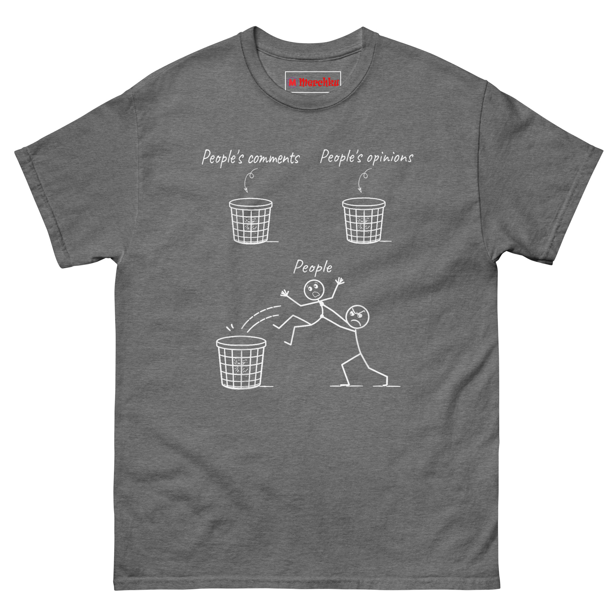That sticky note became this design. Three wire trash cans sit in a row. Arrows point from “People’s comments” and “People’s opinions” down into the bins. Then the main action: an angry stick figure with sharp, slanted eyebrows grabs a shocked stick figure and physically hoists him toward the third can. Below that, the word “People” identifies the final target. The whole thing uses a raw, doodle-like white line art on a dark background. This is Sarcastic stick man line art clothing for anyone who believes peace comes from good boundaries and a little bit of trash.
