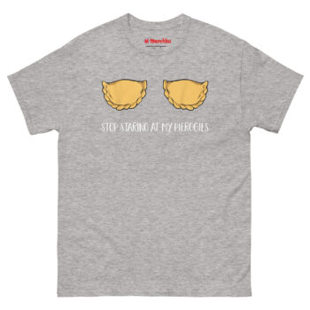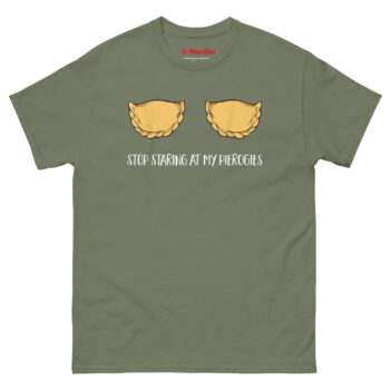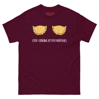 The Stop Staring at My Pierogies T Shirt pairs a bold, defensive message with two beautifully illustrated dumplings placed front and center. It’s designed for Polish-American women with a sharp sense of humor who appreciate the double meaning and want to showcase their Slavic soul food pride.