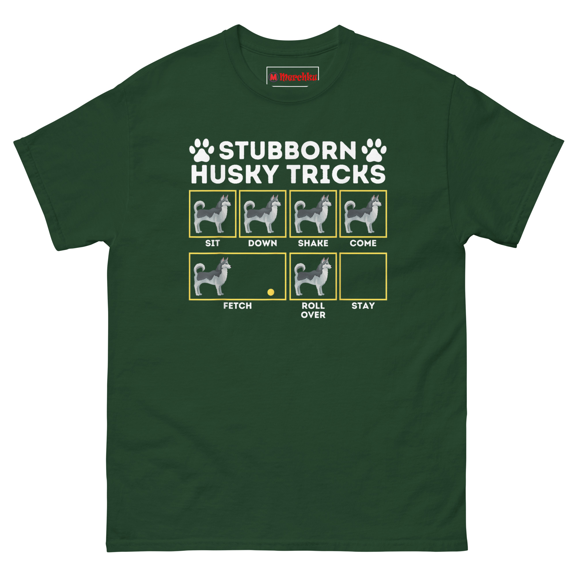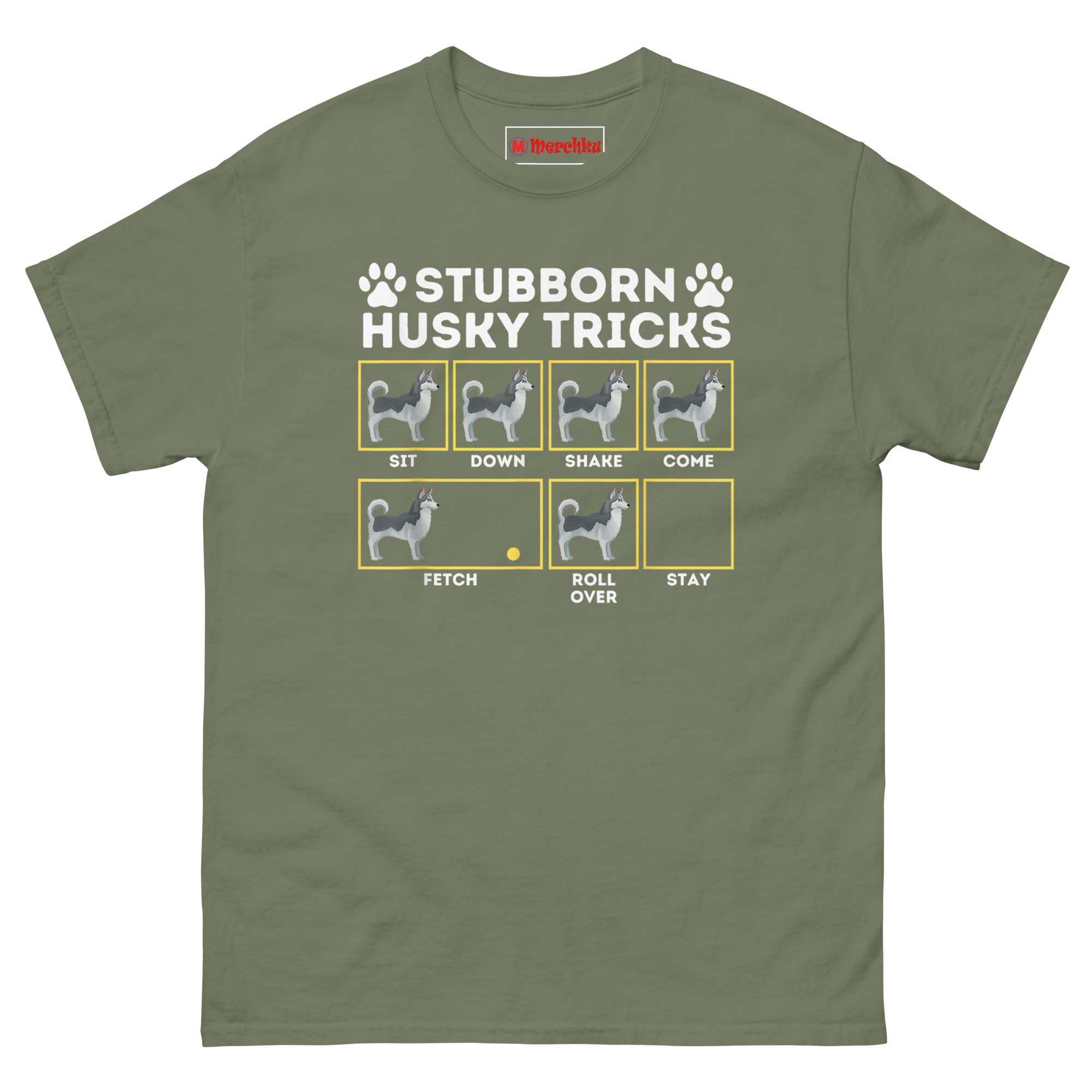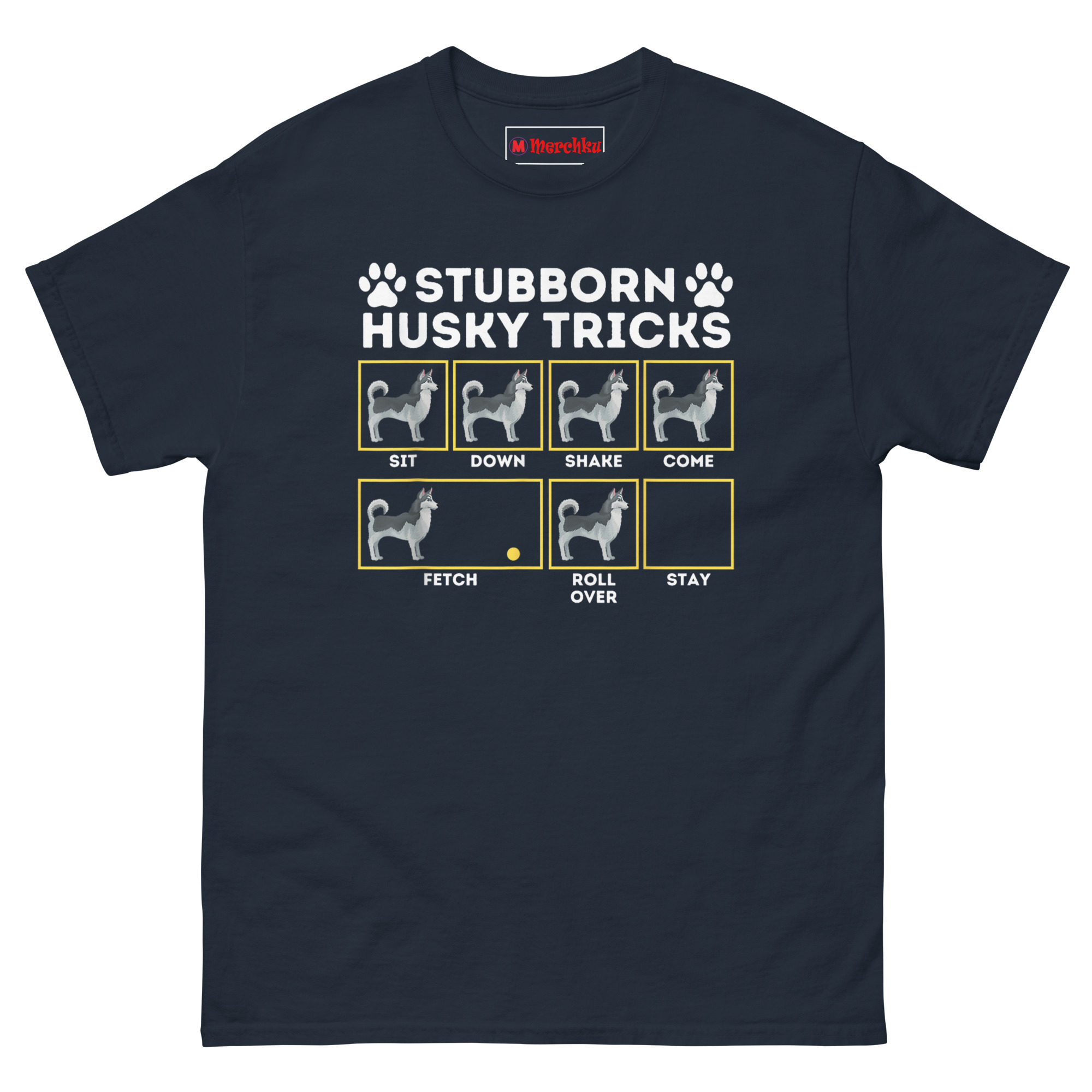 The layout mimics a serious training guide. Six yellow-bordered boxes line up in a grid, each labeled with a command: SIT, DOWN, SHAKE, COME, FETCH, ROLL OVER. Inside every box, the Husky illustration stands upright and still, completely ignoring the ball in the FETCH frame, refusing to budge for anything. The final box labeled STAY sits empty, because apparently that’s the only command the dog ever follows. Two paw prints flank the title at the top. It’s accurate enough to make any Husky owner laugh and nod at the same time.