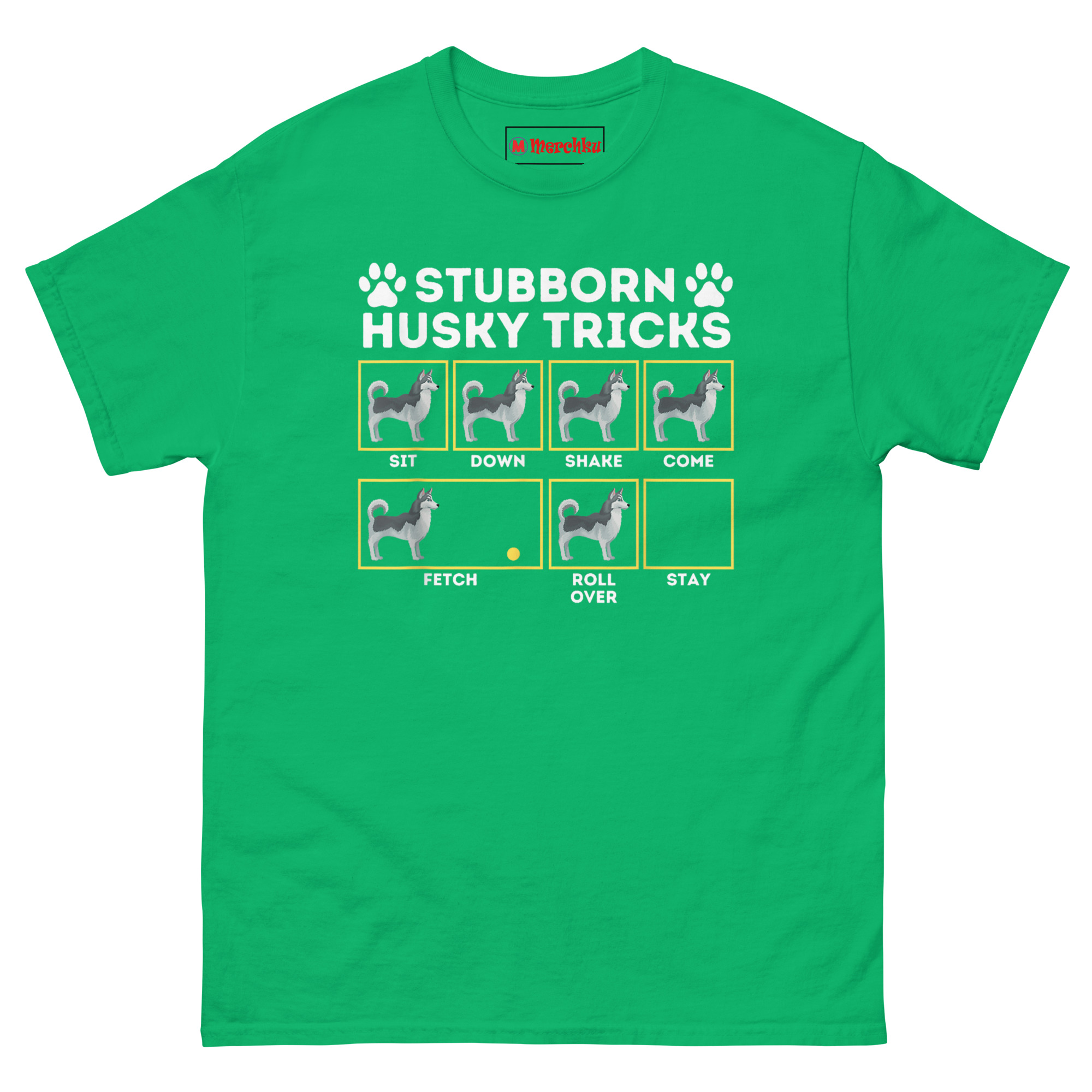 The Stubborn Husky Tricks T Shirt presents a six-box infographic showing standard dog commands alongside a Husky who ignores every single one. It’s designed for owners who’ve experienced the unique challenge of training a breed that hears you perfectly but chooses not to respond.