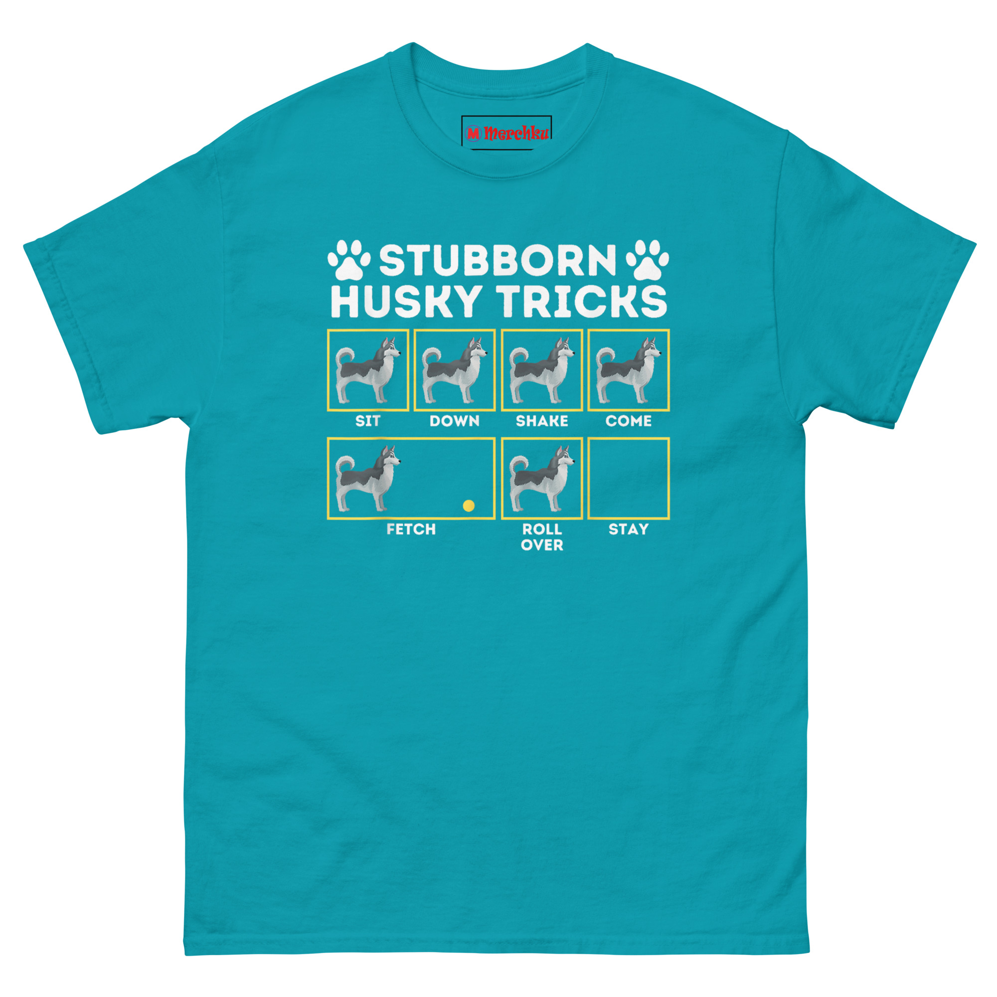 This concept Stubborn Husky Tricks T Shirt came straight from a training class that went nowhere. The owner spent weeks teaching “sit,” “down,” and “come.” The Husky spent those weeks looking everywhere except at the trainer. By the final session, the dog had mastered exactly one thing: doing whatever it wanted.