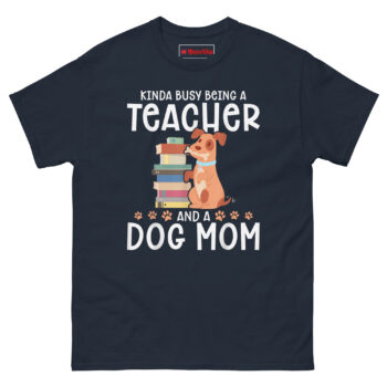 The Teacher And A Dog Mom T Shirt is a playful, graphic tee designed for women who juggle lesson plans at school and puppy love at home. What makes it unique is the whimsical illustration of a book stack next to a cheerful dog with an eye patch, paired with the honest admission of being “kinda busy.” It is made for educators, classroom staff, and any pet parent who knows the rewarding chaos of teaching by day and cuddling a canine companion by night.