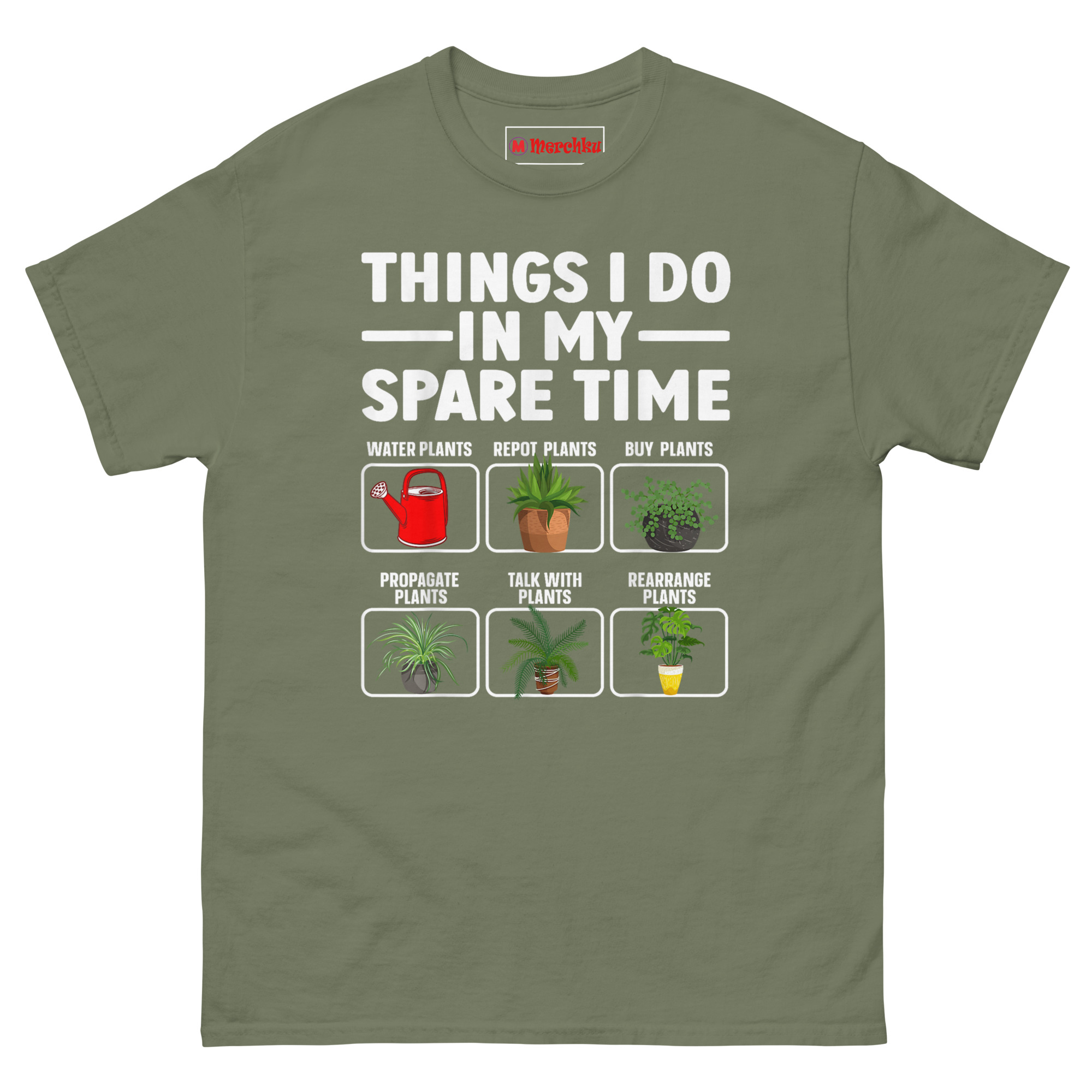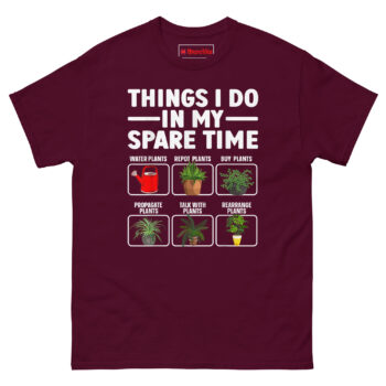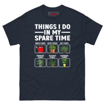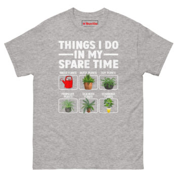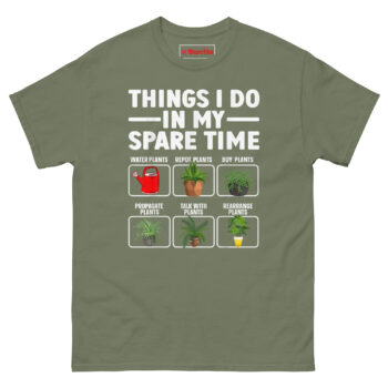 Things I Do in My Spare Time T Shirt idea came from a conversation with a friend who couldn’t explain where her weekends went. She’d start Saturday with a plan to relax, and suddenly it was Sunday evening and she’d spent the entire time watering, pruning, propagating, and moving plants around for better light. “I don’t even know how it happens,” she said. “It’s just… all I do.”