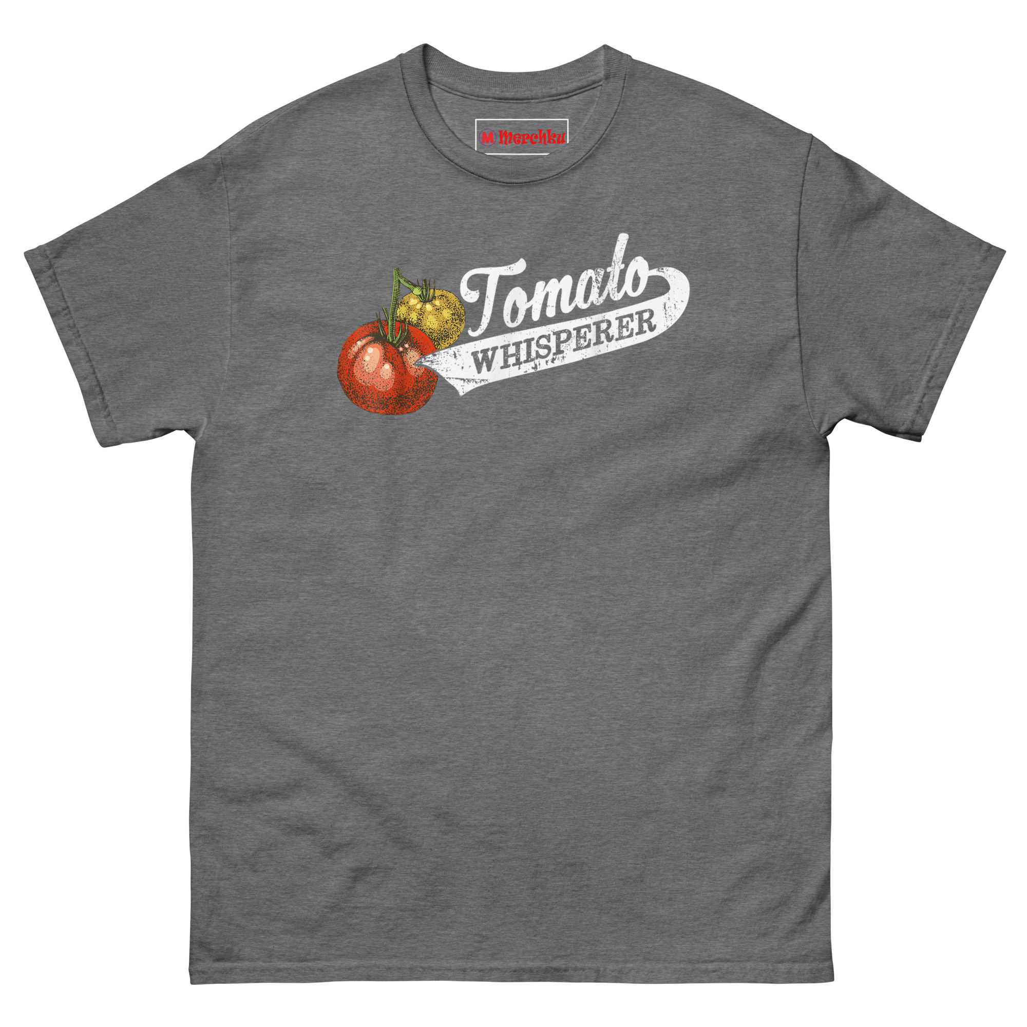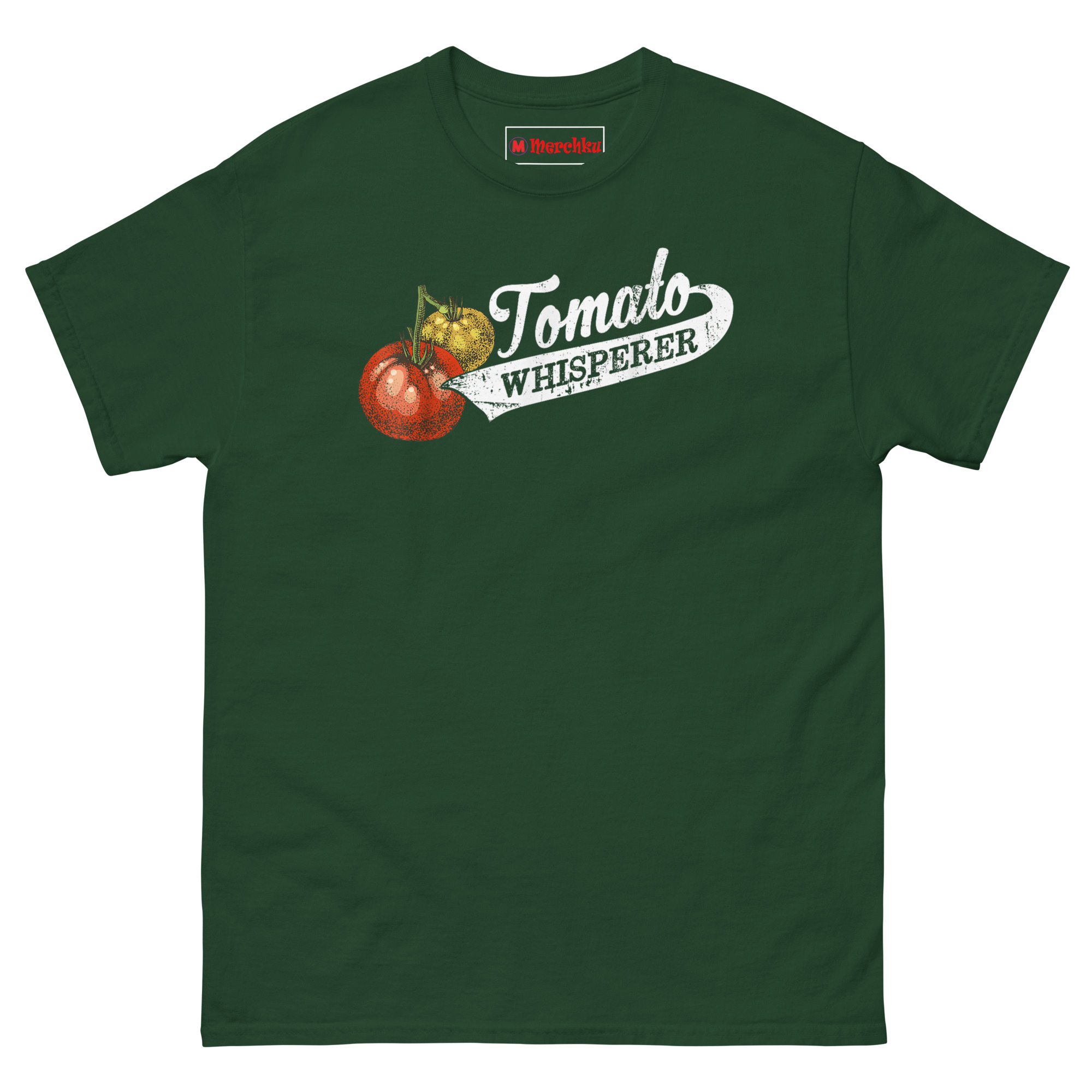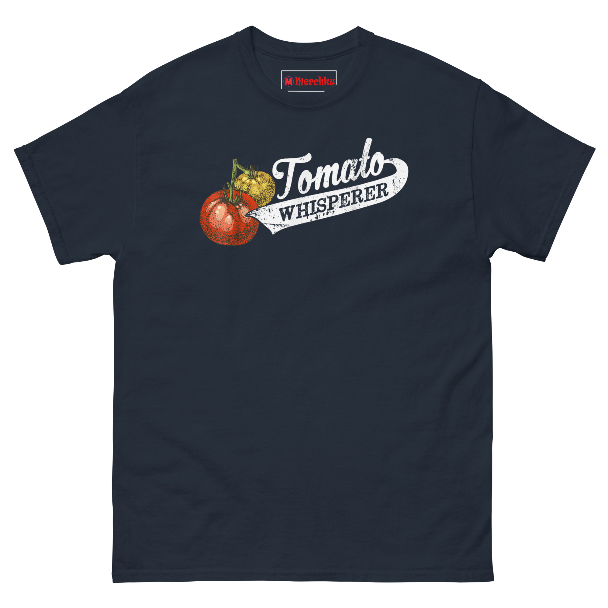 That’s where the “whisperer” idea came from. Growing the perfect tomato really does take a special kind of patience and intuition. It’s knowing when they need water, when to pinch back suckers, and when to just let them be. We wanted a design that looked like it belonged on an old seed sack or a vintage farm sign. The stippled tomato illustration has that classic botanical print feel. The cursive “Tomato” flows into a bold, distressed “WHISPERER” inside a ribbon banner, like a medal for your gardening achievements. It’s the perfect retro botanical graphic tee for gardeners who take their harvest seriously.