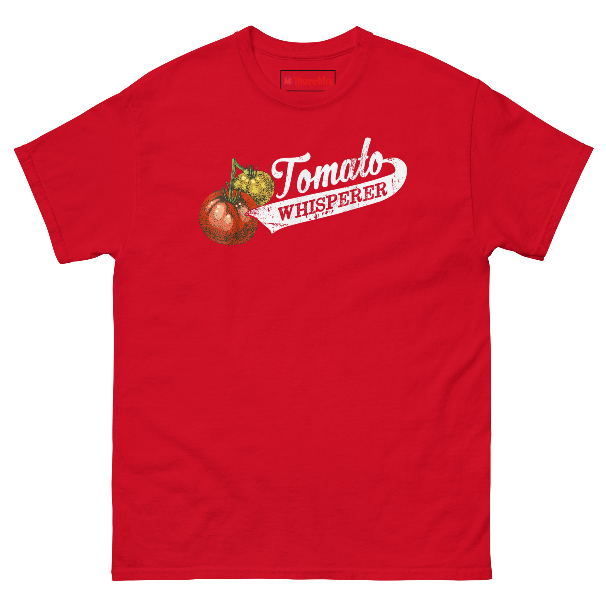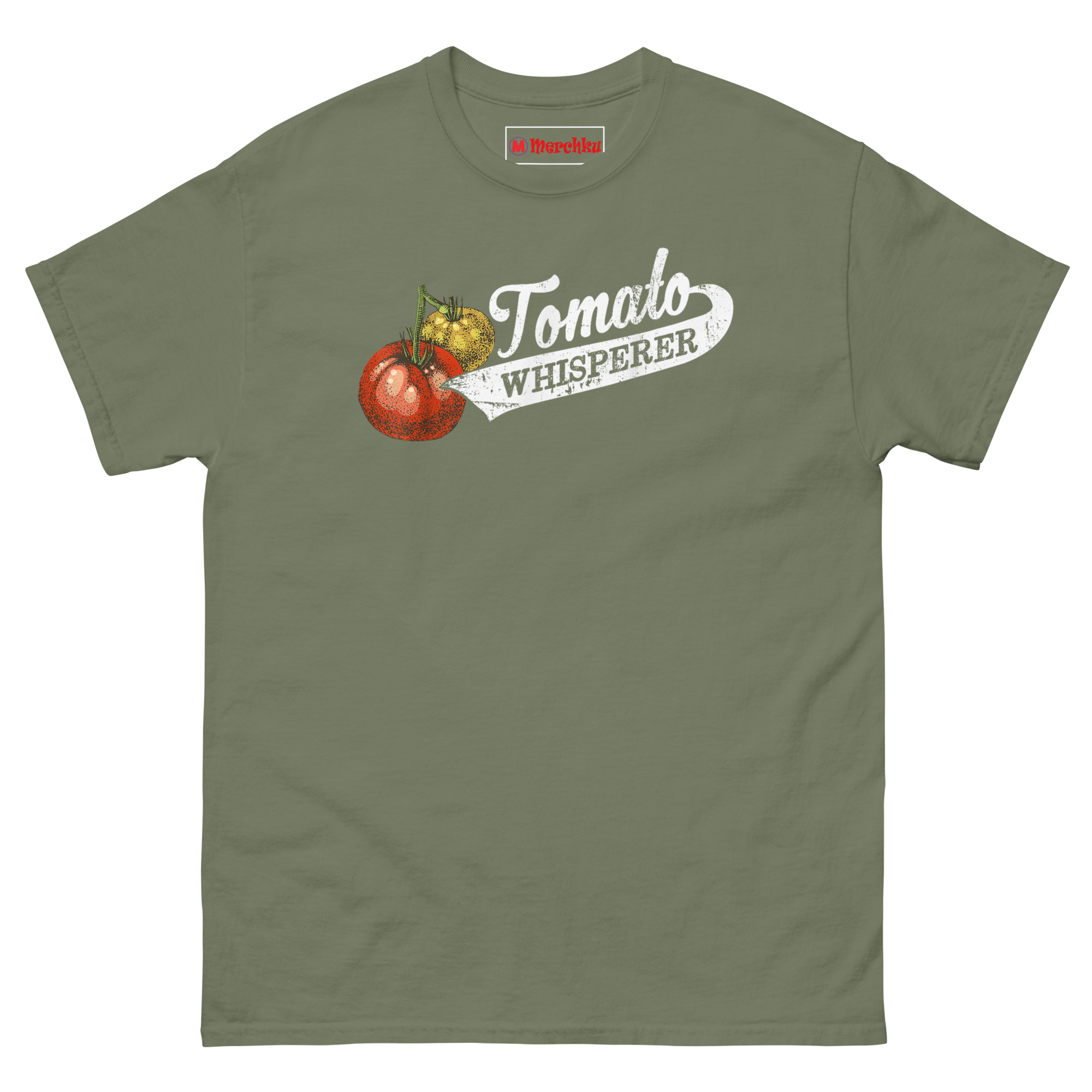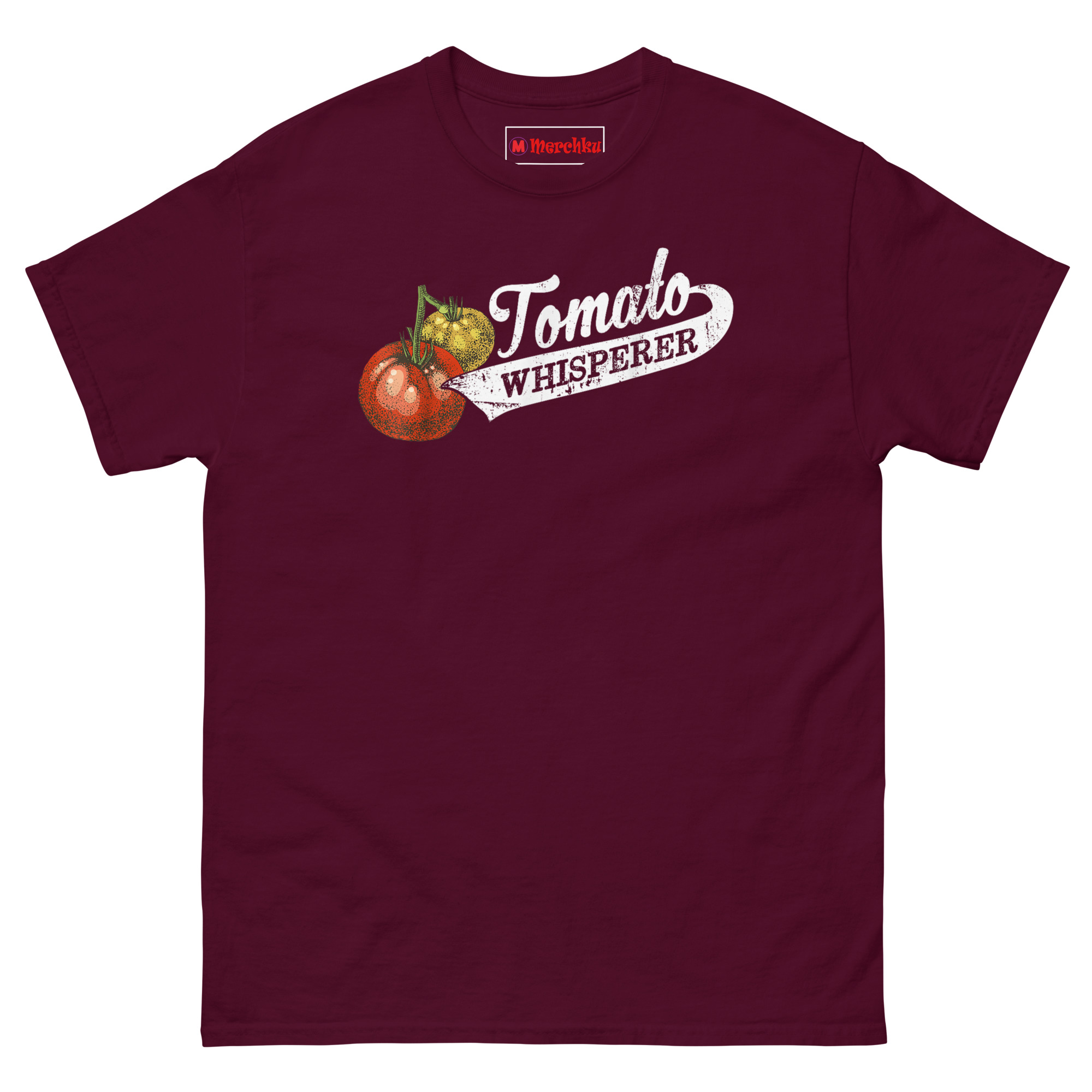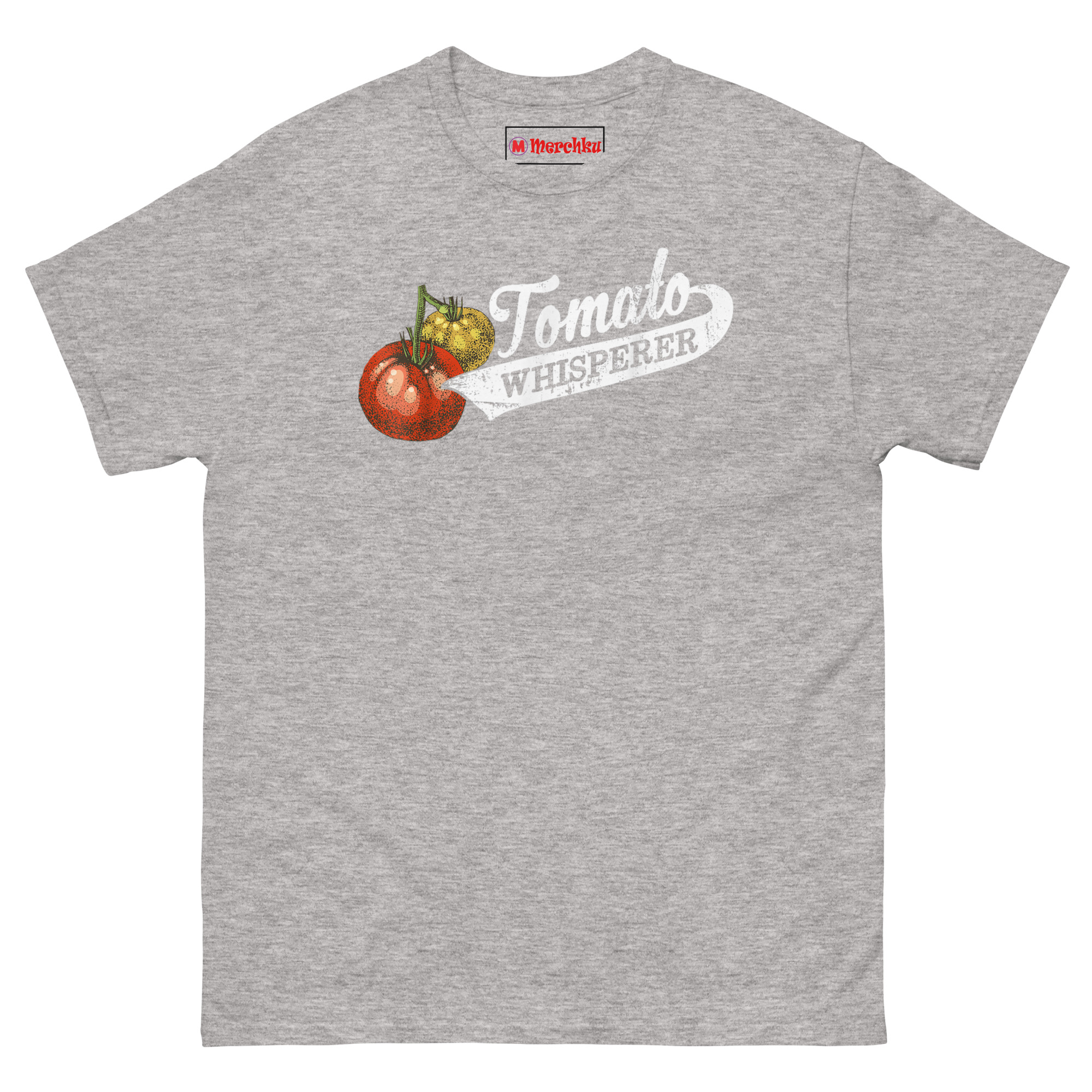 That’s where the “whisperer” idea came from. Growing the perfect tomato really does take a special kind of patience and intuition. It’s knowing when they need water, when to pinch back suckers, and when to just let them be. We wanted a design that looked like it belonged on an old seed sack or a vintage farm sign. The stippled tomato illustration has that classic botanical print feel. The cursive “Tomato” flows into a bold, distressed “WHISPERER” inside a ribbon banner, like a medal for your gardening achievements. It’s the perfect retro botanical graphic tee for gardeners who take their harvest seriously.