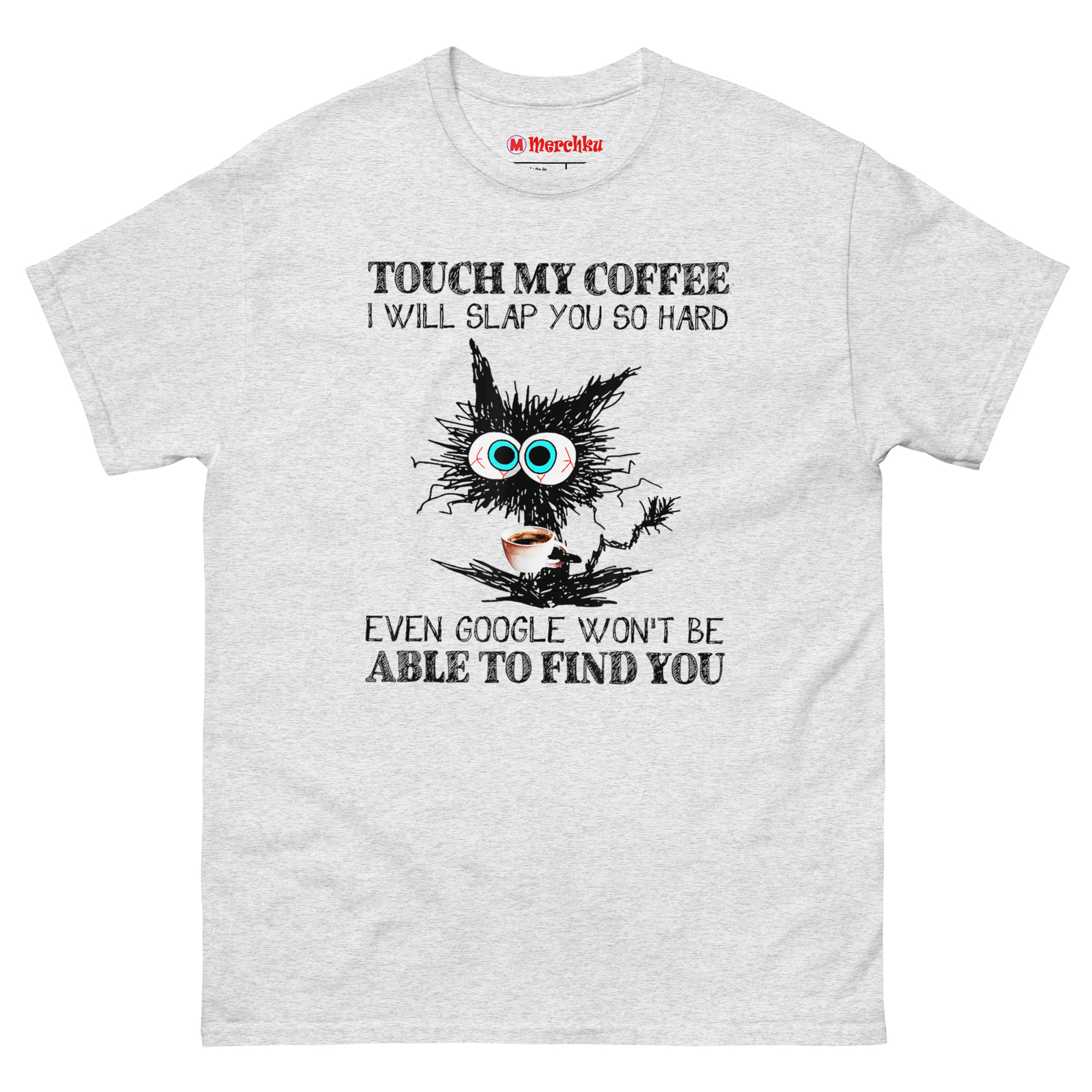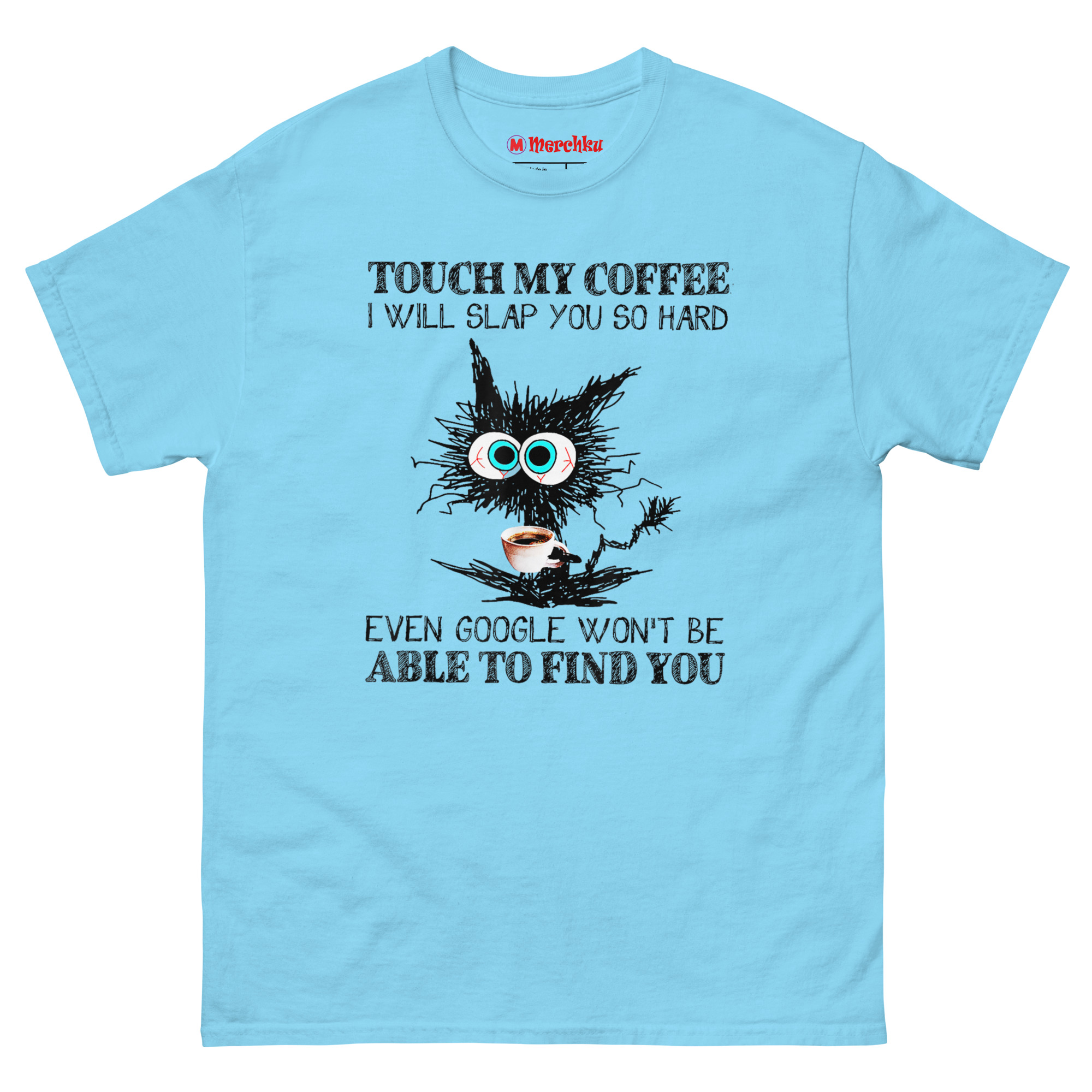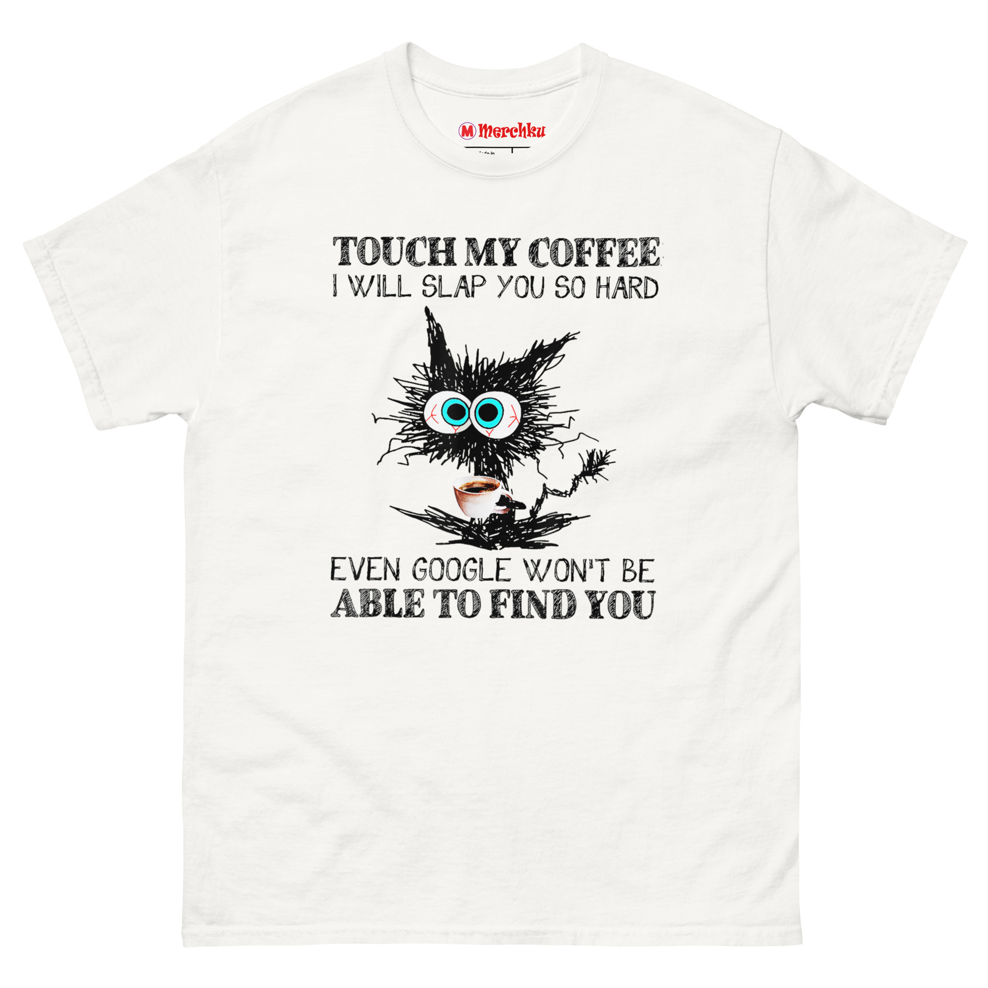 The Touch My Coffee I Will Slap You So Hard T Shirt features a wild-eyed, scribbled black cat clutching a coffee cup, paired with a punchline about Google not being able to find you. It captures that raw, unfiltered moment before caffeine kicks in, when boundaries need to be clear. This shirt is built for anyone whose morning mood is best communicated through a warning label.