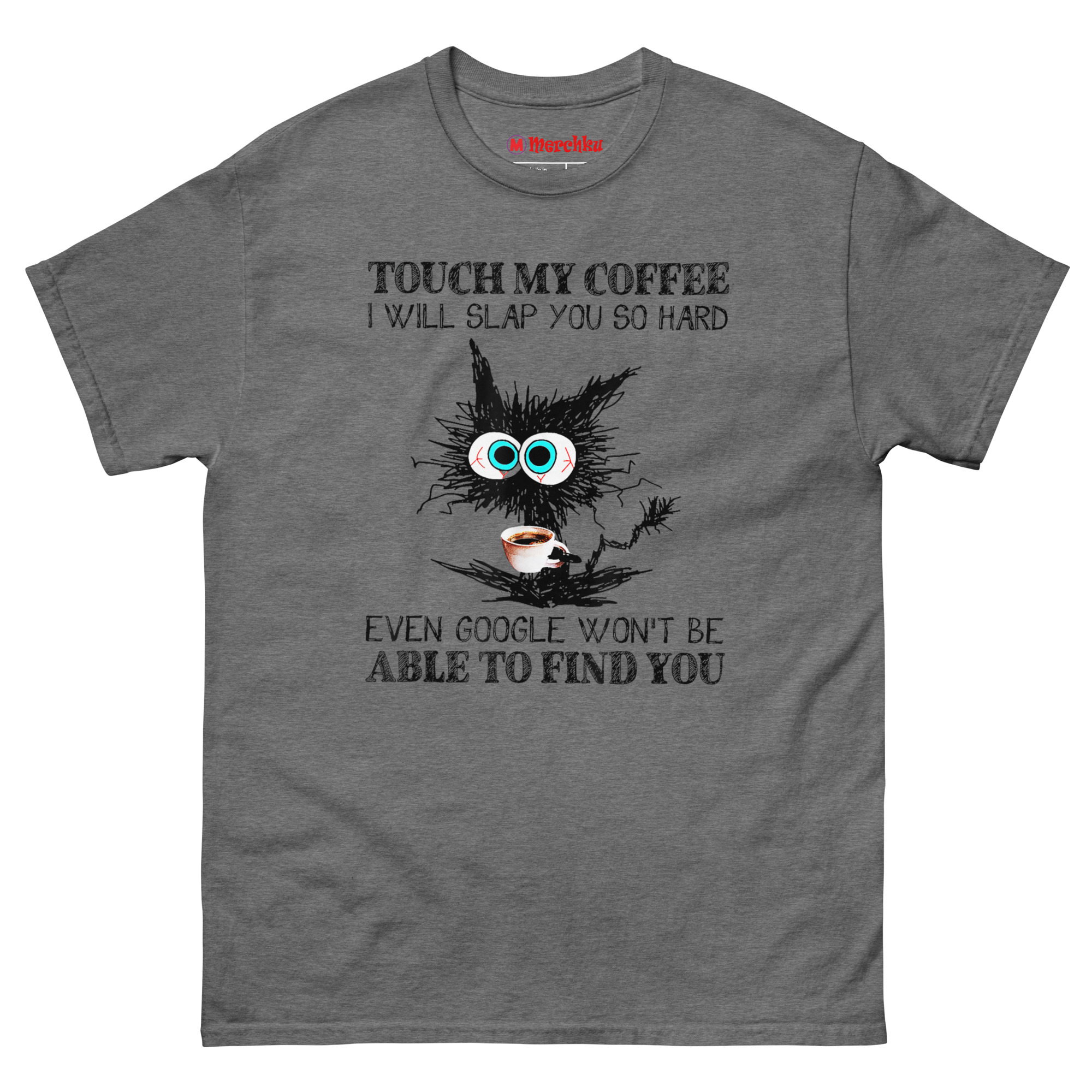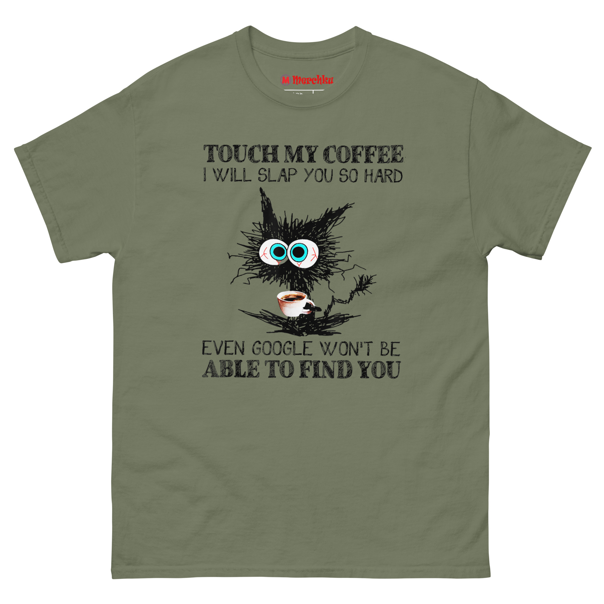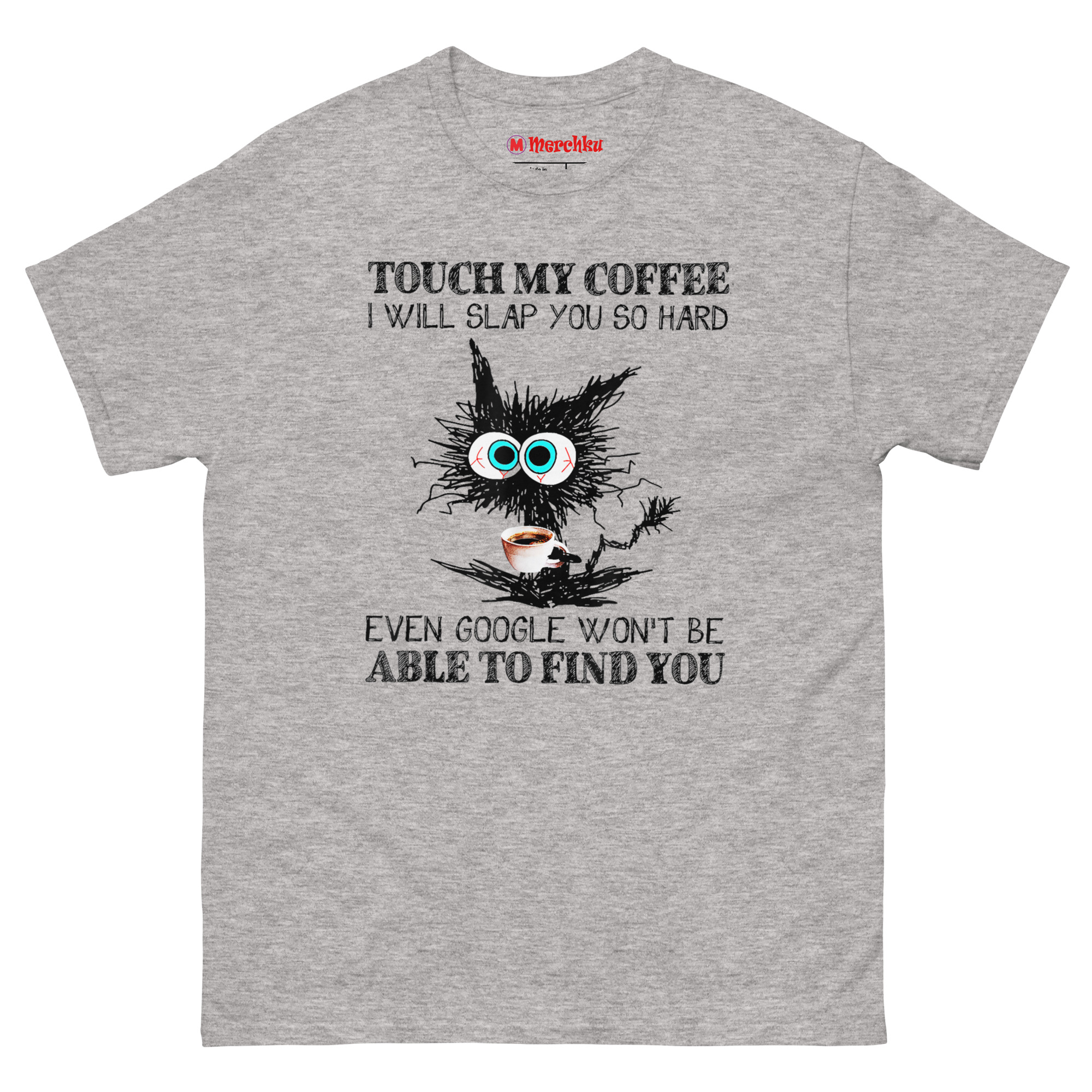 The Touch My Coffee I Will Slap You So Hard T Shirt features a wild-eyed, scribbled black cat clutching a coffee cup, paired with a punchline about Google not being able to find you. It captures that raw, unfiltered moment before caffeine kicks in, when boundaries need to be clear. This shirt is built for anyone whose morning mood is best communicated through a warning label.