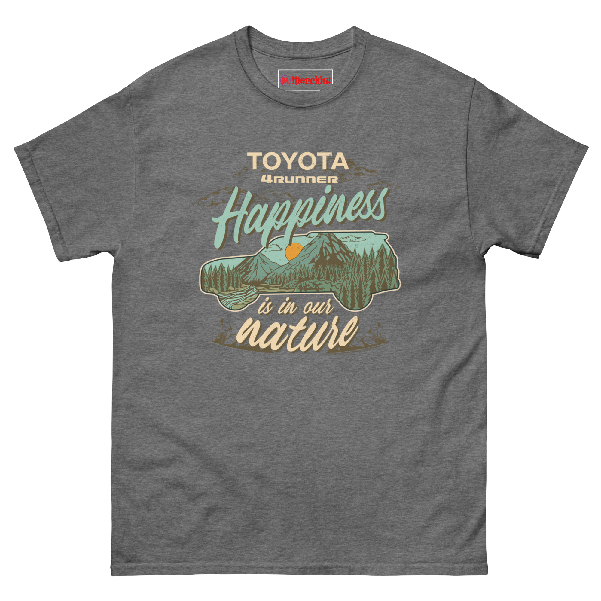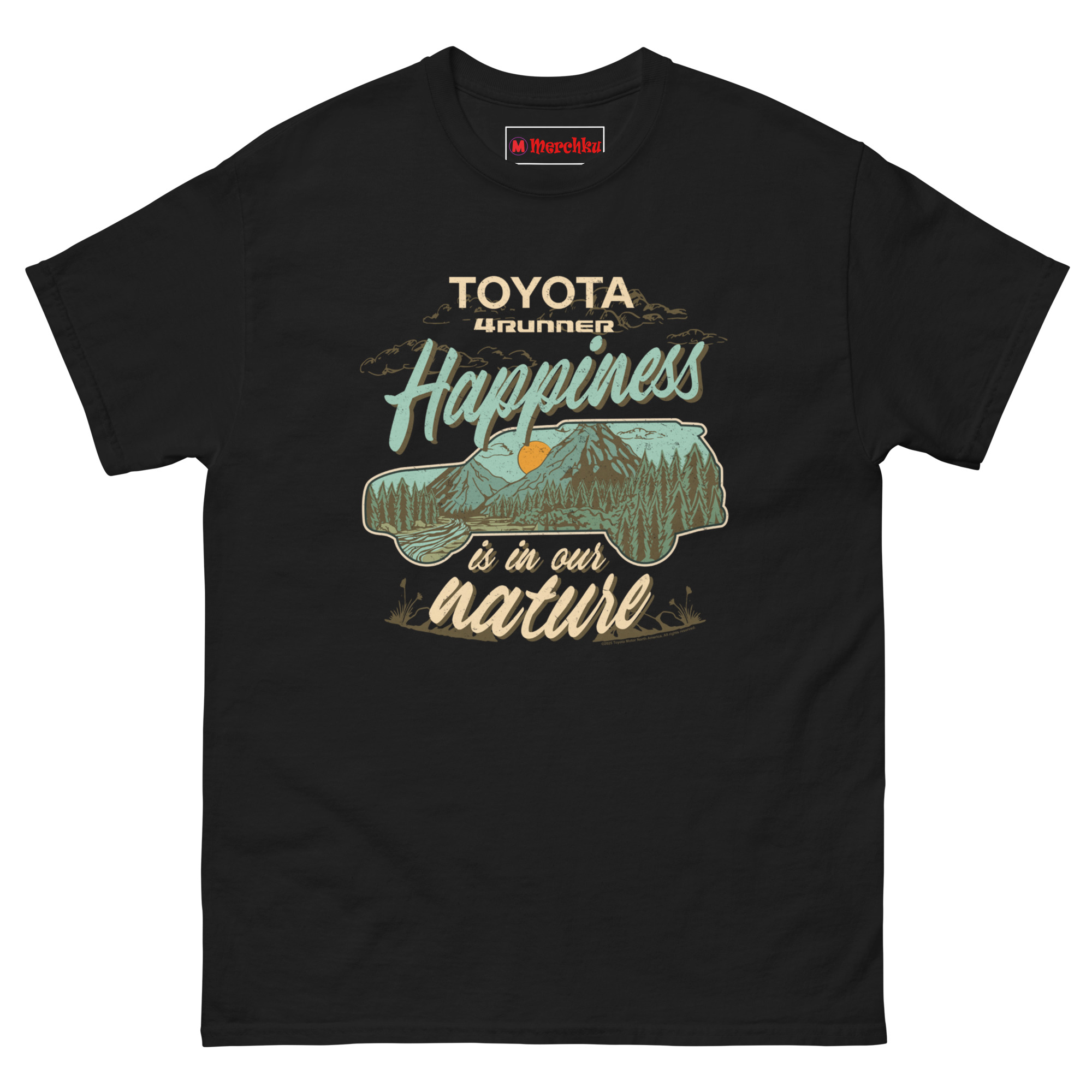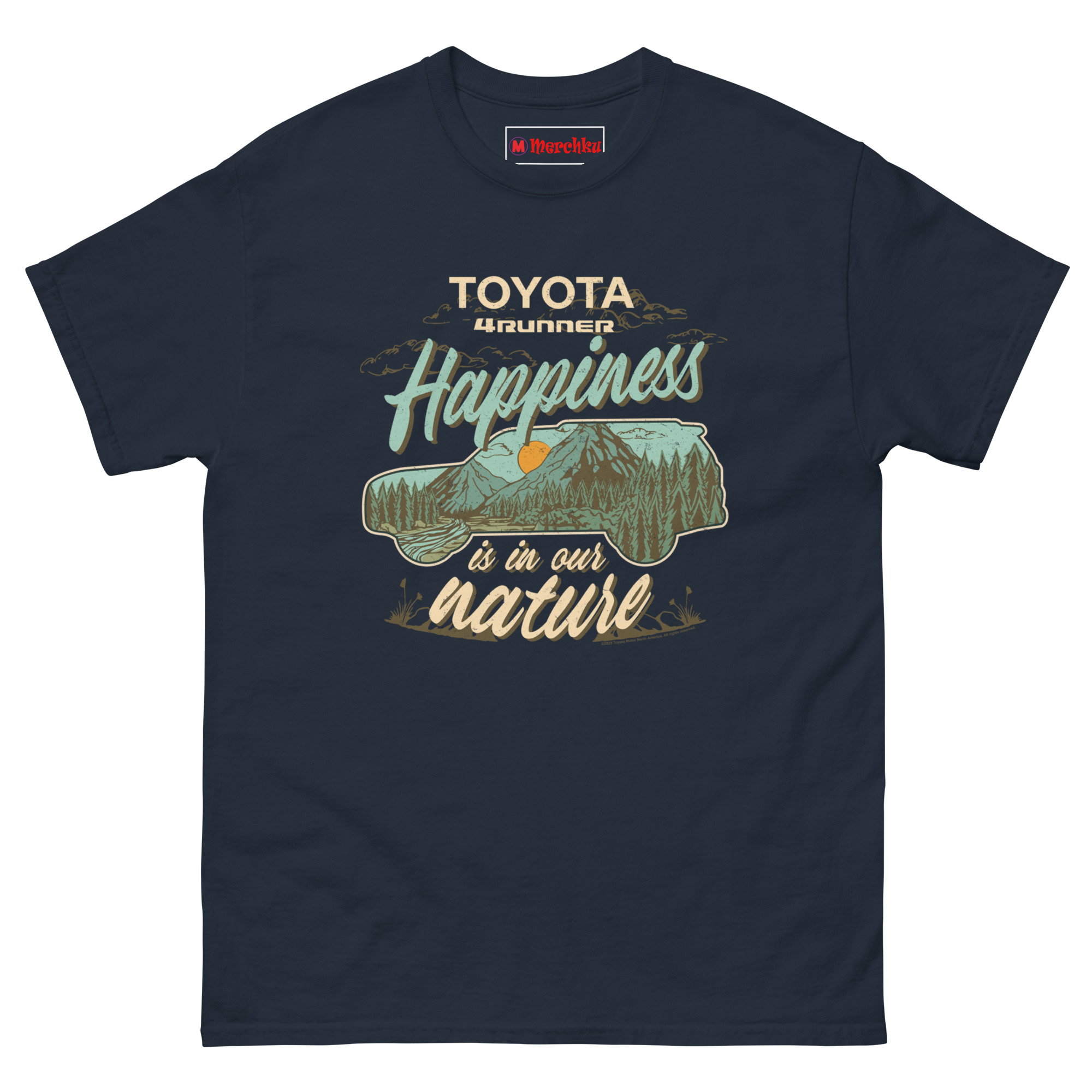 That line stuck. So we built a design that blends vehicle and landscape into one image. The silhouette of a 4Runner acts as a window to the wild. Inside, a retro-style illustration shows layered pine forests, jagged mountain peaks, and a warm burnt orange sunset. The color palette uses muted earth tones teal, tan, forest green, and orange, giving it a genuine 1970s outdoor heritage feel. The slogan “Happiness is in our nature” wraps around the center, with flowing vintage script for “Happiness” and “nature.” This is Vintage Toyota 4Runner mountain graphic tee for overlanders who know the journey and the destination are the same thing.