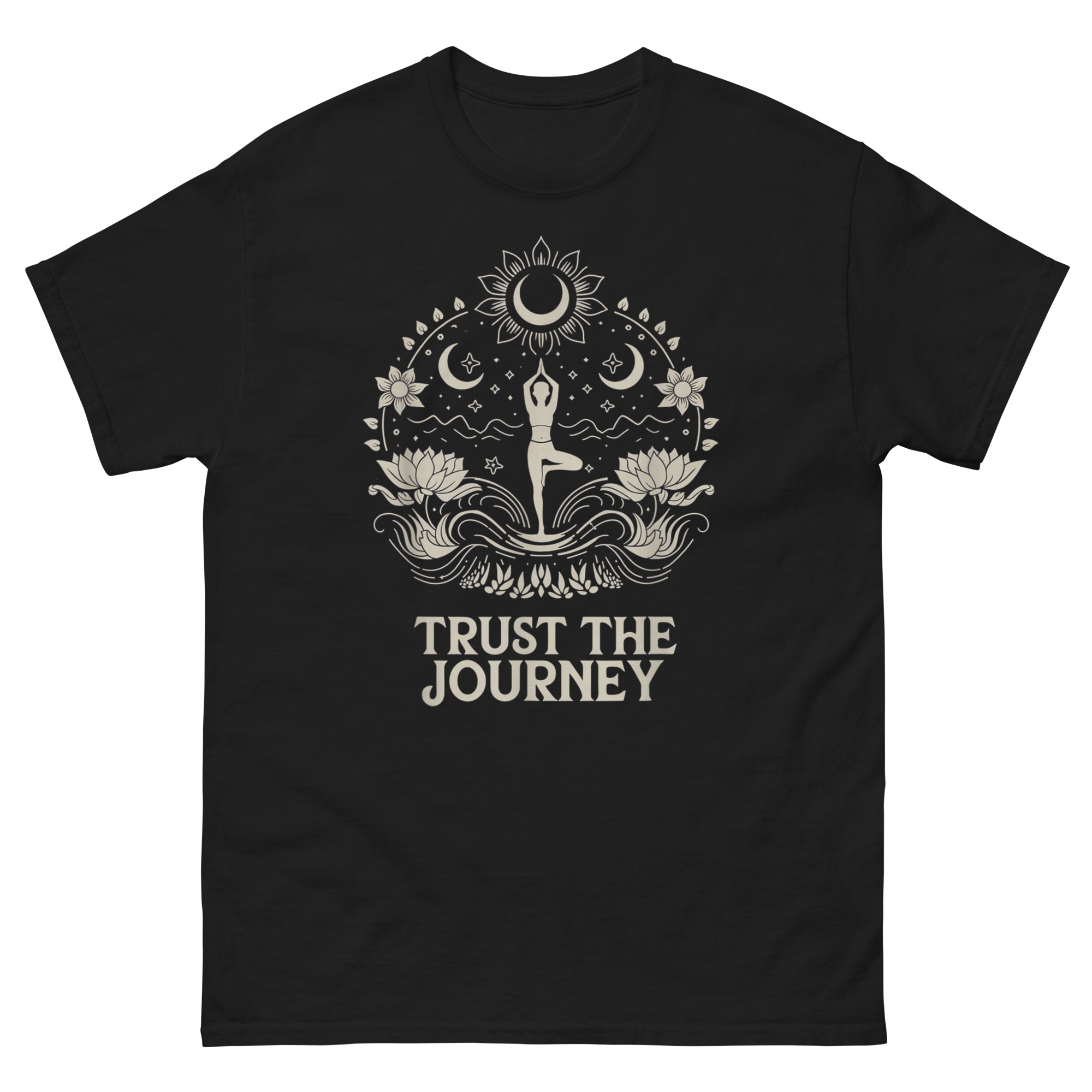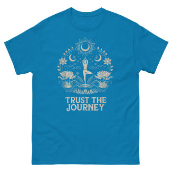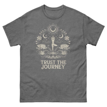 This Trust The Journey Yoga T Shirt design grew from a conversation about what it really means to “trust the journey.” It’s easy to say when things are going well. Harder to remember when life feels chaotic. We wanted to create a visual anchor, something that captures the idea that we’re always connected to something larger. The circular composition centers on a woman in Vrksasana (Tree Pose), rooted and balanced. Above her, a sun holds a crescent moon at its core, representing the union of opposing energies. Two moons flank the center, surrounded by stars and sparkles, while at the base, lotus flowers bloom from stylized waves, symbolizing purity rising from deep waters. The entire piece is framed by organic leaves and vines. Below it all, “TRUST THE JOURNEY” appears in a vintage-inspired serif font. It’s a reminder that we’re standing between the earth below and the cosmos above, and both are part of the path.