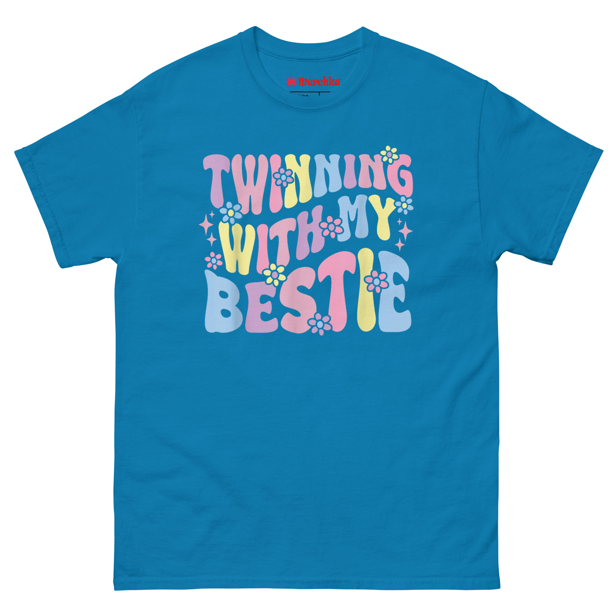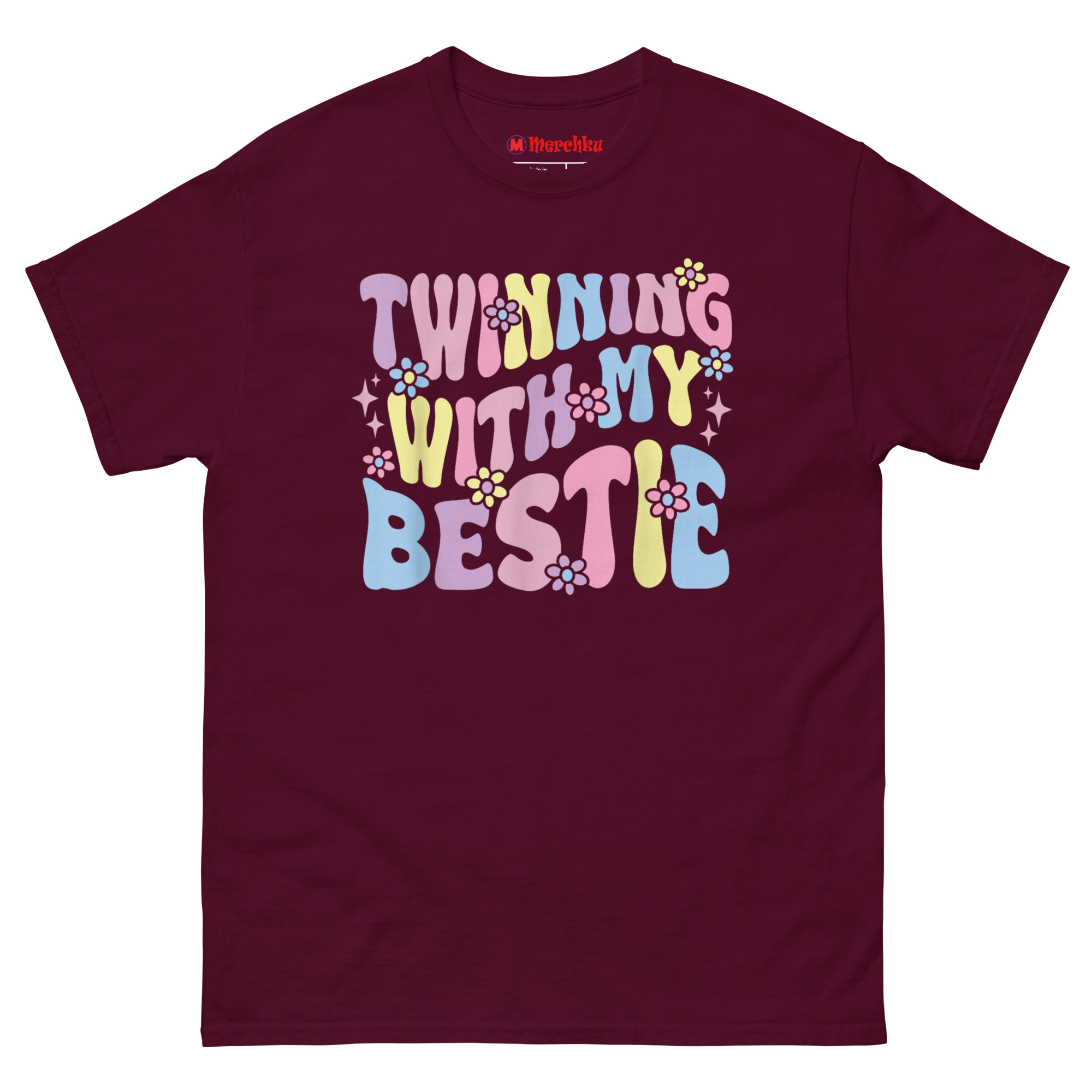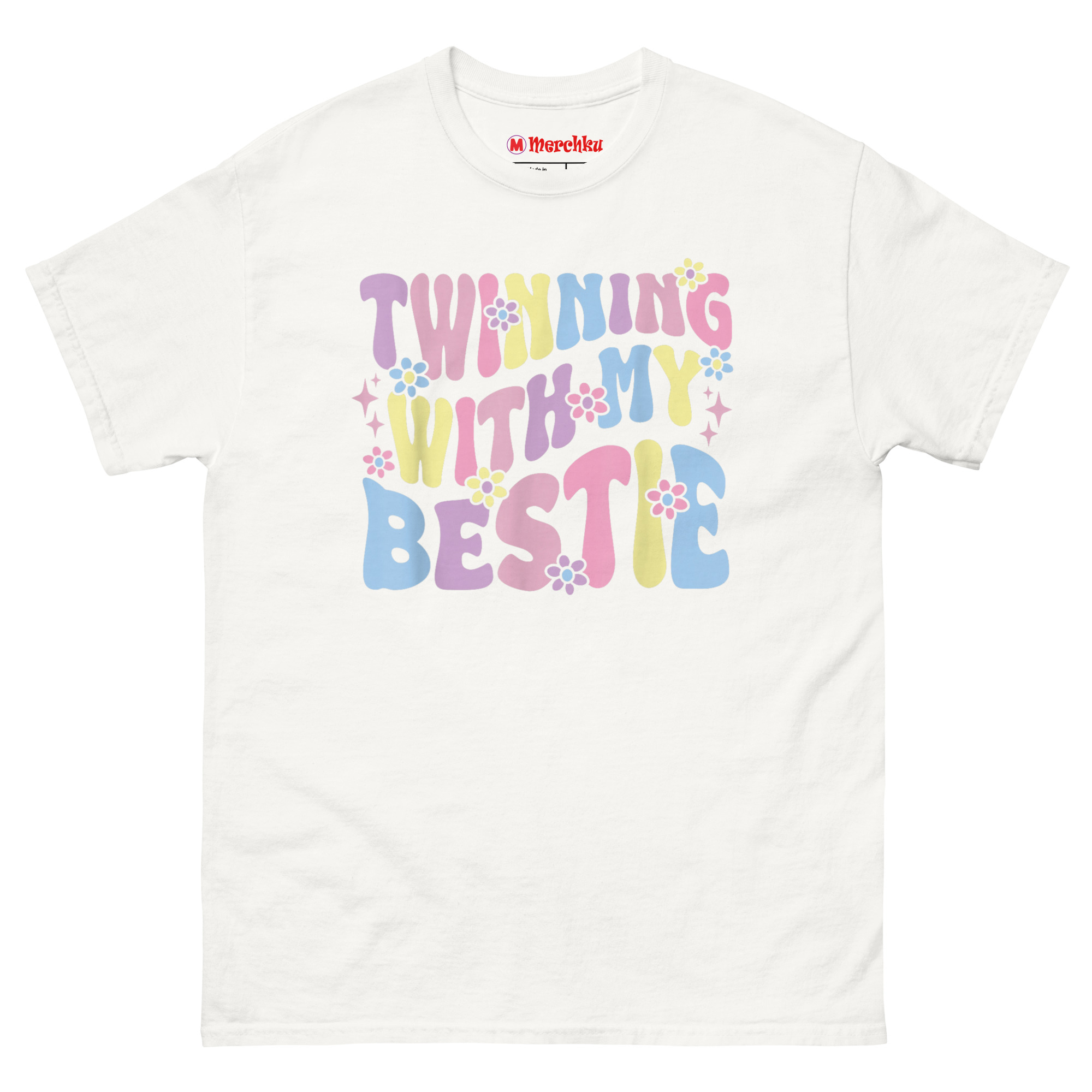 The Twinning with My Bestie T Shirt is a comfortable, 100% cotton classic tee designed specifically for best friends who want to showcase their bond. What makes it unique is its custom “Warped Retro” graphic, which combines a 70s aesthetic with soft pastel colors and hand-drawn daisies. Itโs the perfect matching set for friends, sisters, or anyone looking for good presents for friends that go beyond a basic gift.