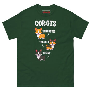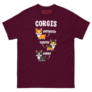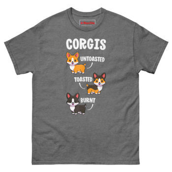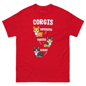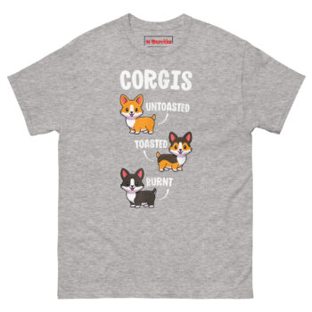 The Untoasted Toasted Burnt Corgi T Shirt serves up breakfast humor with a side of canine cuteness. This tee features three cartoon Corgis in different fur shades, labeled “Untoasted,” “Toasted,” and “Burnt” under the bold title “CORGIS.” Designed for dog lovers who appreciate visual puns and want to celebrate coat color diversity with a smile.