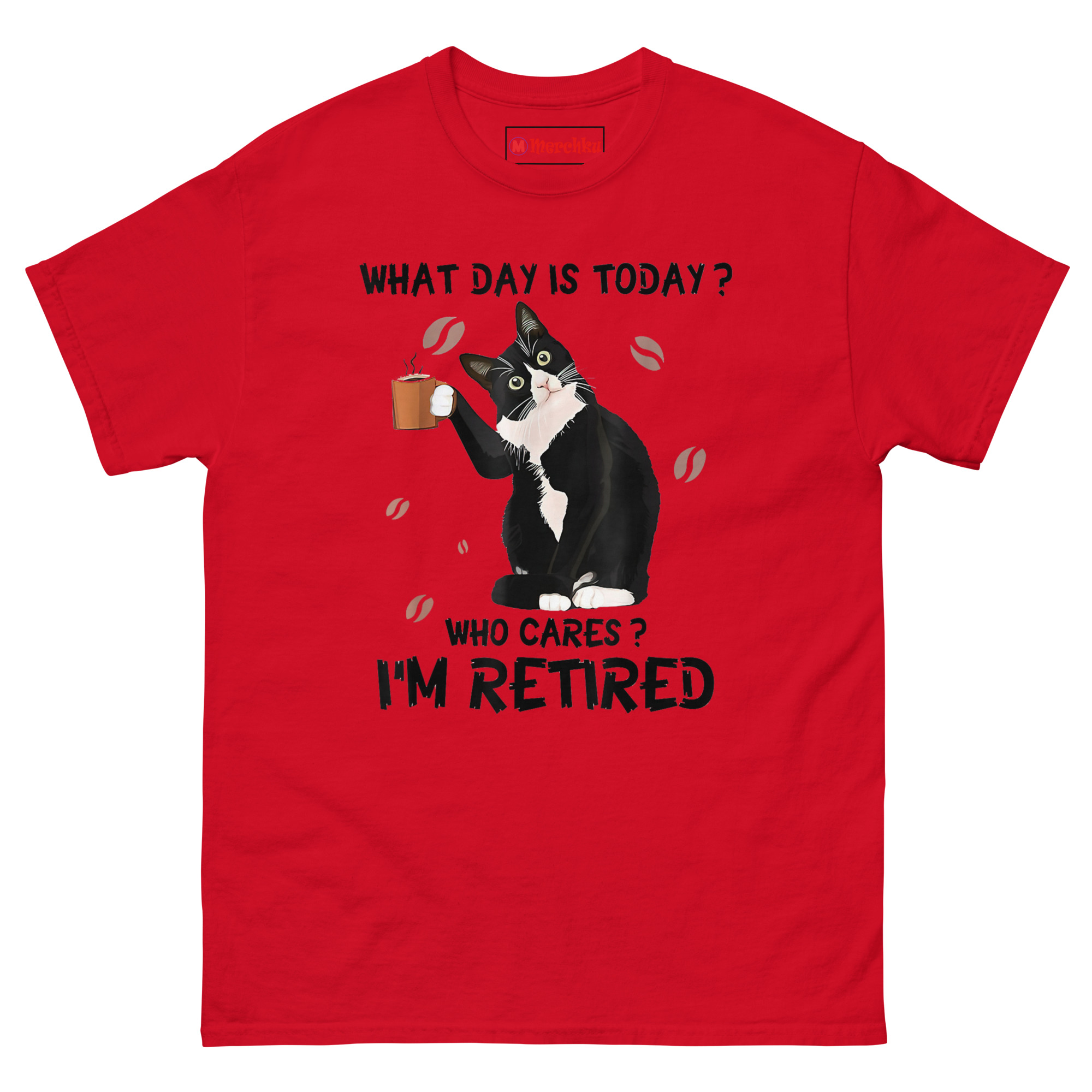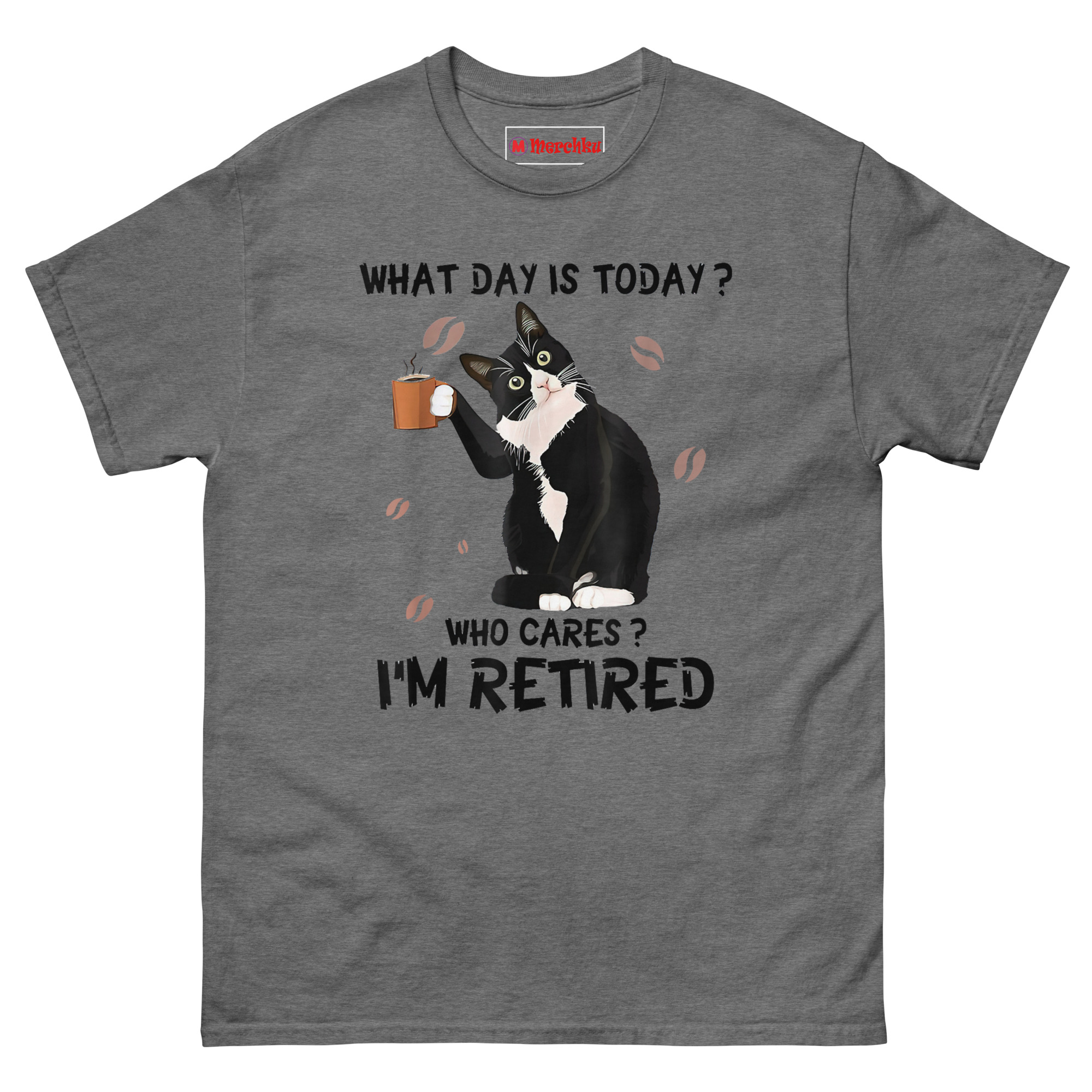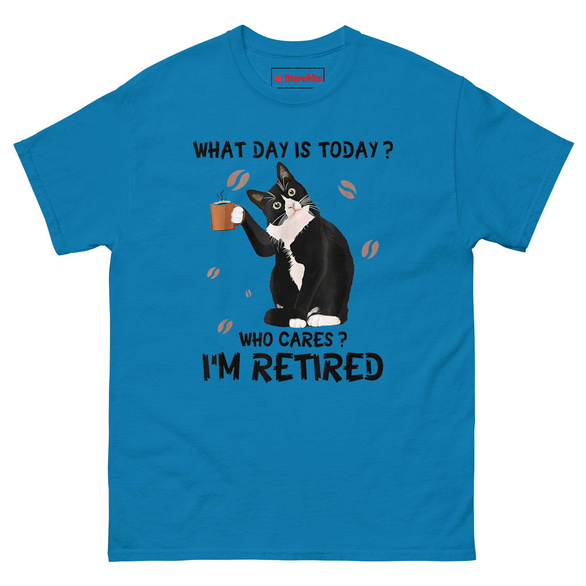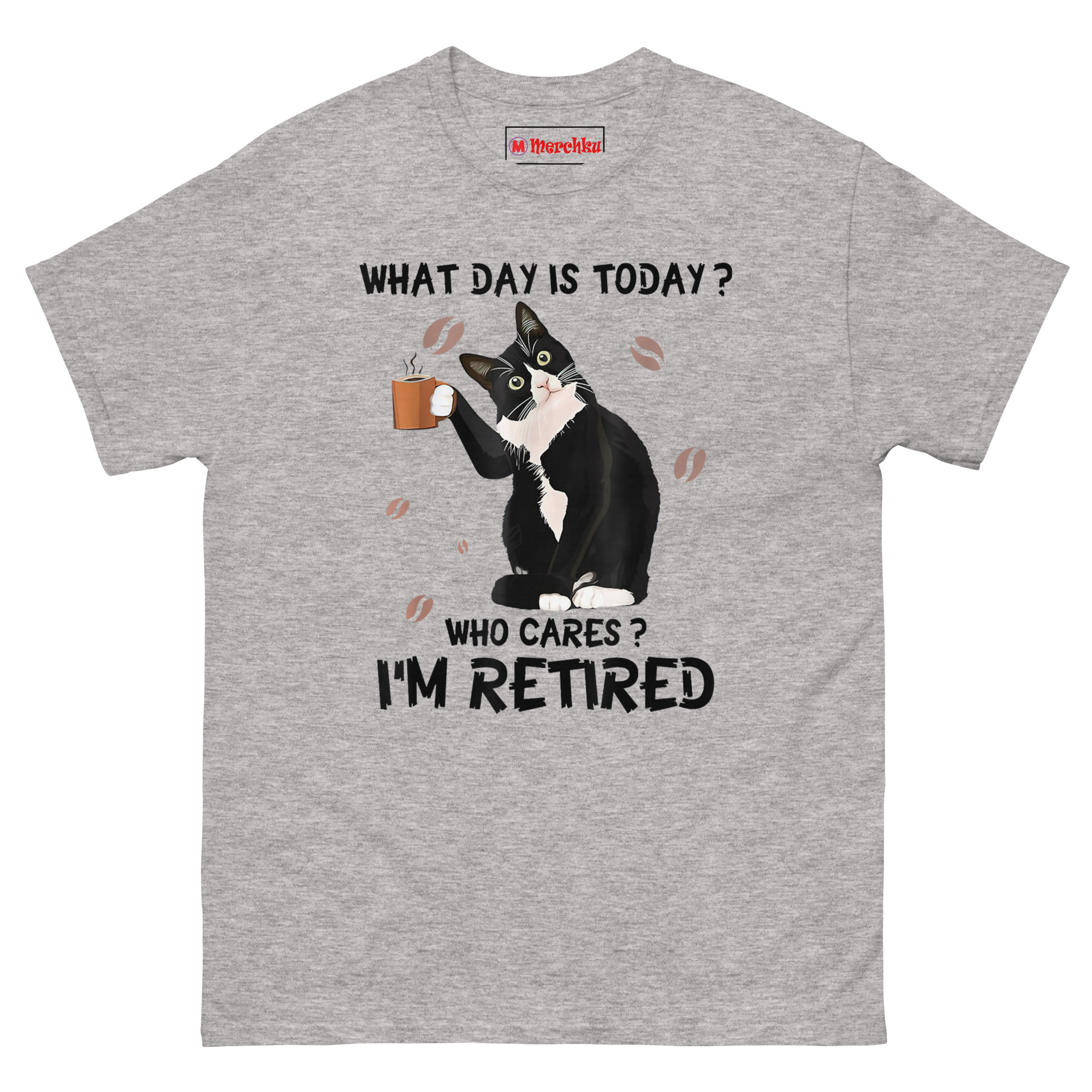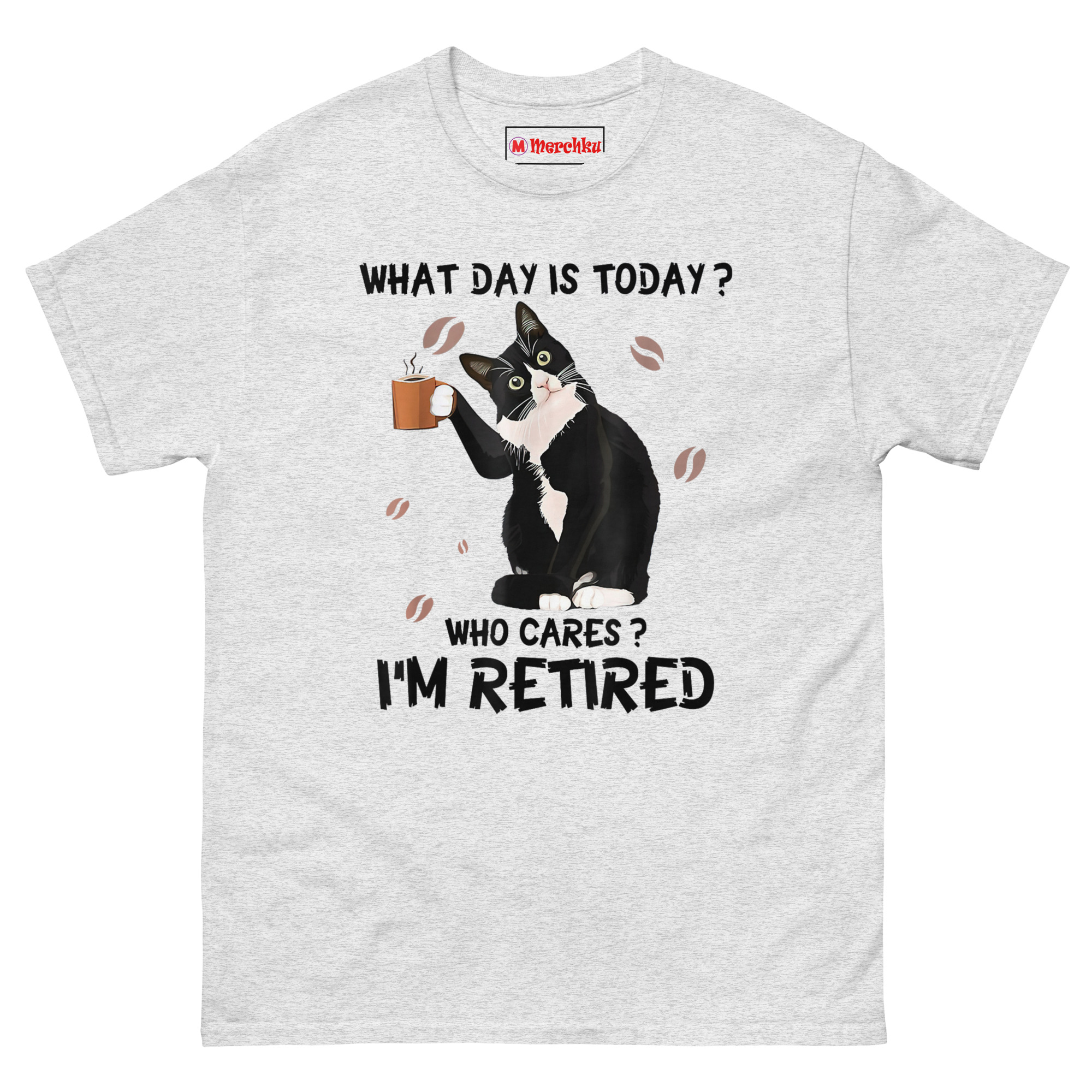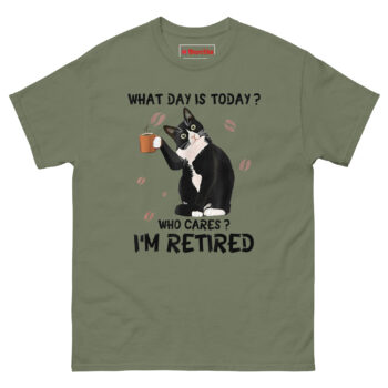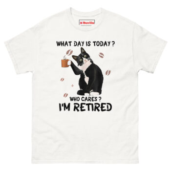 The What Day Is Today Who Cares I’m Retired Cat T Shirt features a sophisticated tuxedo cat holding a coffee mug, surrounded by floating beans, with text that sums up the retired life perfectly. “WHAT DAY IS TODAY?” arches above while “WHO CARES? I’M RETIRED” anchors the bottom. Designed for retirees, cat lovers, and anyone who dreams of escaping the calendar, this shirt celebrates the glorious freedom of having nowhere to be and no need to know what day it is.