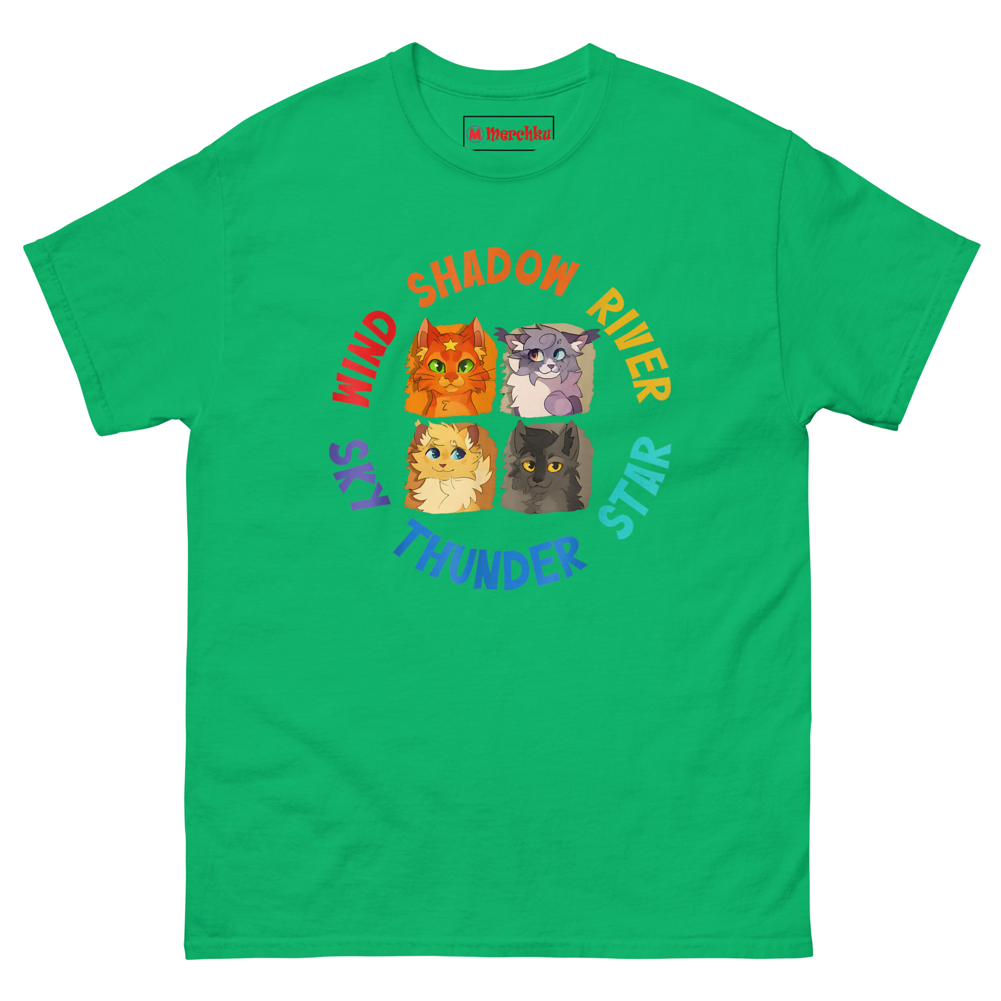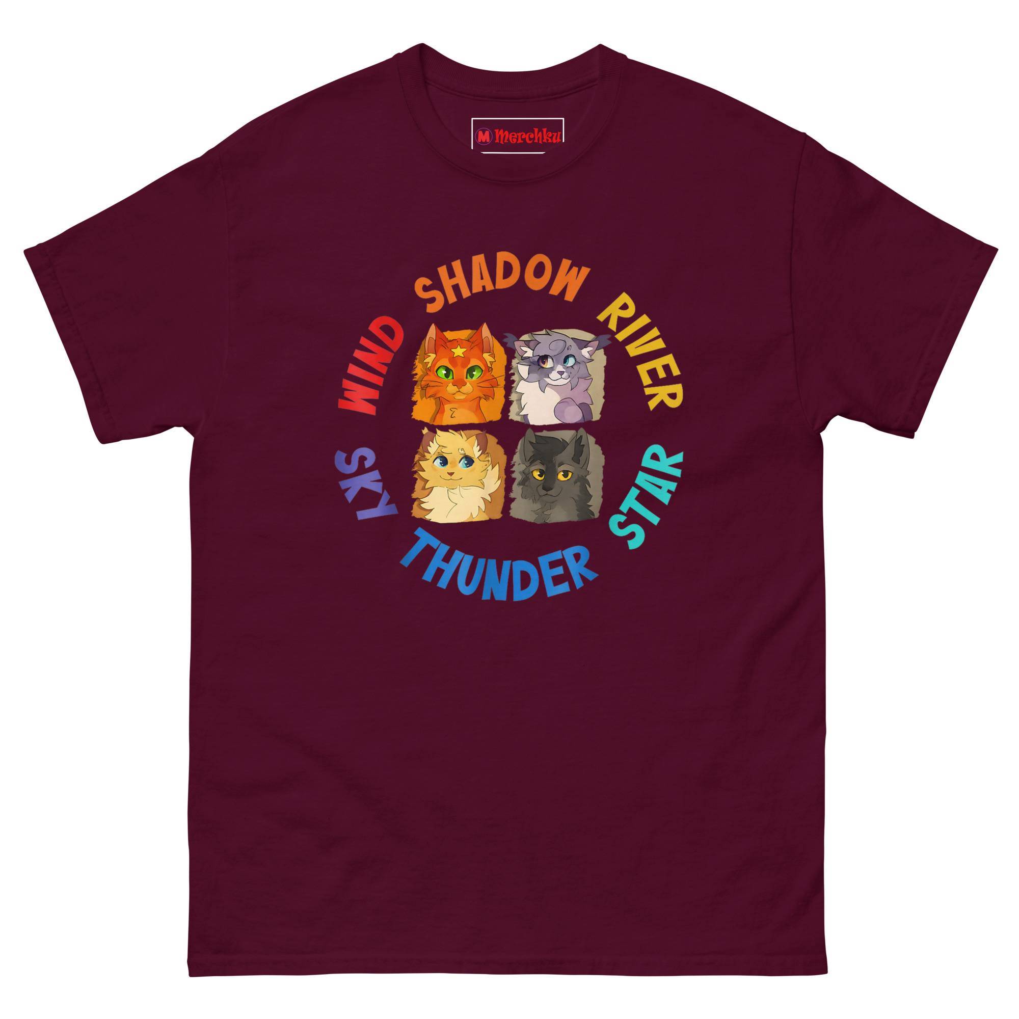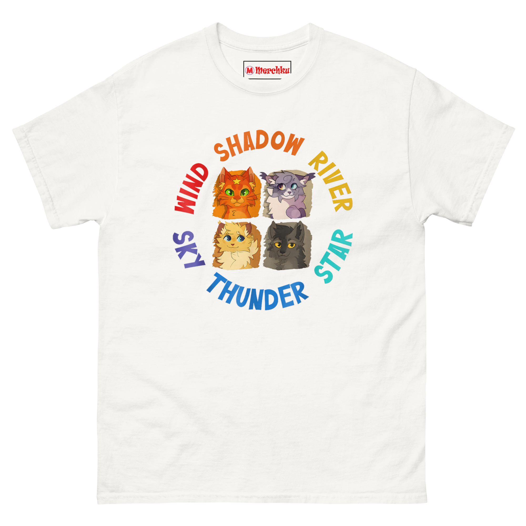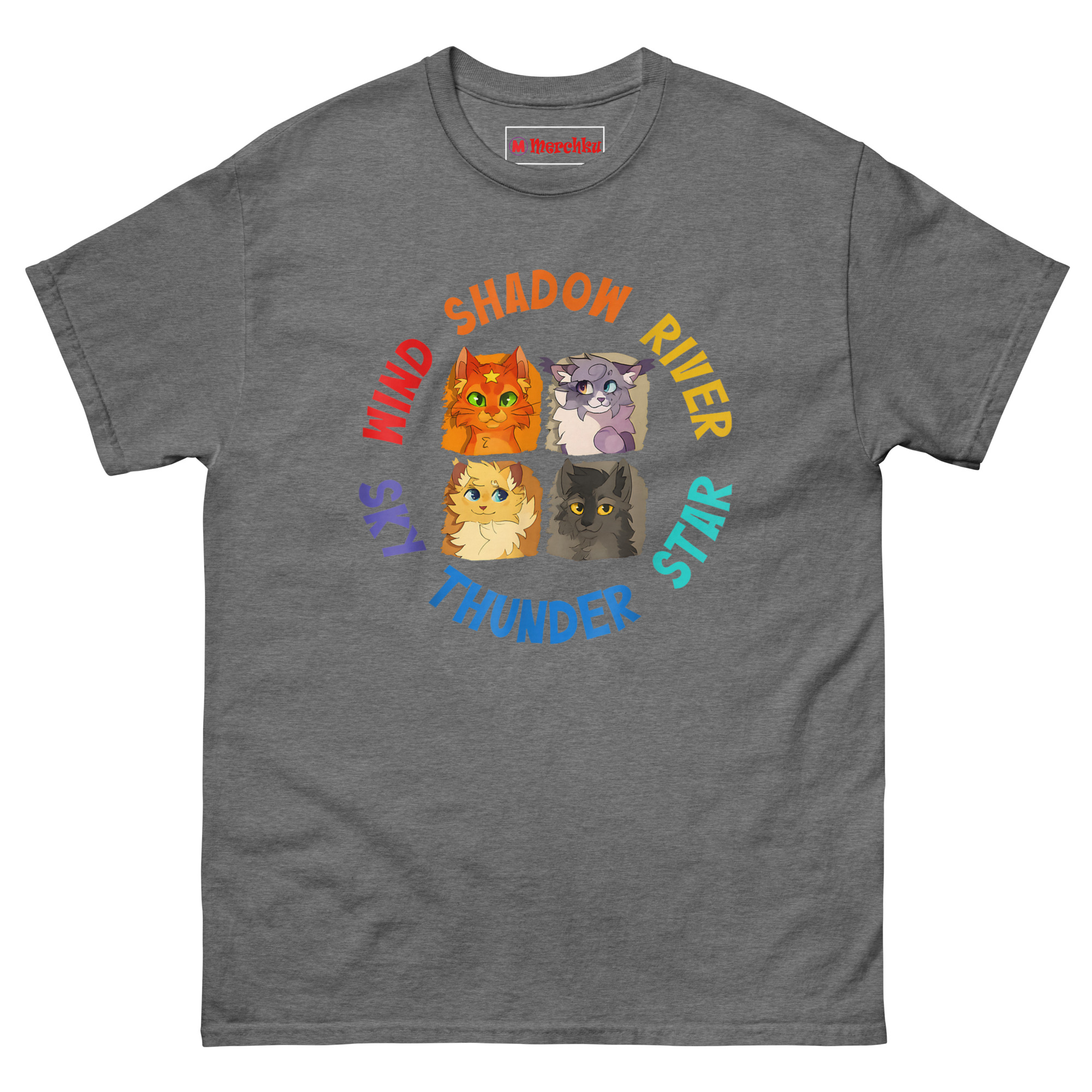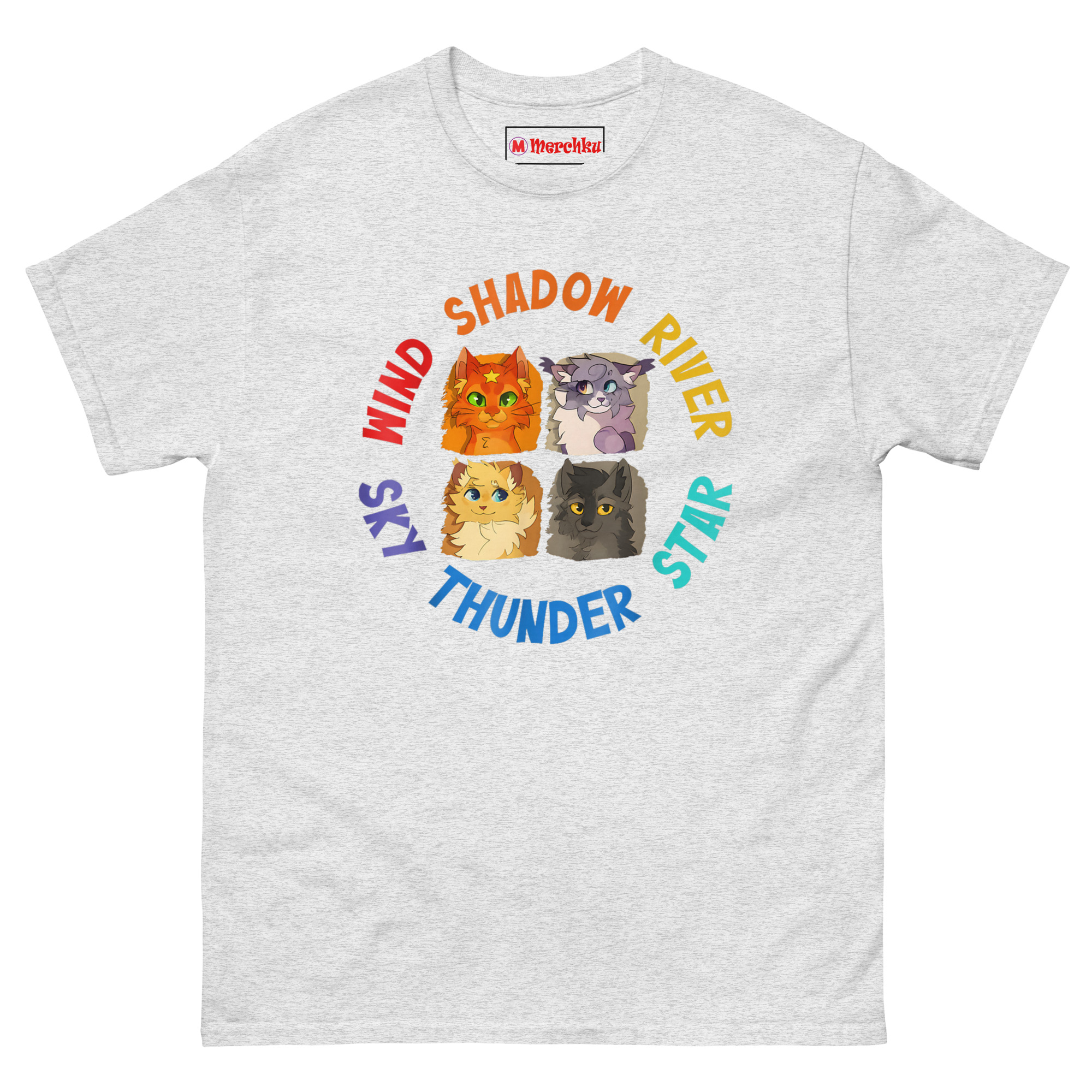 The Wind Shadow River Star Thunder Sky Cat T Shirt assembles four distinct feline warriors in a grid, each representing a different clan from the forest territories. A ginger tabby with a star marking, a silver-blue with lavender eyes, a cream-colored gentle face, and a dark-grey warrior with yellow eyes surround the circular arrangement of clan names. Designed for readers who grew up with these stories, this shirt honors the bravery, loyalty, and wild spirit of the cats who live by the warrior code.