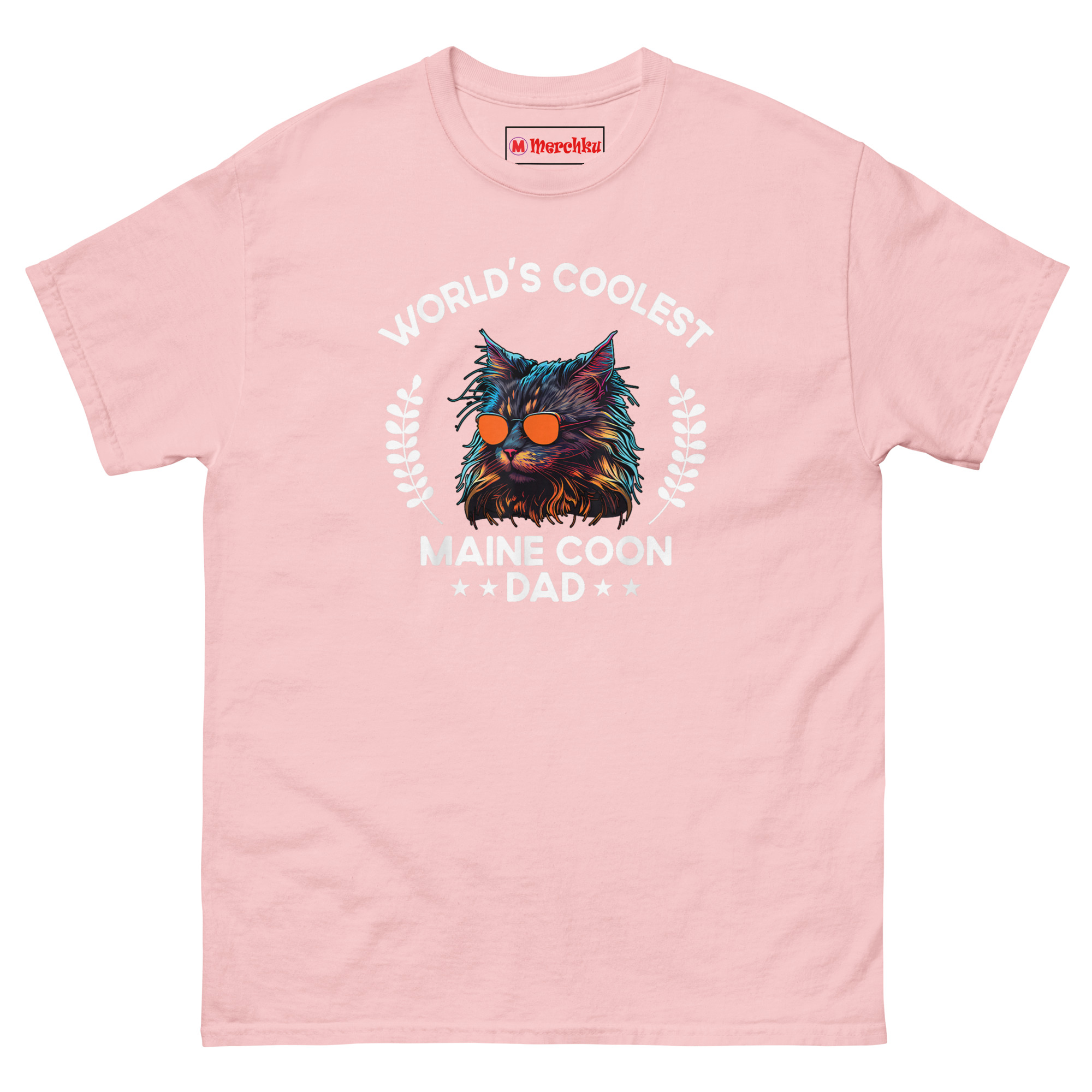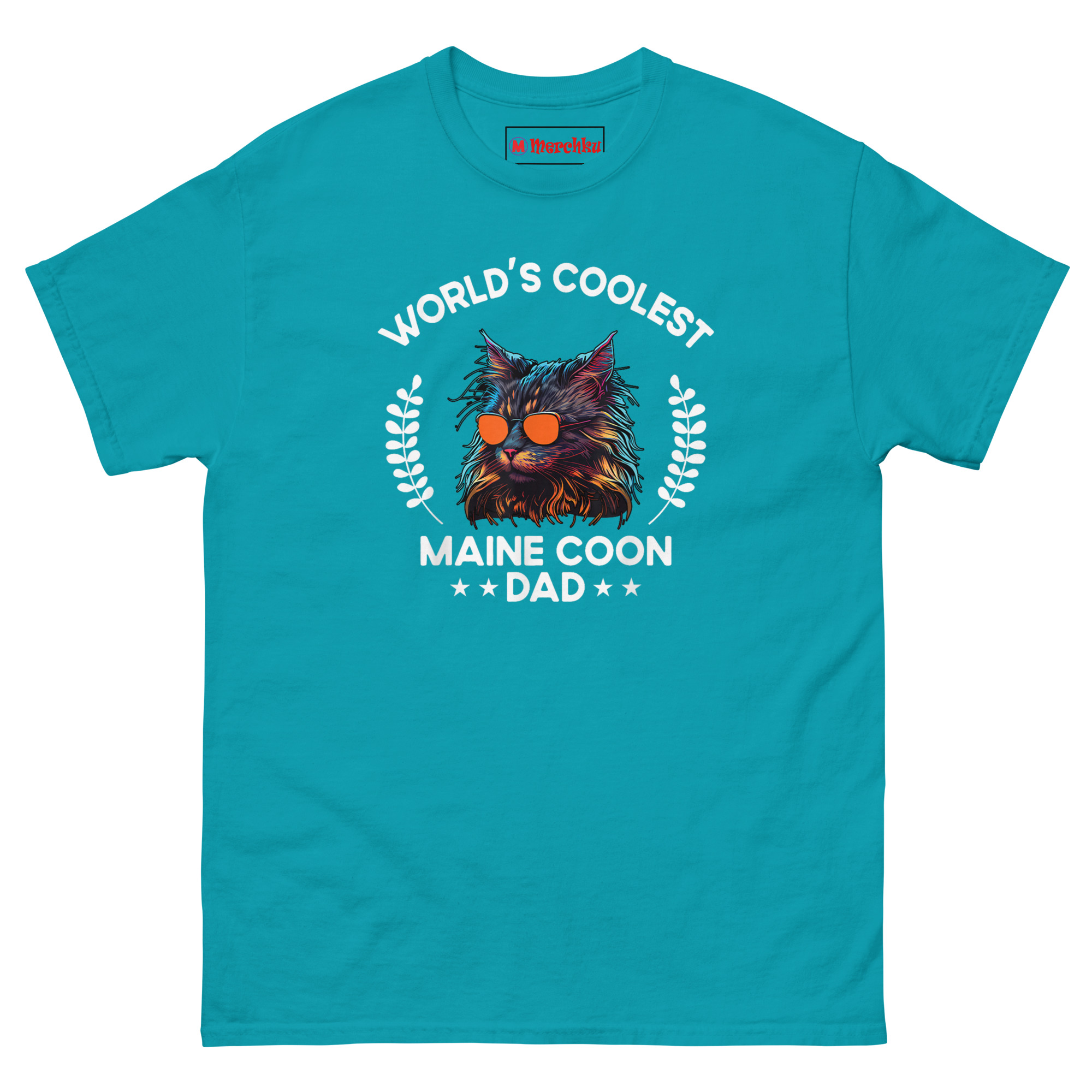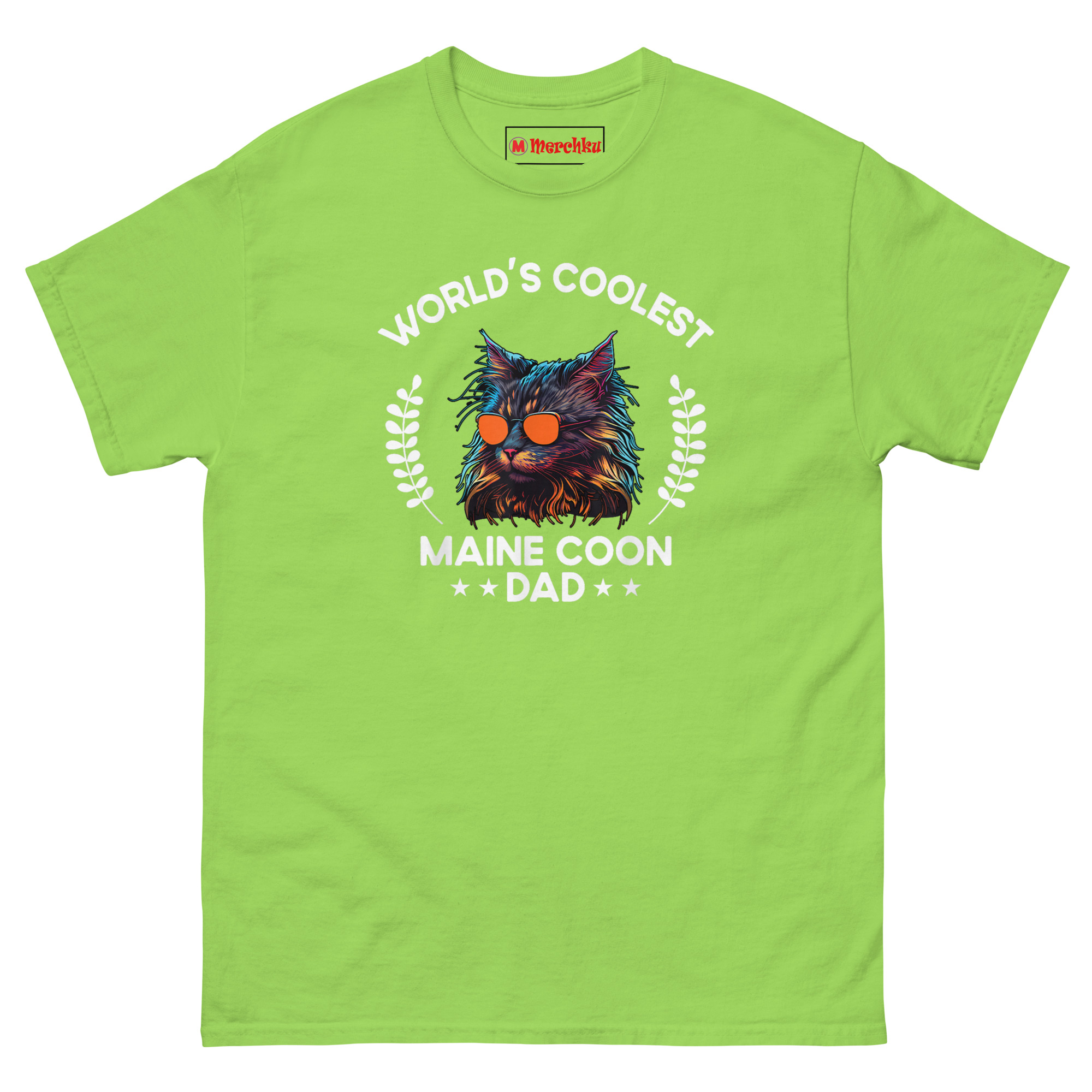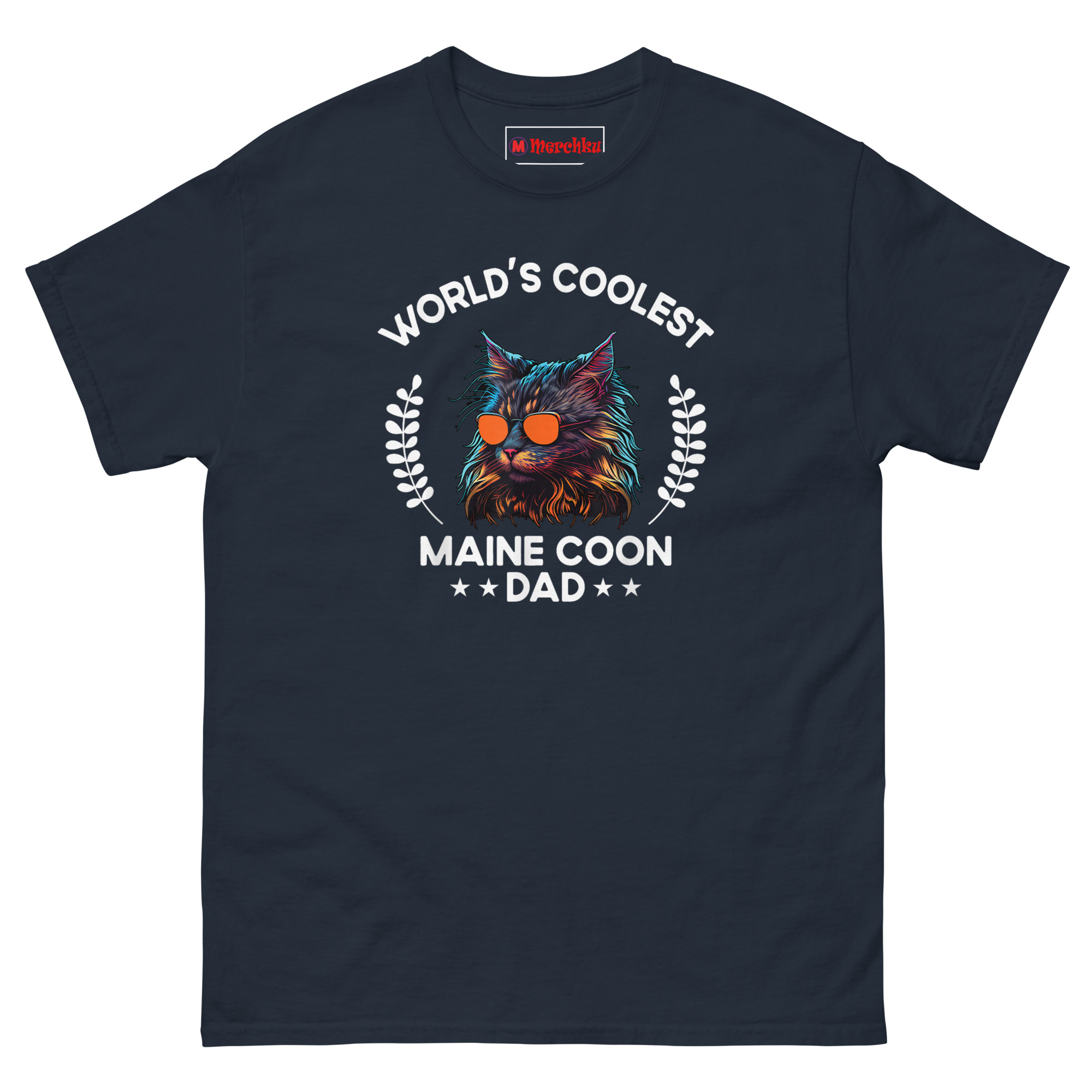 This idea started when we noticed how many men adore their Maine Coons but rarely find apparel that matches their aesthetic. The typical cat shirt leans feminine or cutesy. That leaves a gap. We wanted something a guy would actually want to wear, something that says “I love my cat” without sacrificing style. The synthwave lighting effect creates instant visual impact with neon blues, purples, and oranges. Those reflective aviators give the cat attitude. Laurel wreaths frame the portrait like a champion’s medal because that is what this dad deserves. Bold arched typography at the top sets up the declaration, while the bottom anchors it with “MAINE COON ★★ DAD ★★.” It is giant cat breed merch that feels more like vintage concert apparel than pet merchandise. Any man wearing this communicates pride in his cat and confidence in himself.