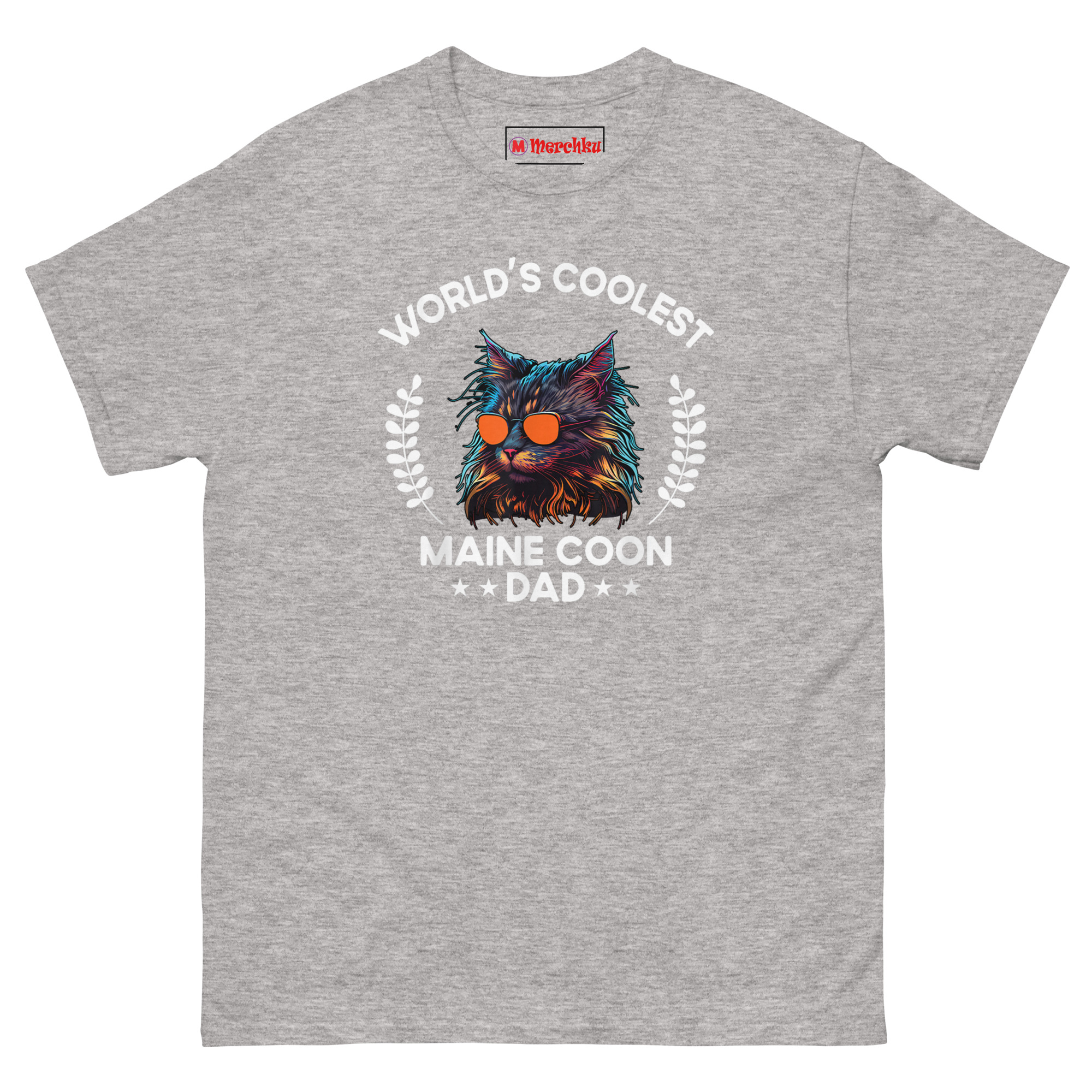 The World’s Coolest Maine Coon Dad T Shirt redefines cat ownership with serious swagger. This tee features a neon-synthwave Maine Coon wearing reflective orange sunglasses, flanked by Roman laurel wreaths and bold championship typography. Designed for men who want to celebrate their giant breed cat with undeniable cool.